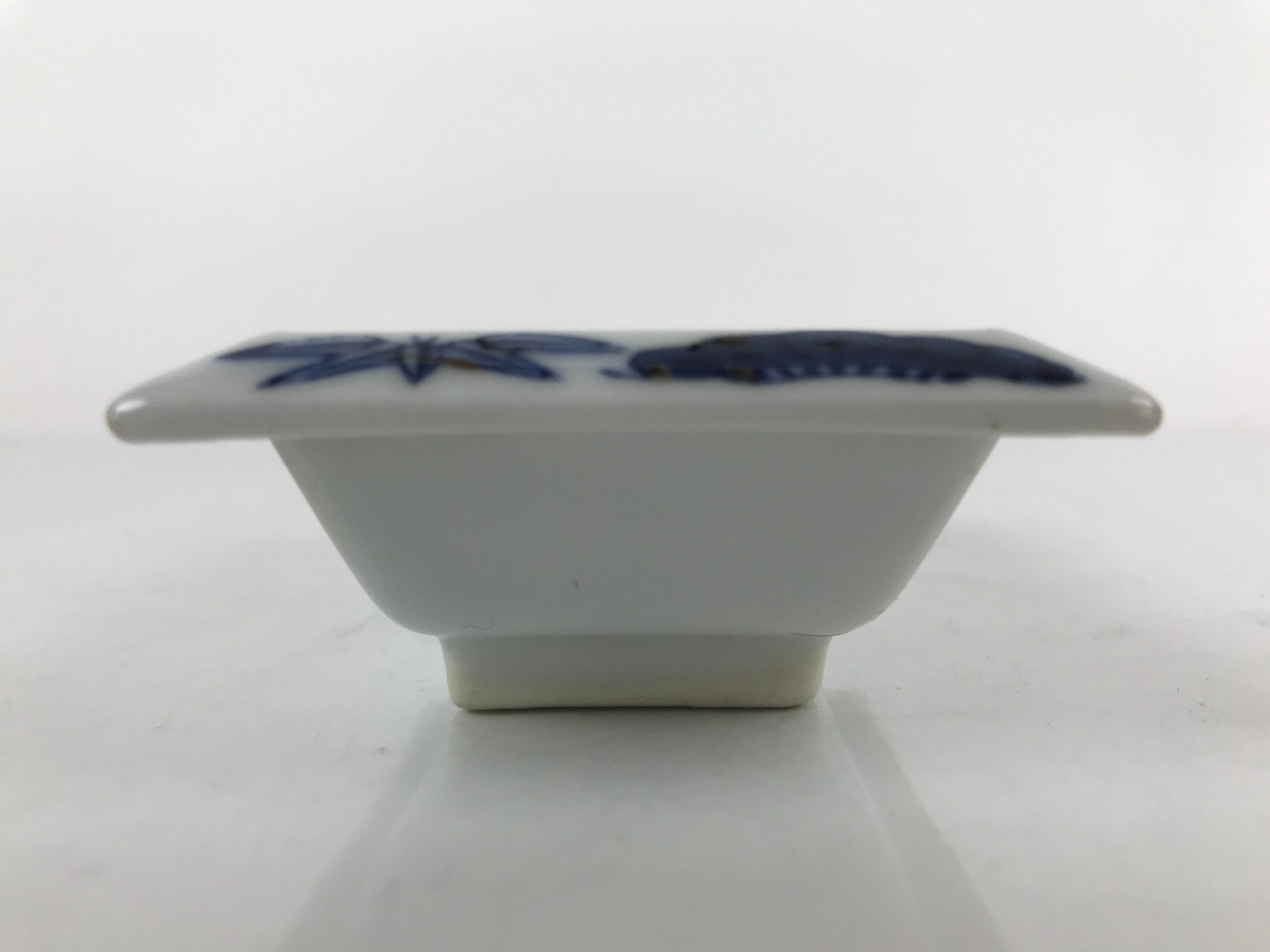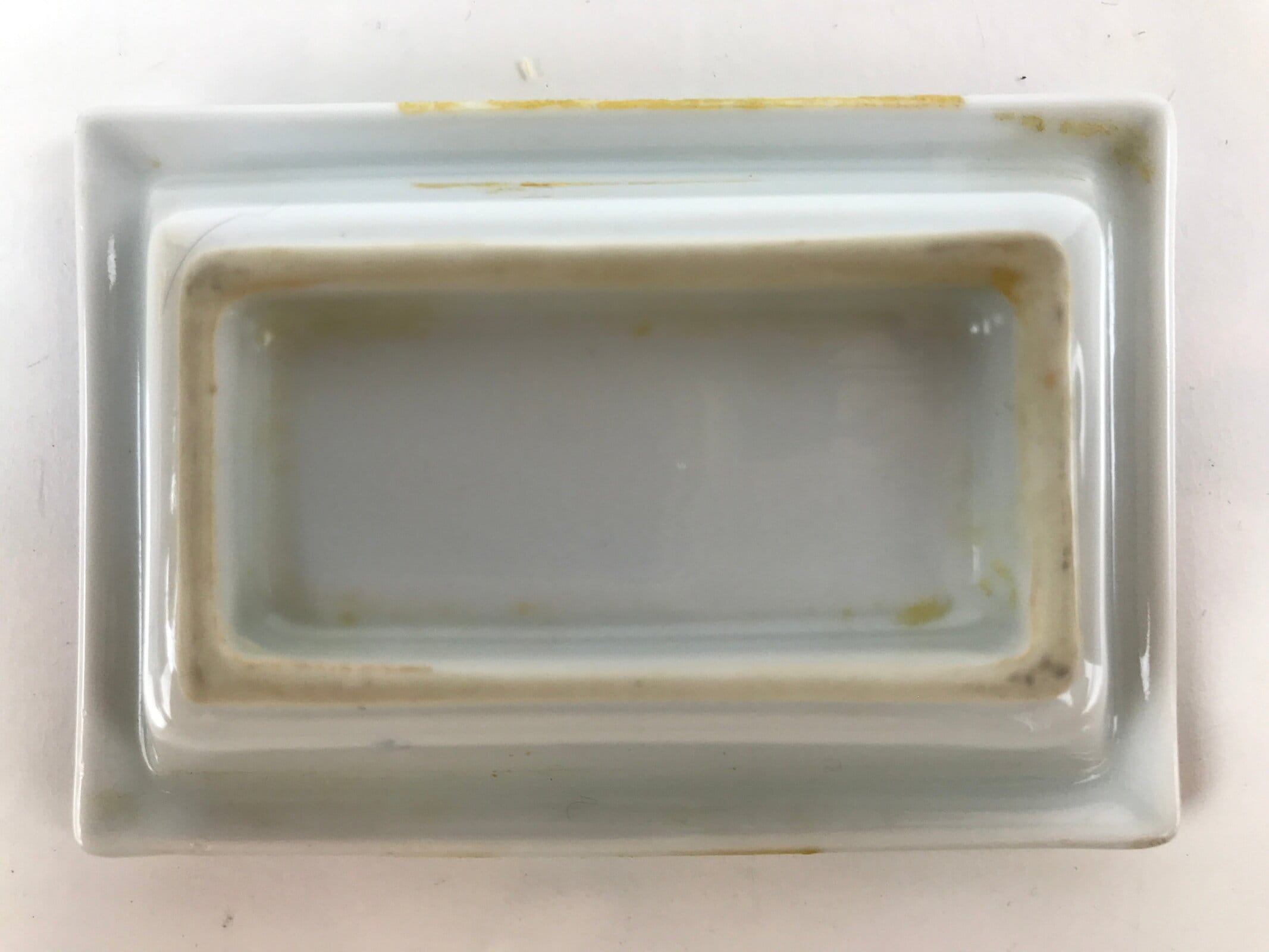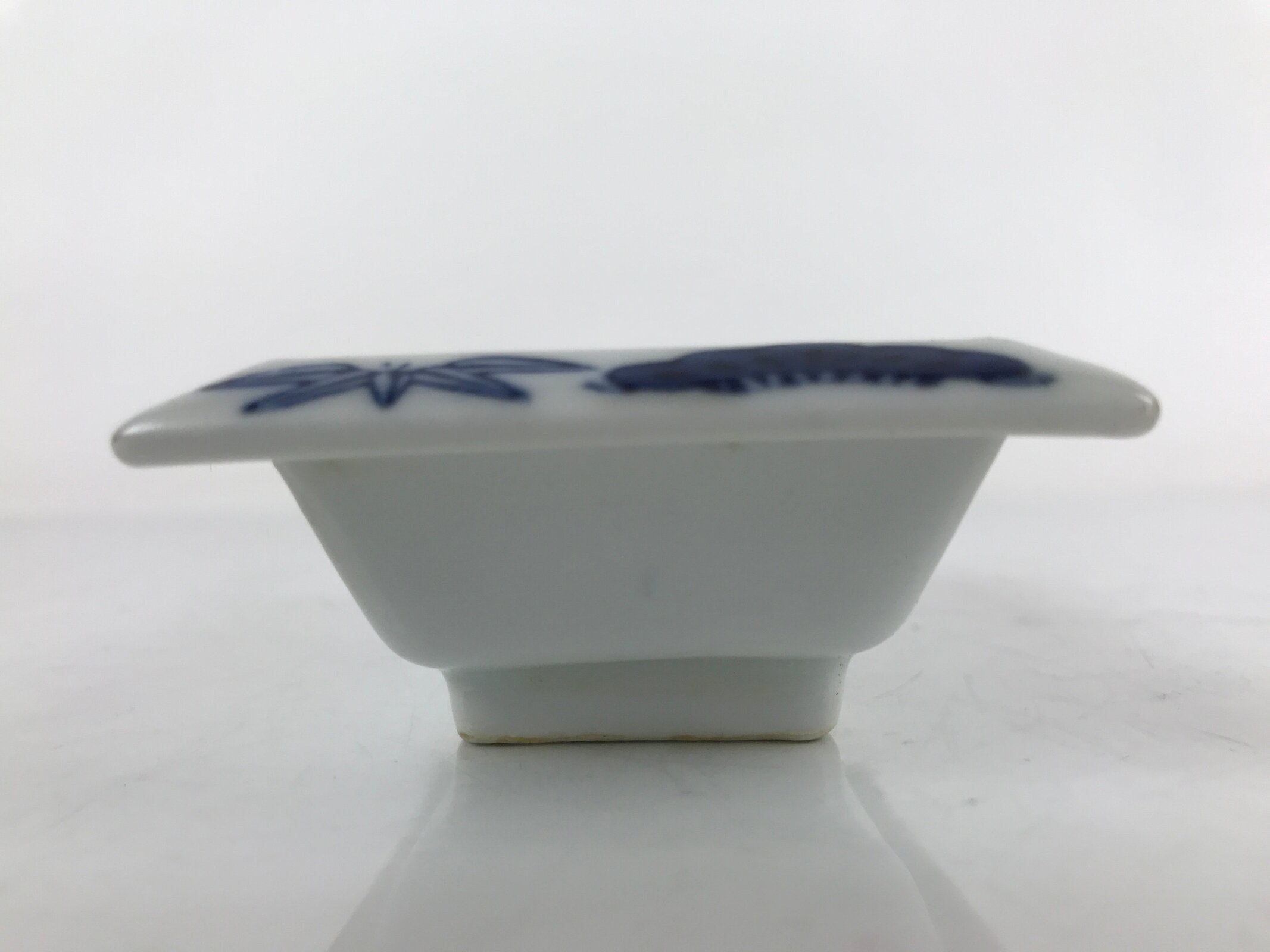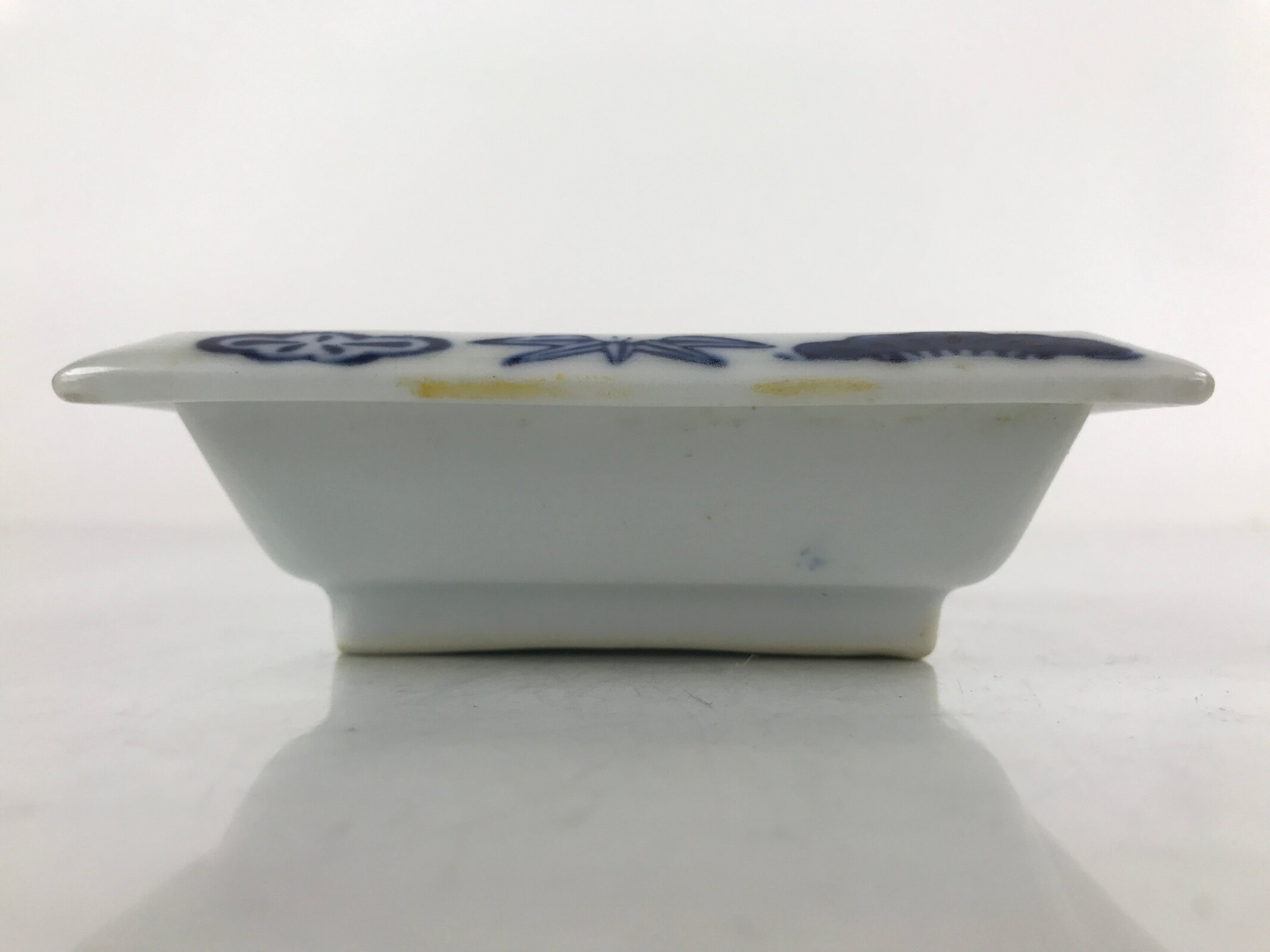 This is a vintage Japanese soy sauce dish, Seiji. It is a small, rectangular shallow bowl or plate meant to hold soy sauce as well as other seasonings for the purpose of dipping. It is mostly white with lovely blue designs depicting shochikubai (friends of winter: bamboo, pine, plum) around the edge. This is a common dish when eating sashimi or sushi, for example.
