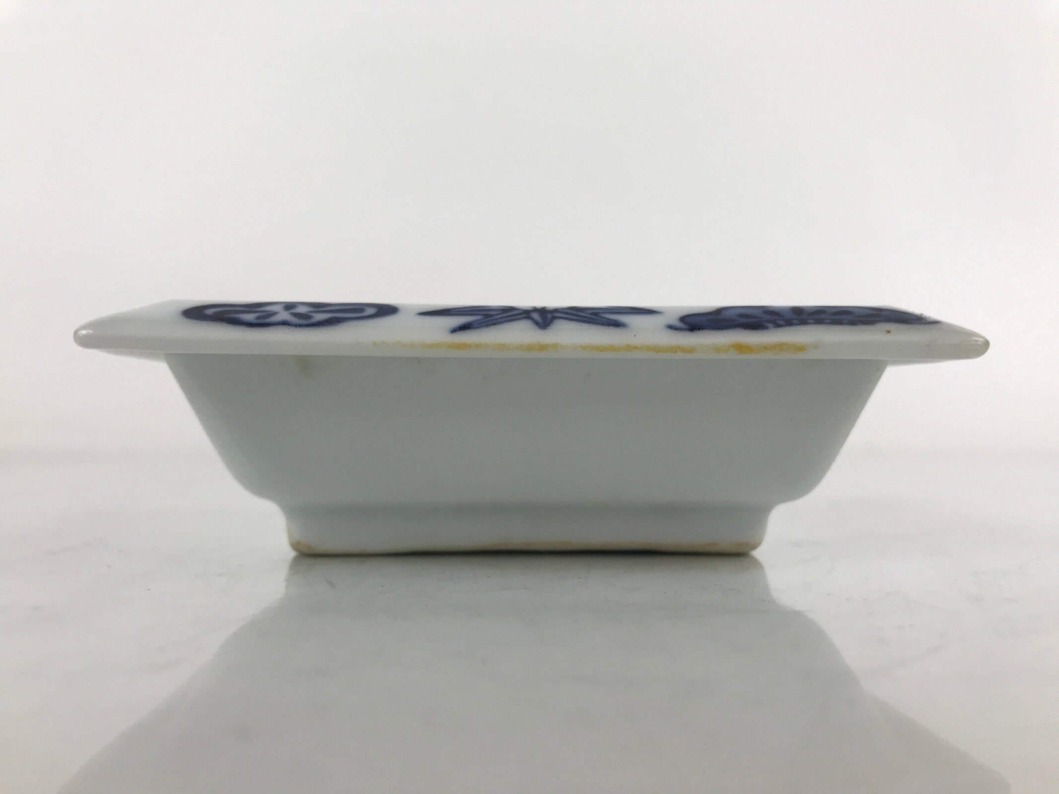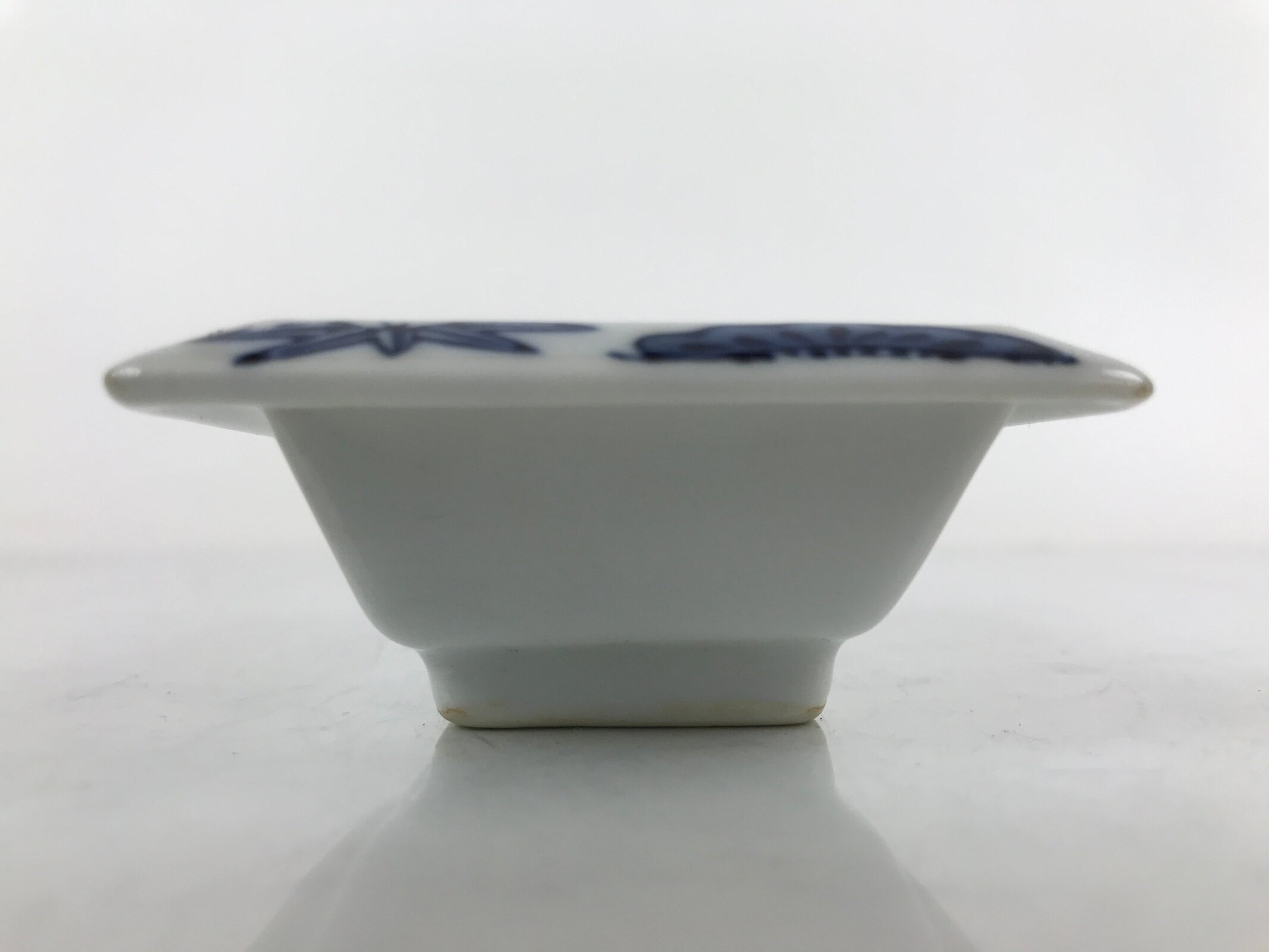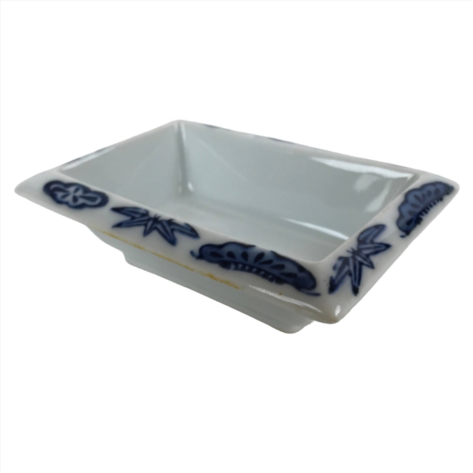 This is a vintage Japanese soy sauce dish, Seiji. It is a small, rectangular shallow bowl or plate meant to hold soy sauce as well as other seasonings for the purpose of dipping. It is mostly white with lovely blue designs depicting shochikubai (friends of winter: bamboo, pine, plum) around the edge. This is a common dish when eating sashimi or sushi, for example.
