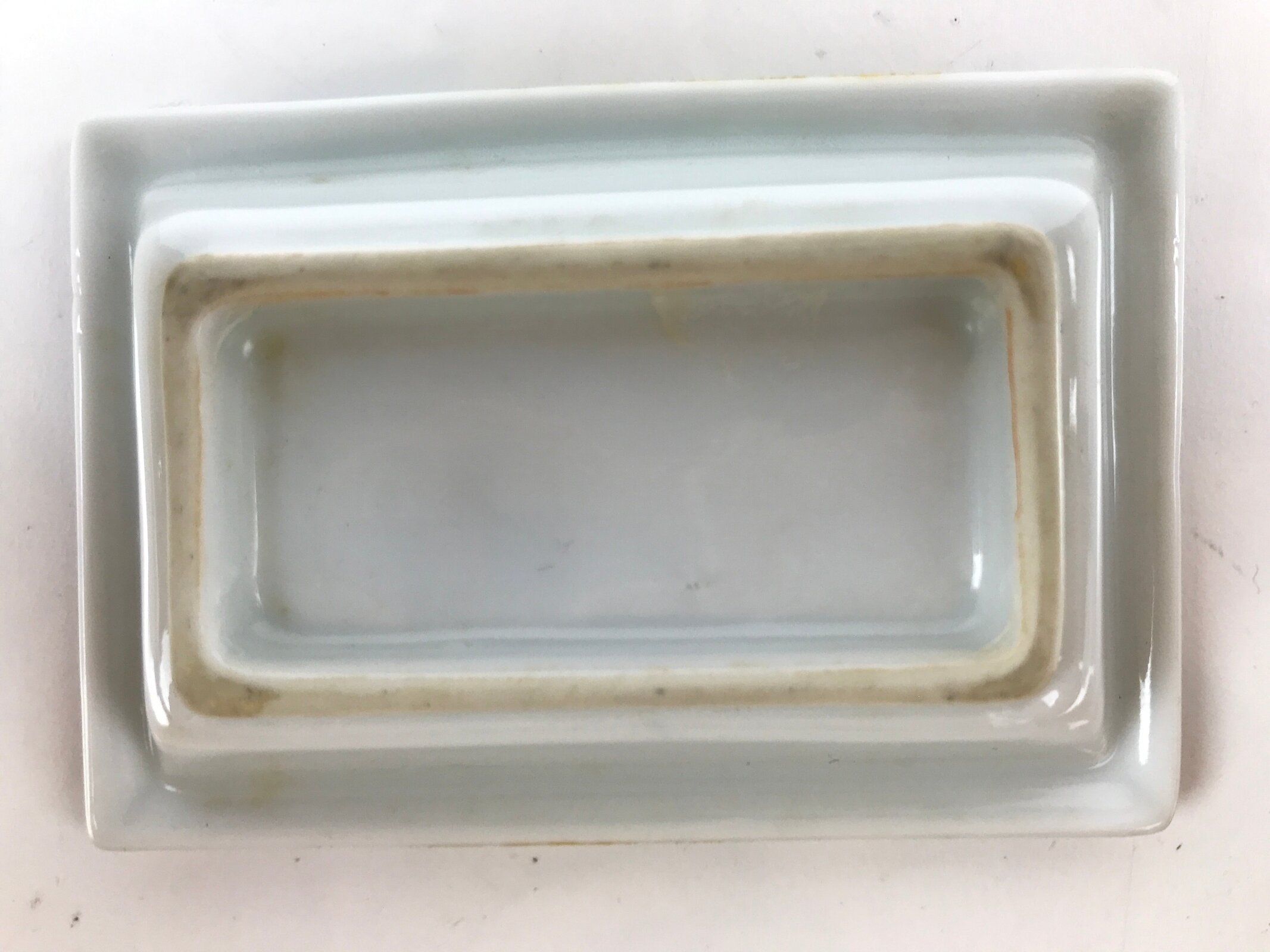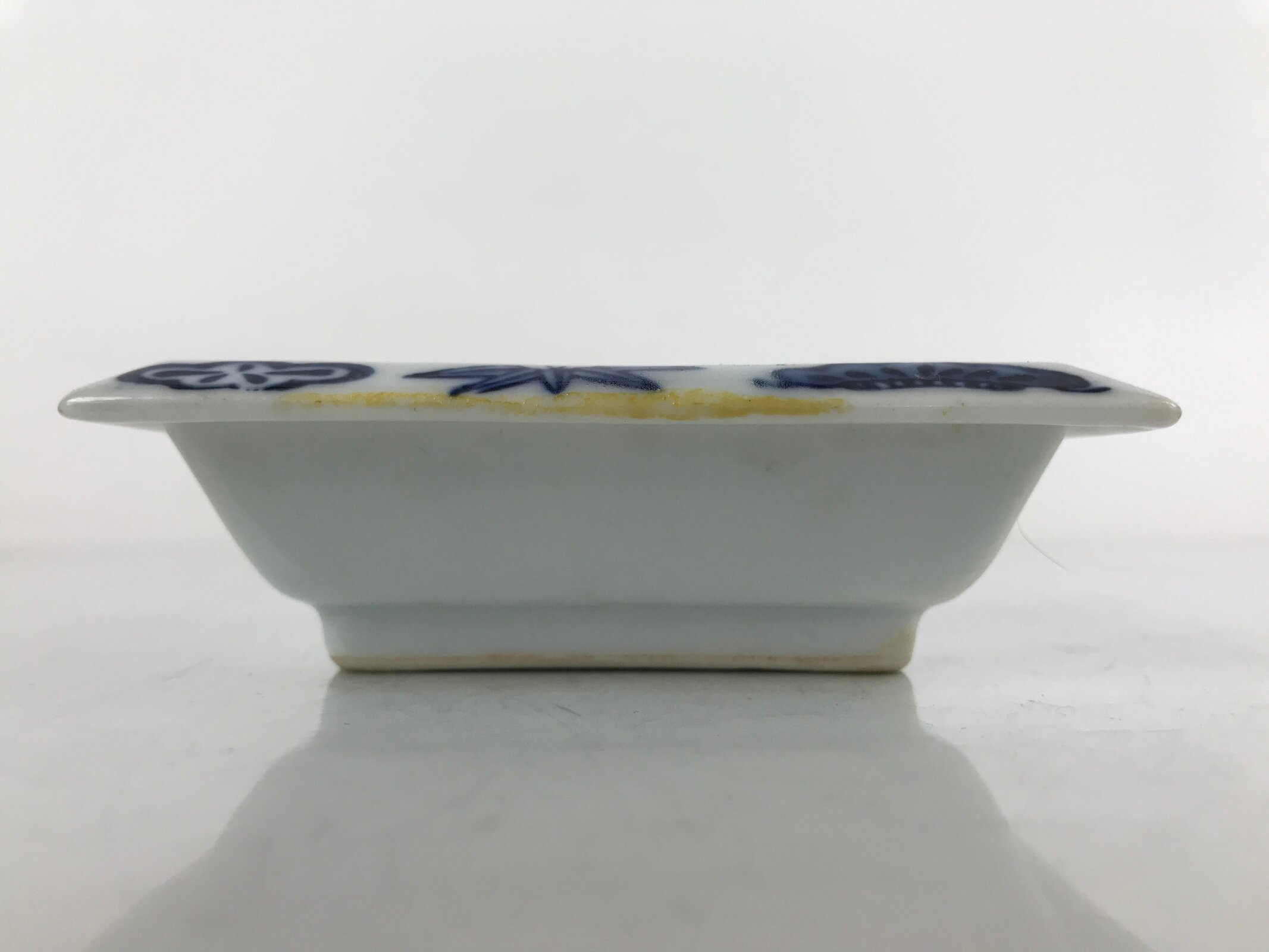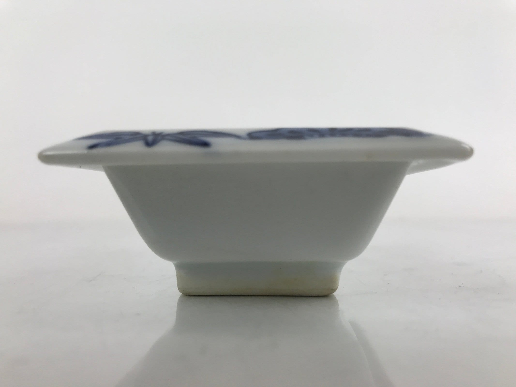 This is a vintage Japanese soy sauce dish, Seiji. It is a small, rectangular shallow bowl or plate meant to hold soy sauce as well as other seasonings for the purpose of dipping. It is mostly white with lovely blue designs depicting shochikubai (friends of winter: bamboo, pine, plum) around the edge. This is a common dish when eating sashimi or sushi, for example.