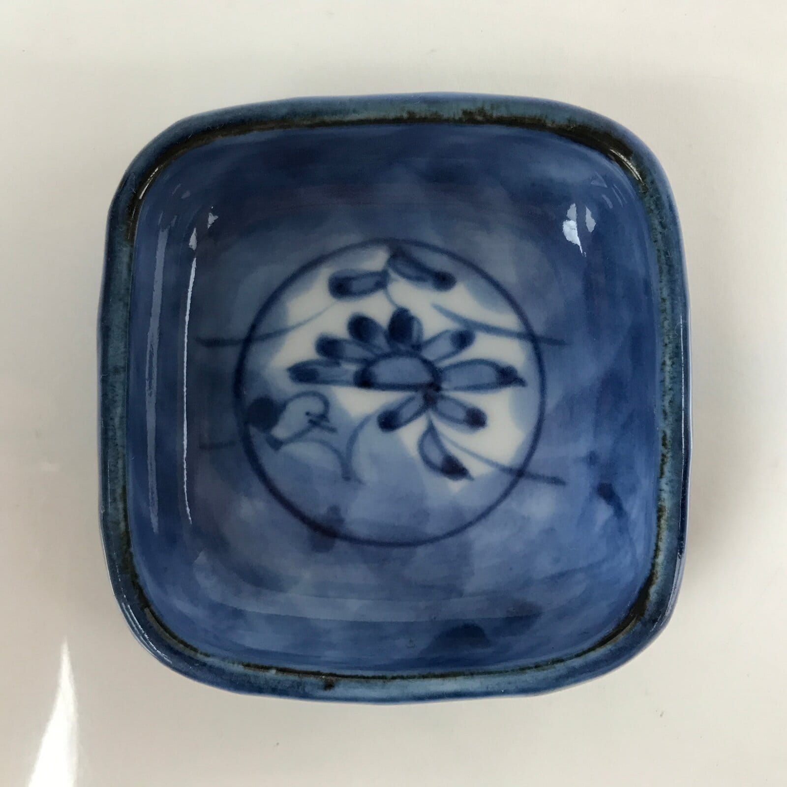 This is a vintage Japanese soy sauce dish, Seiji. It is a small, rounded square shallow bowl or plate meant to hold soy sauce as well as other seasonings for the purpose of dipping. Featuring a simple floral design, this white and blue little bowl can also hold other food items such as pickles. This is a common dish when eating sashimi, for example.
