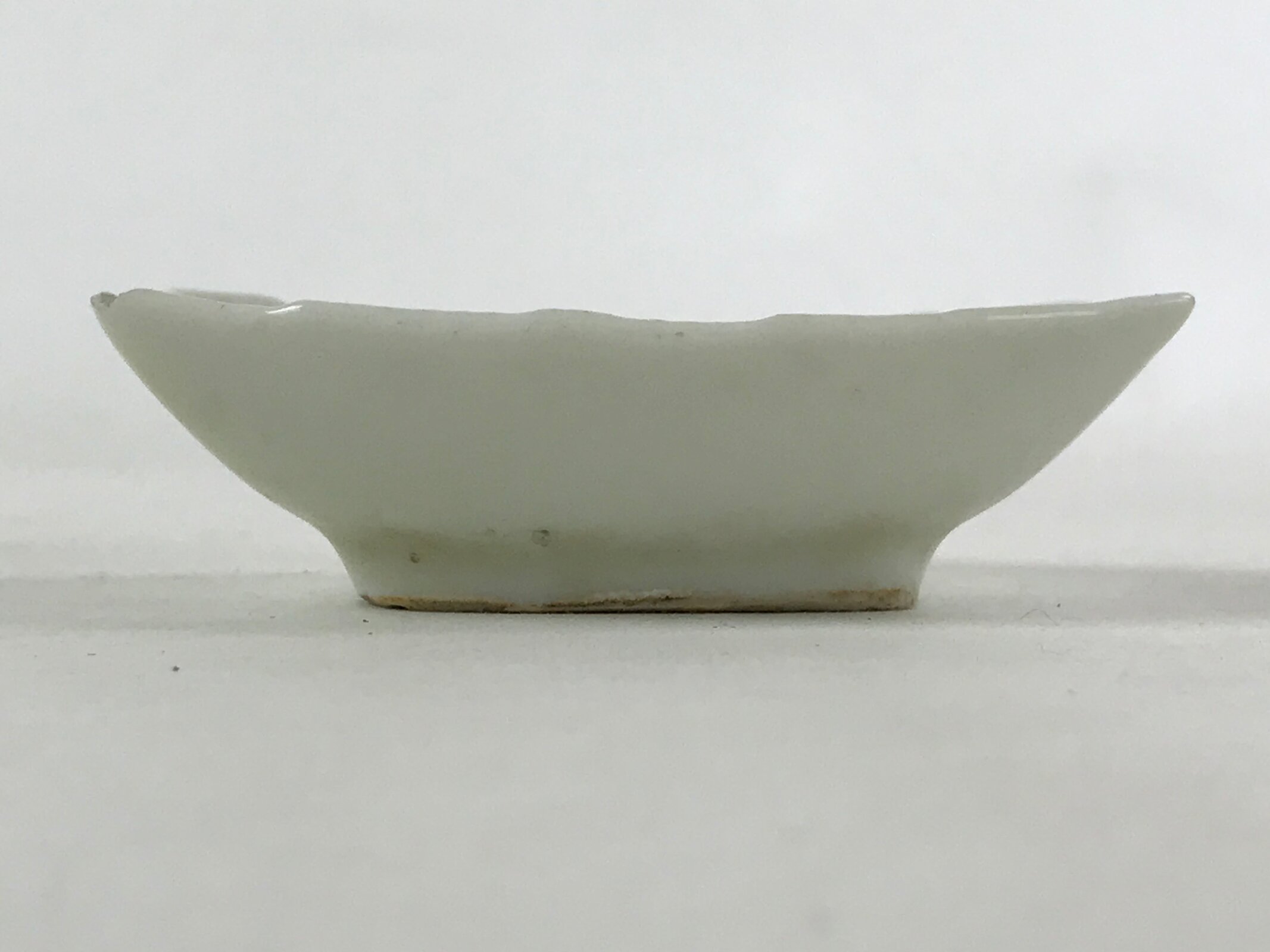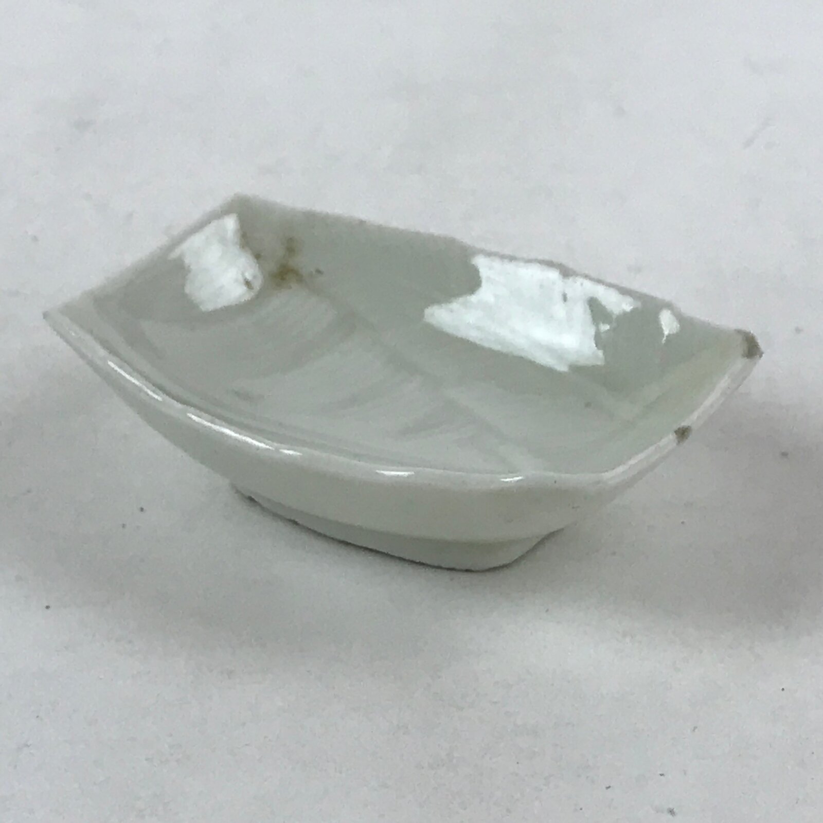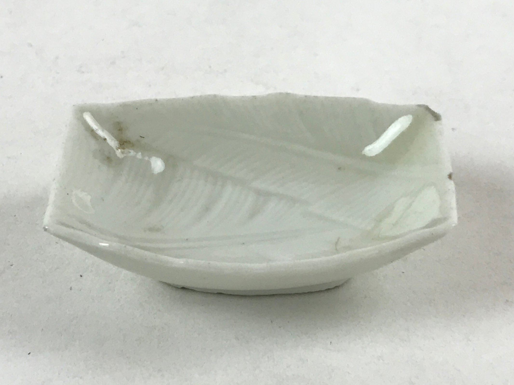 This is a vintage Japanese soy sauce dish, Seiji. It is a small, rounded rectangular shallow bowl or plate meant to hold soy sauce as well as other seasonings for the purpose of dipping. Featuring a tropical leaf design, this white little bowl can also hold other food items such as pickles. This is a common dish when eating sashimi, for example.