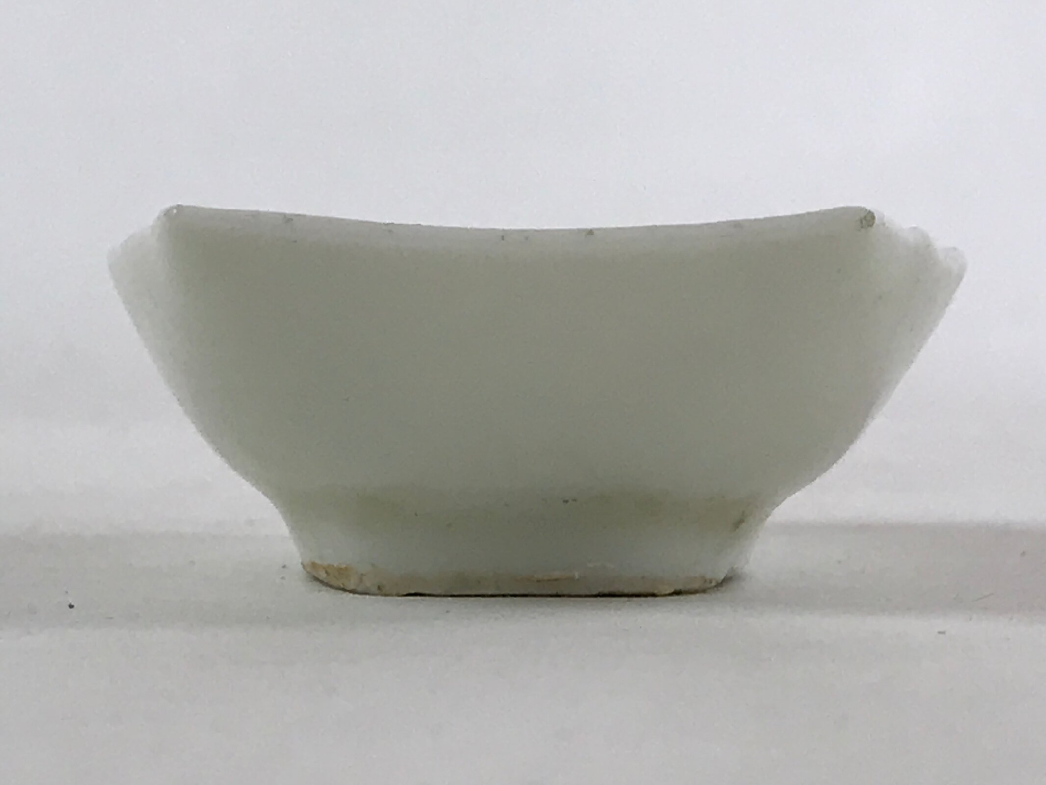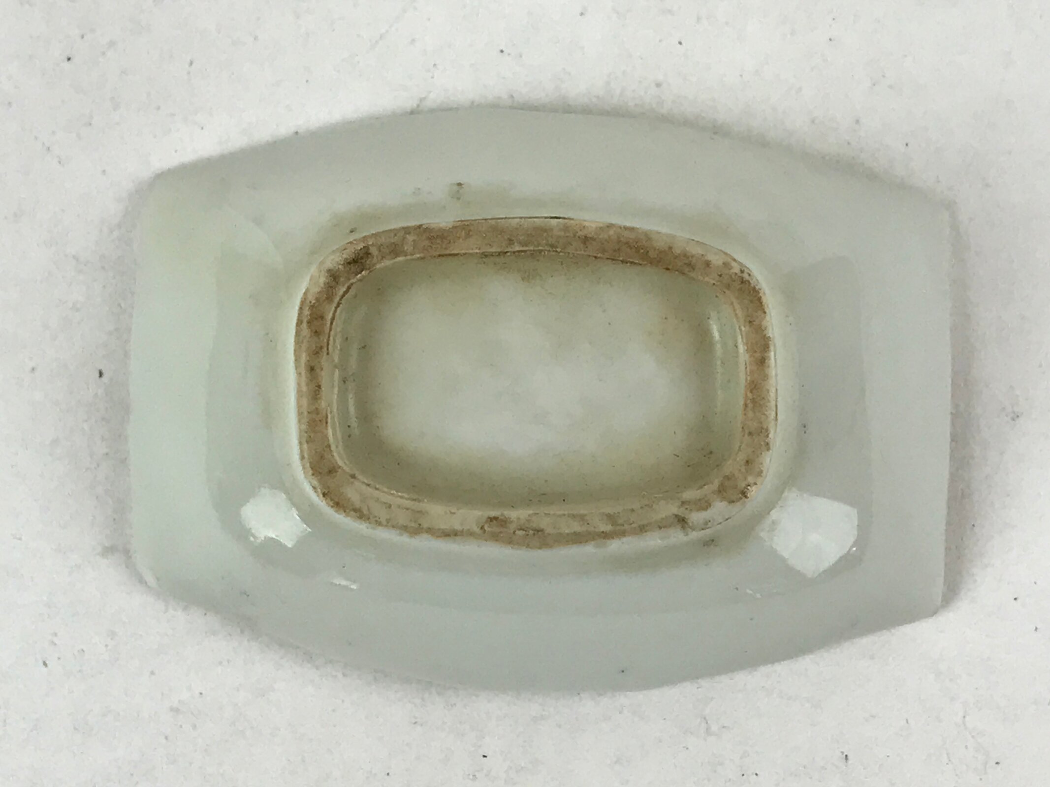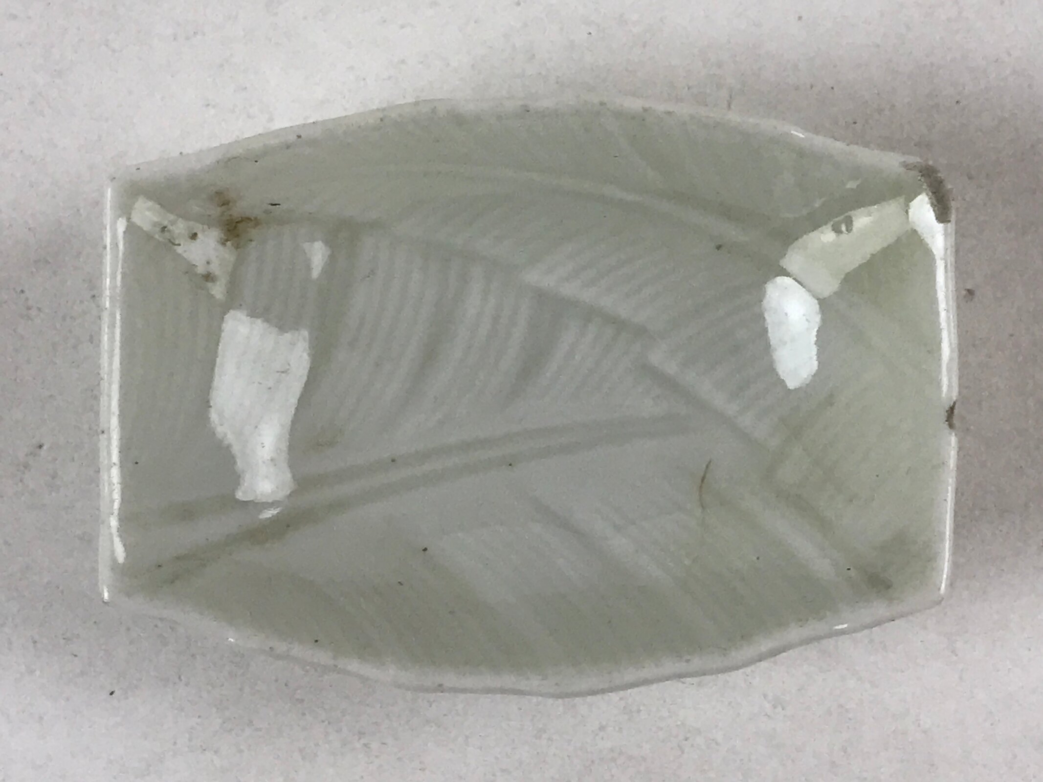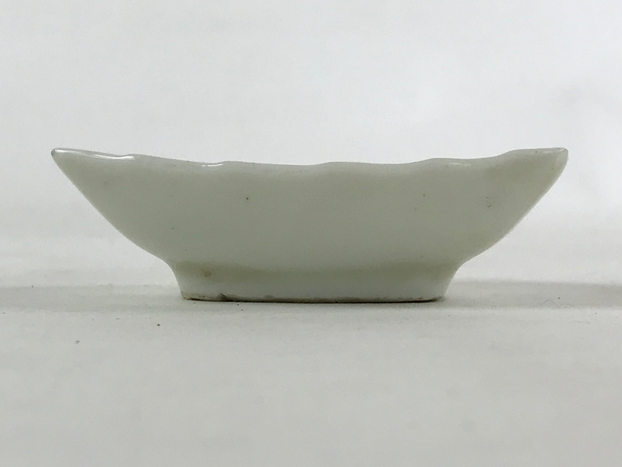 This is a vintage Japanese soy sauce dish, Seiji. It is a small, rounded rectangular shallow bowl or plate meant to hold soy sauce as well as other seasonings for the purpose of dipping. Featuring a tropical leaf design, this white little bowl can also hold other food items such as pickles. This is a common dish when eating sashimi, for example.