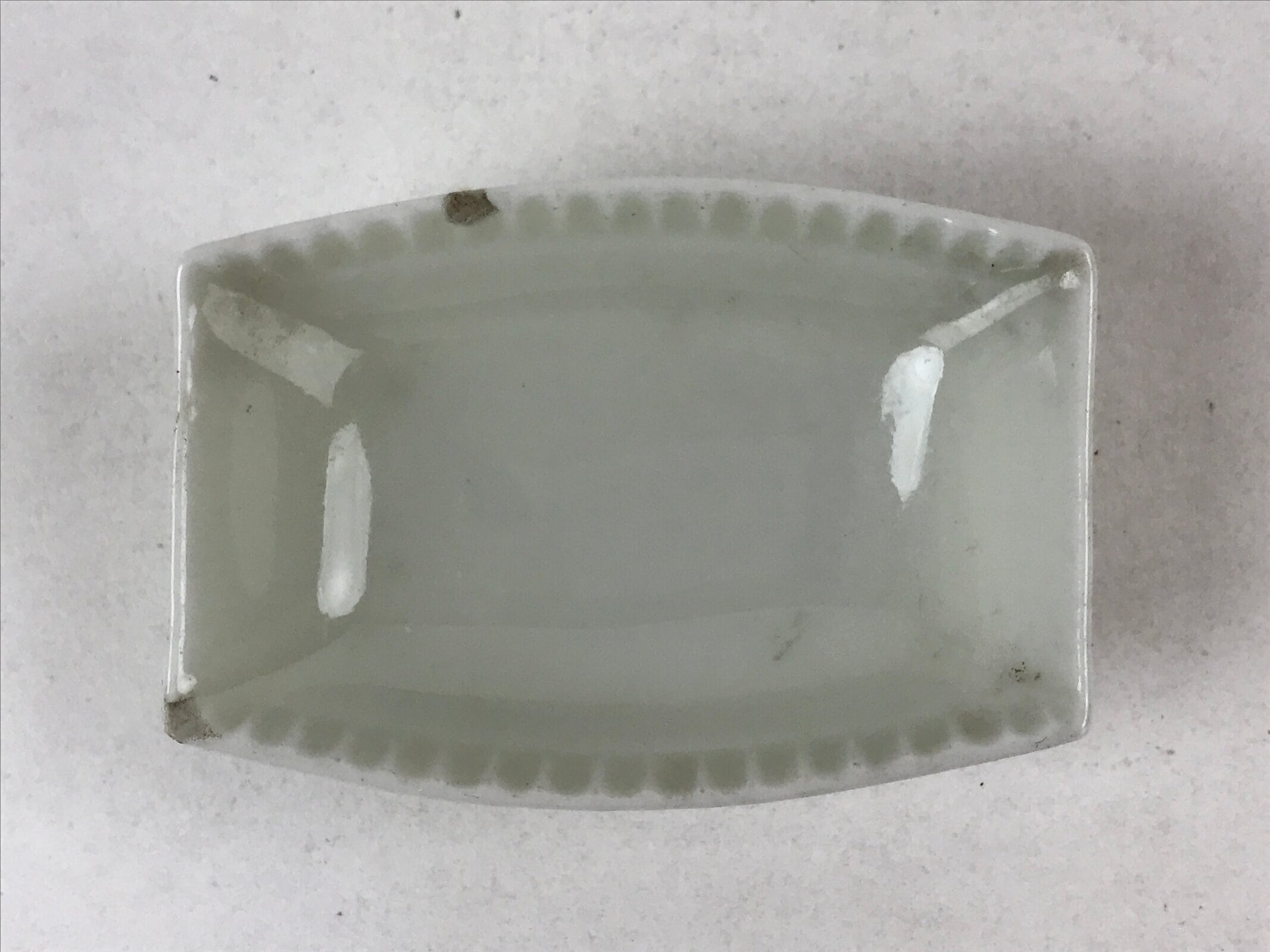 This is a vintage Japanese soy sauce dish, Seiji. It is a small, rounded rectangular shallow bowl or plate meant to hold soy sauce as well as other seasonings for the purpose of dipping. With a simple lined border on to sides, this little bowl can also hold other food items such as pickles. This is a common item when eating sashimi, for example.