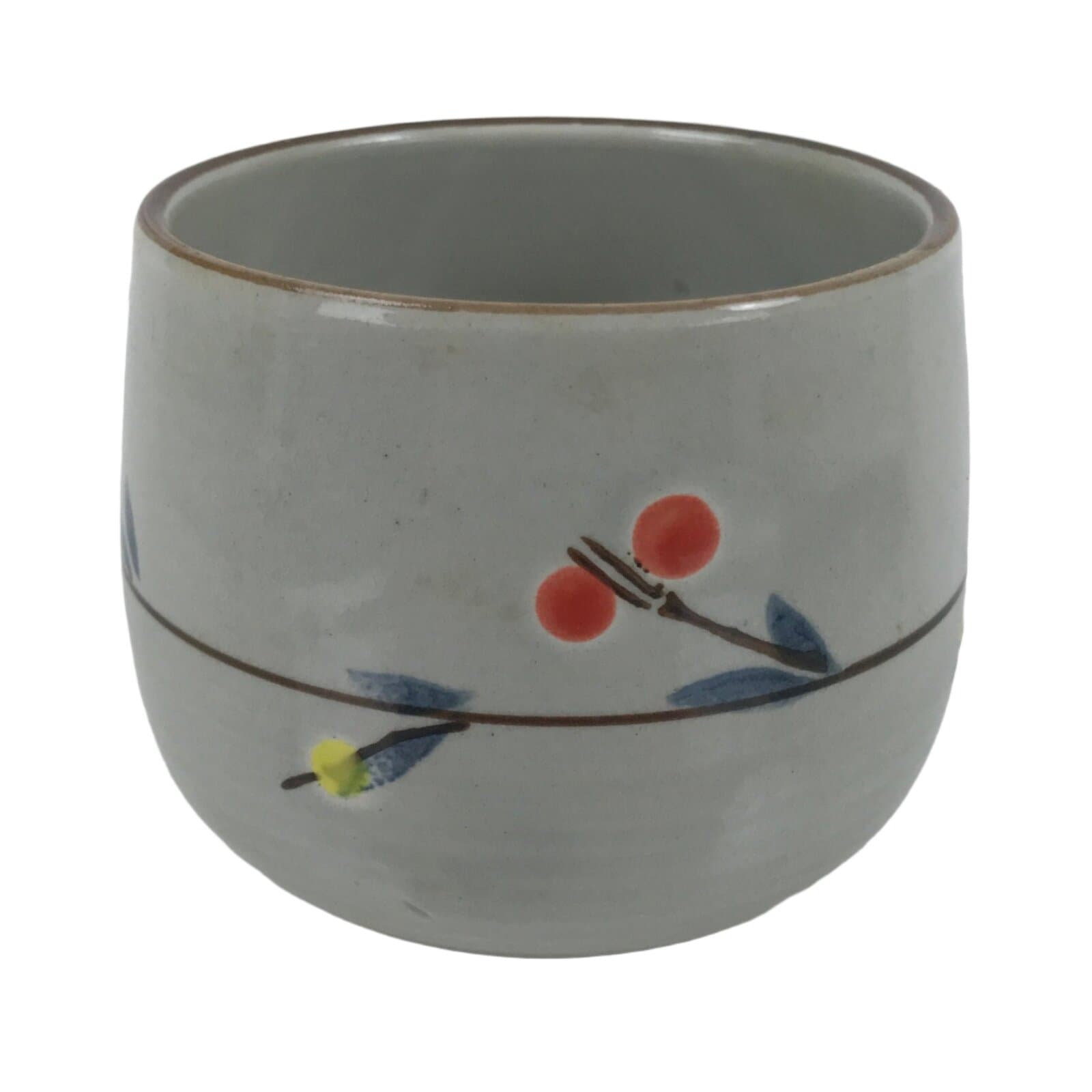 This is a Japanese vintage tea cup (Yunomi). It is a smooth gray with a tree branch banded around with red, yellow, and white plum blossom buds for decoration. The rim is brown. This cup is for serving sencha (steeped loose leaf tea).
