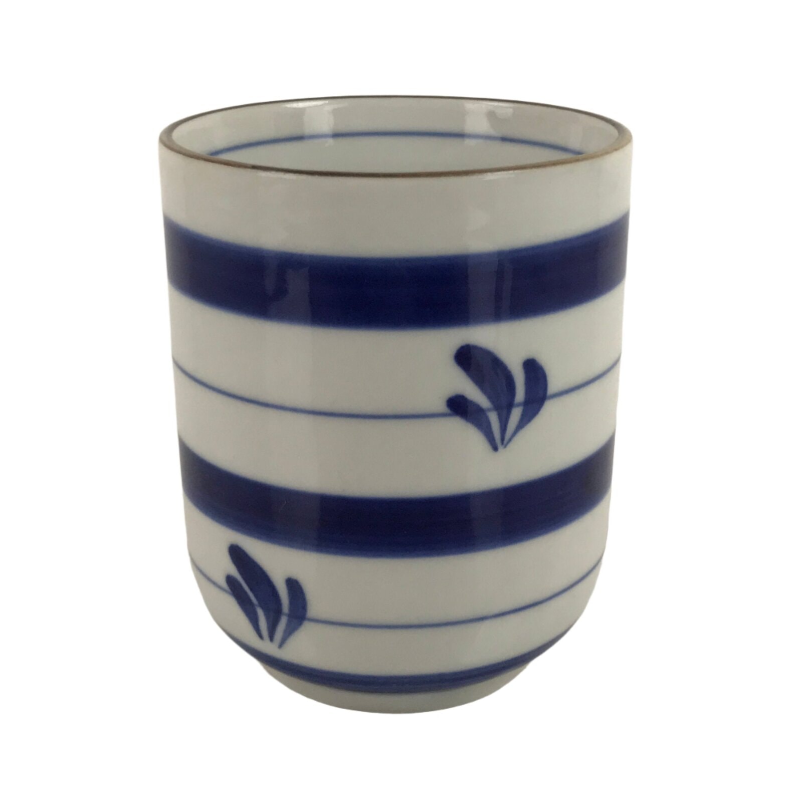 This is a Japanese vintage tea cup (Yunomi). The teacup is a stark white with bands of indigo blue in different thicknesses. There is also a plant-like motif throughout. The rim is brown. This cup is for serving sencha (steeped loose leaf tea).
