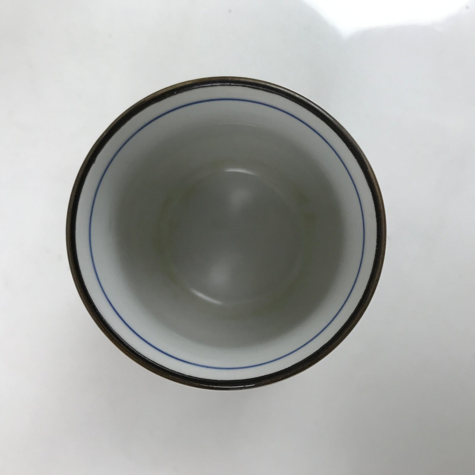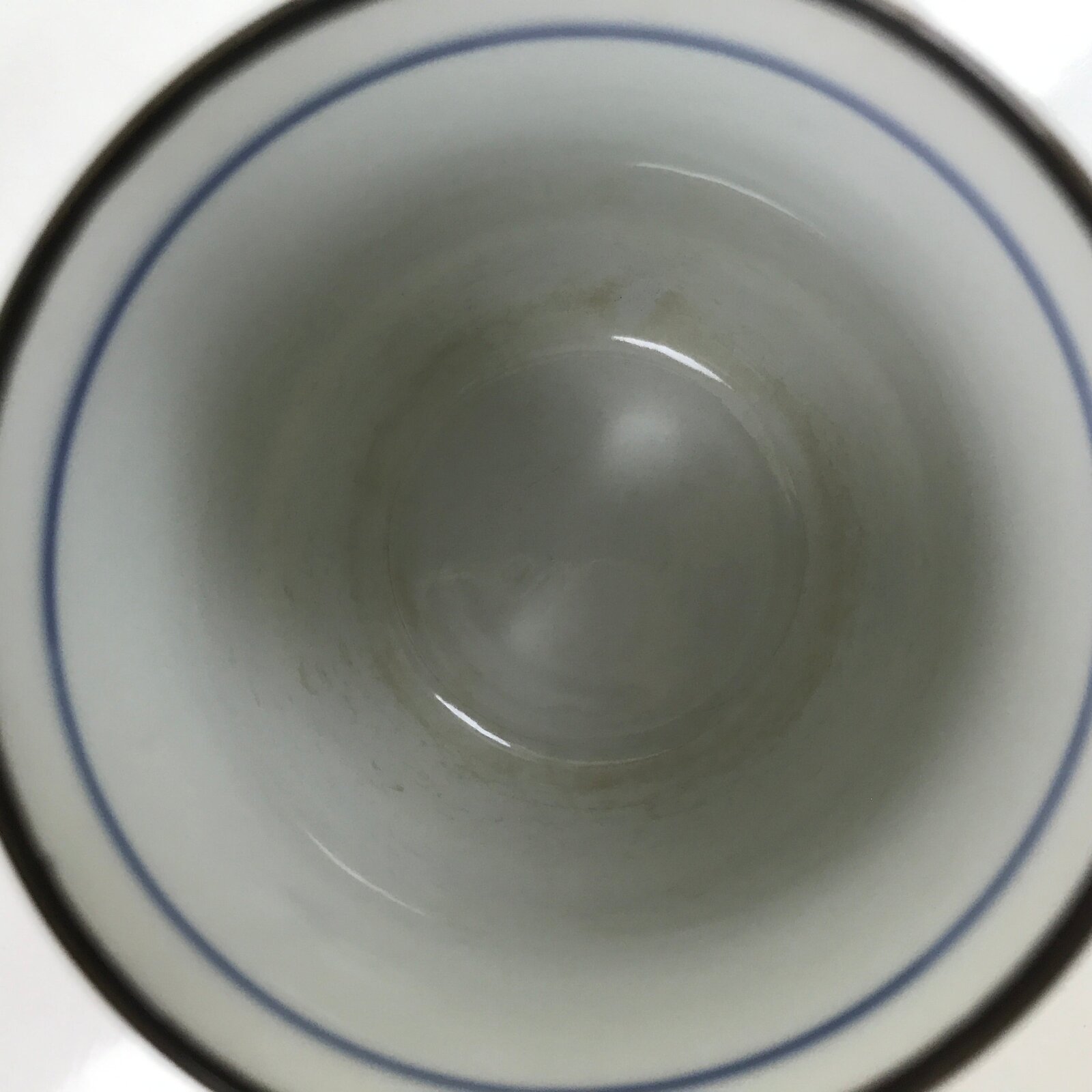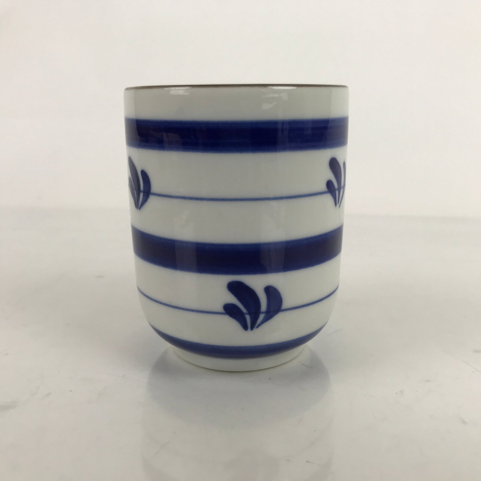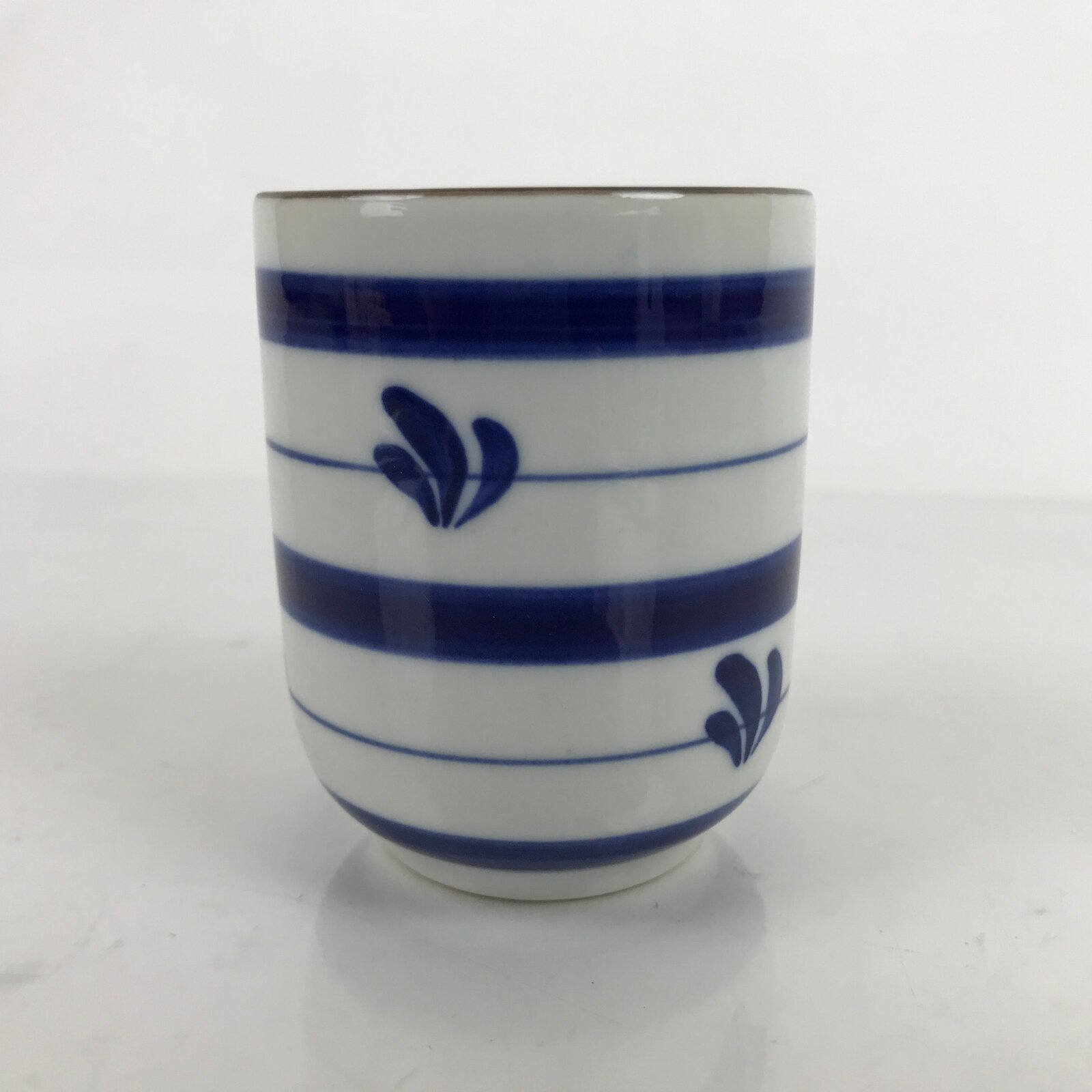 This is a Japanese vintage tea cup (Yunomi). The teacup is a stark white with bands of indigo blue in different thicknesses. There is also a plant-like motif throughout. The rim is brown. This cup is for serving sencha (steeped loose leaf tea).