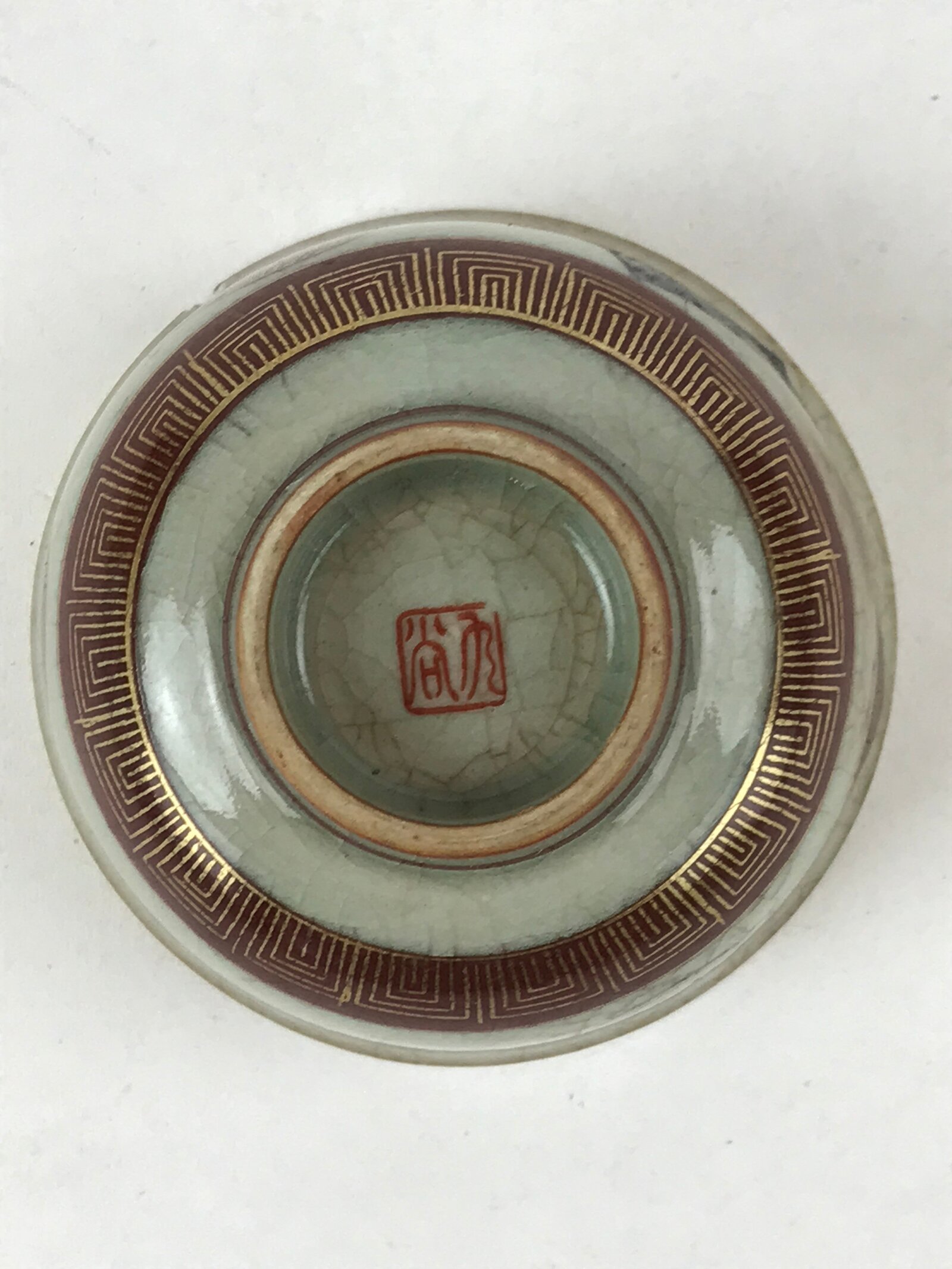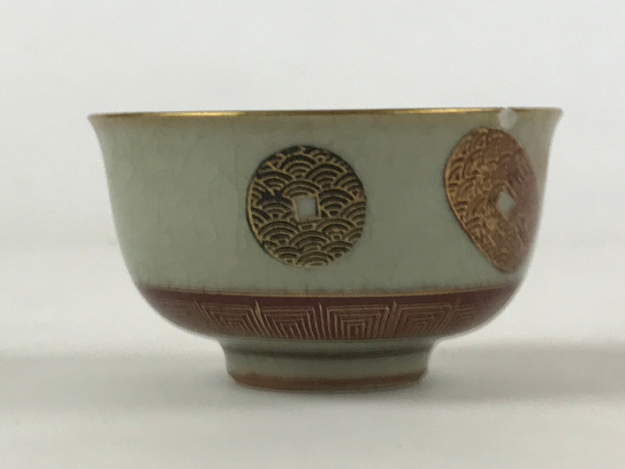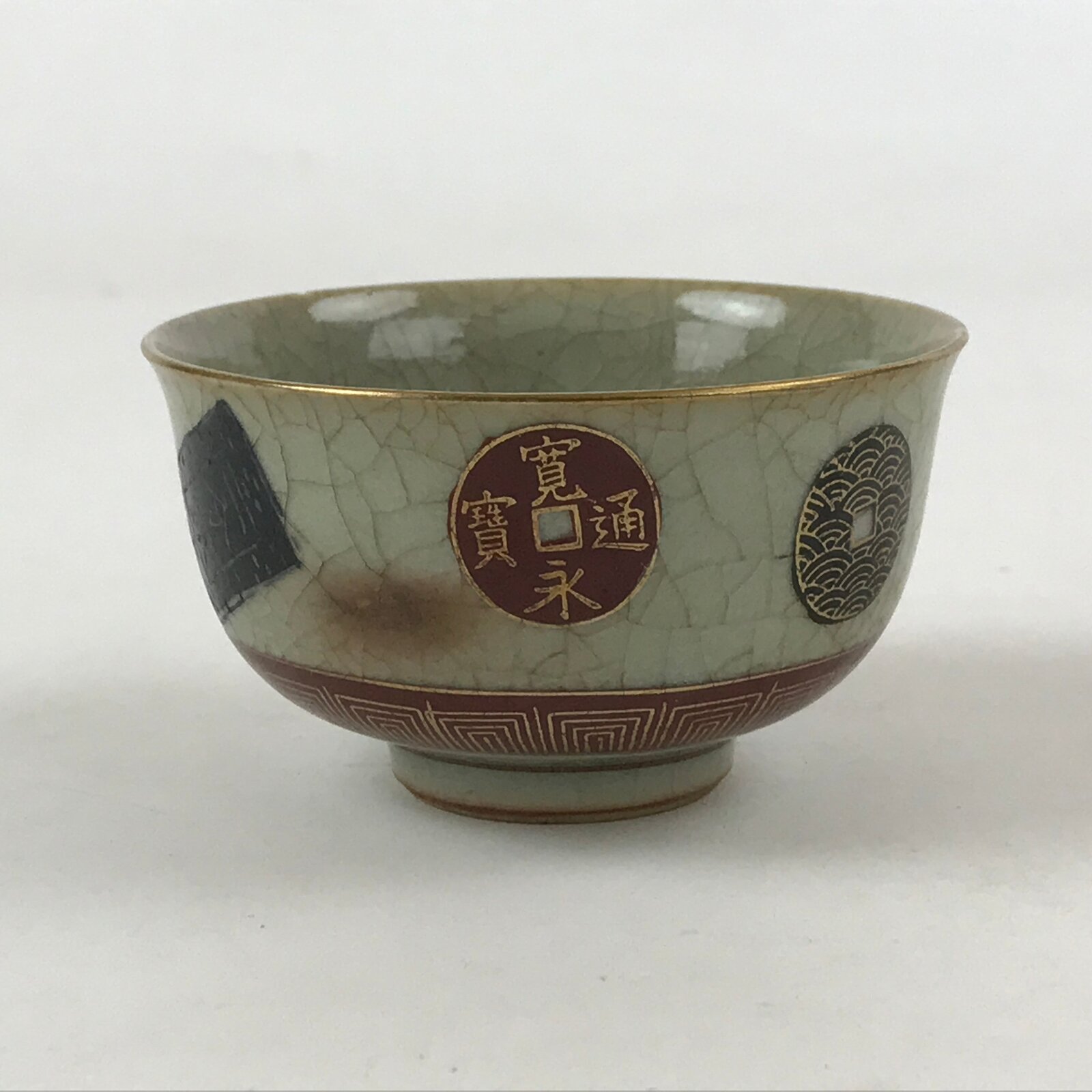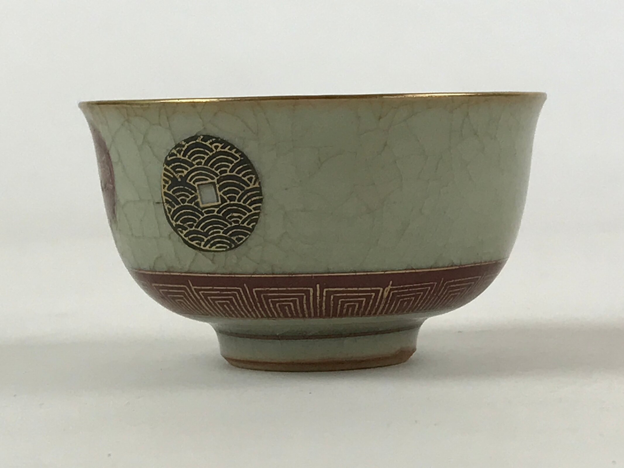 This vintage Japanese teacup has a crackled light green glaze. It is decorated with pictures of round coins with a square hole in the center in lack and reddish brown colors. This elegant and delicate cup a compact size and has a light weight, so it can be carried easily.