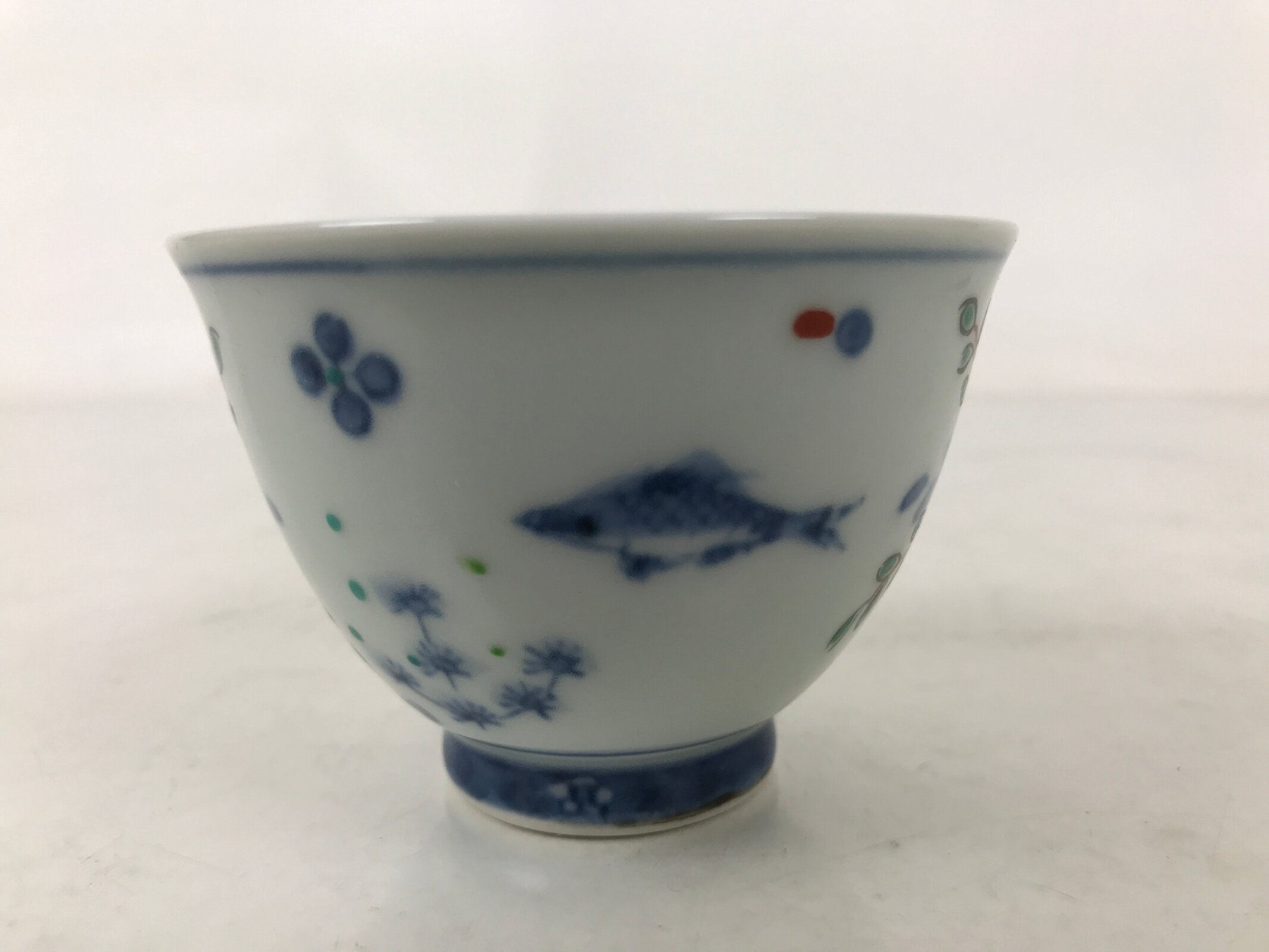 Japanese Porcelain Yunomi Teacup Pottery Vtg White Blue Hishi Fish Sencha TC588