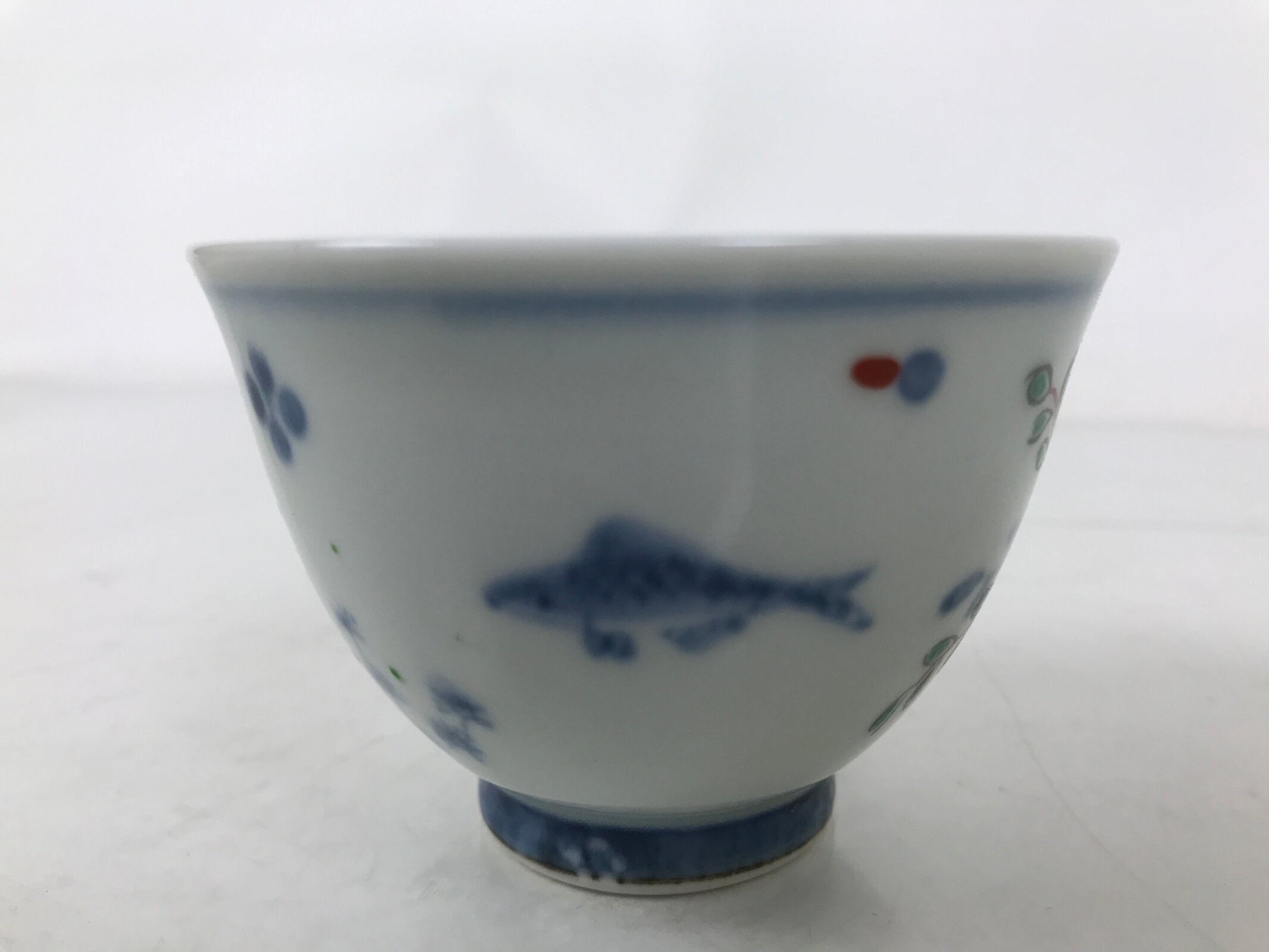Japanese Porcelain Yunomi Teacup Pottery Vtg White Blue Hishi Fish Sencha TC589