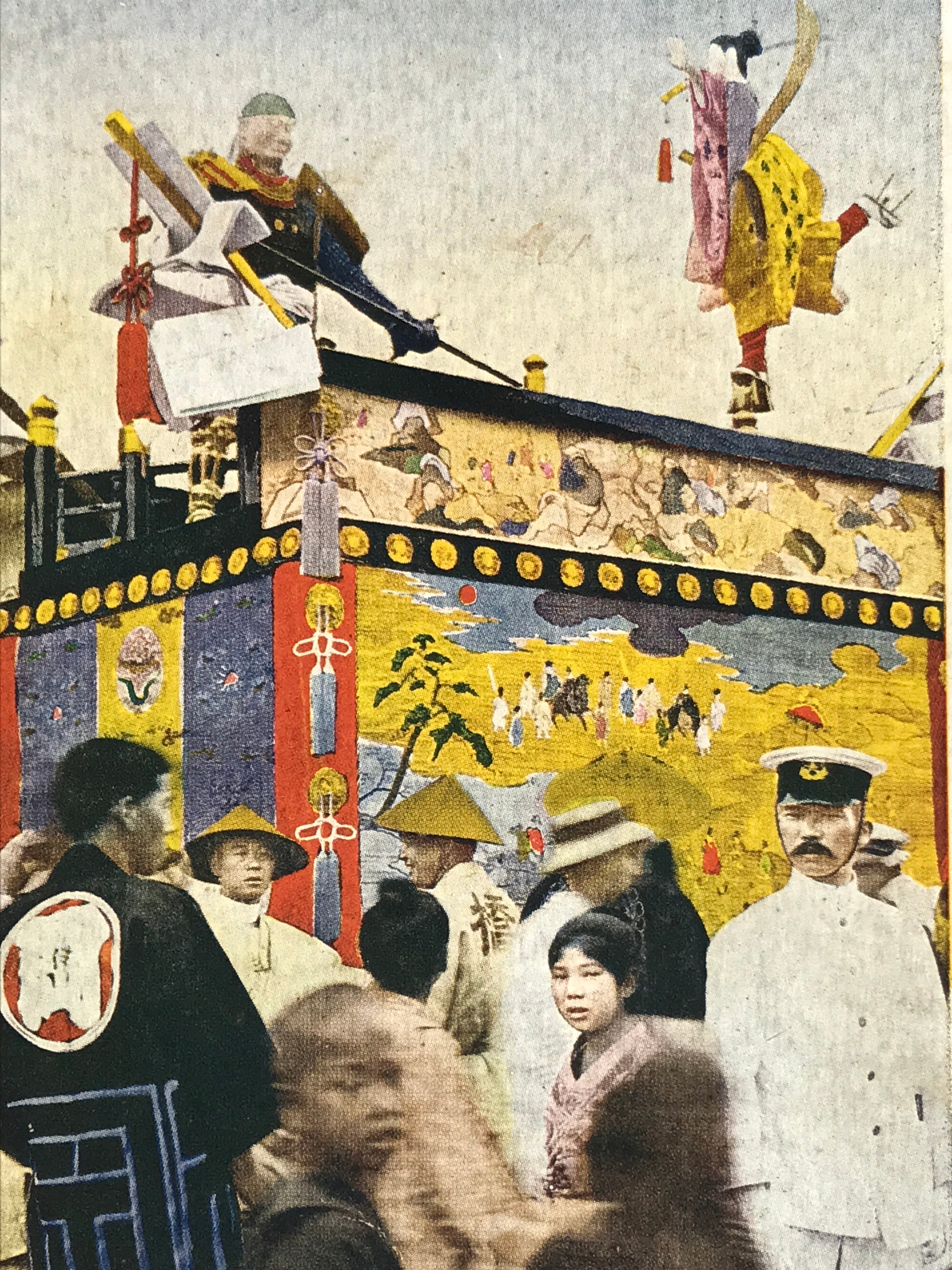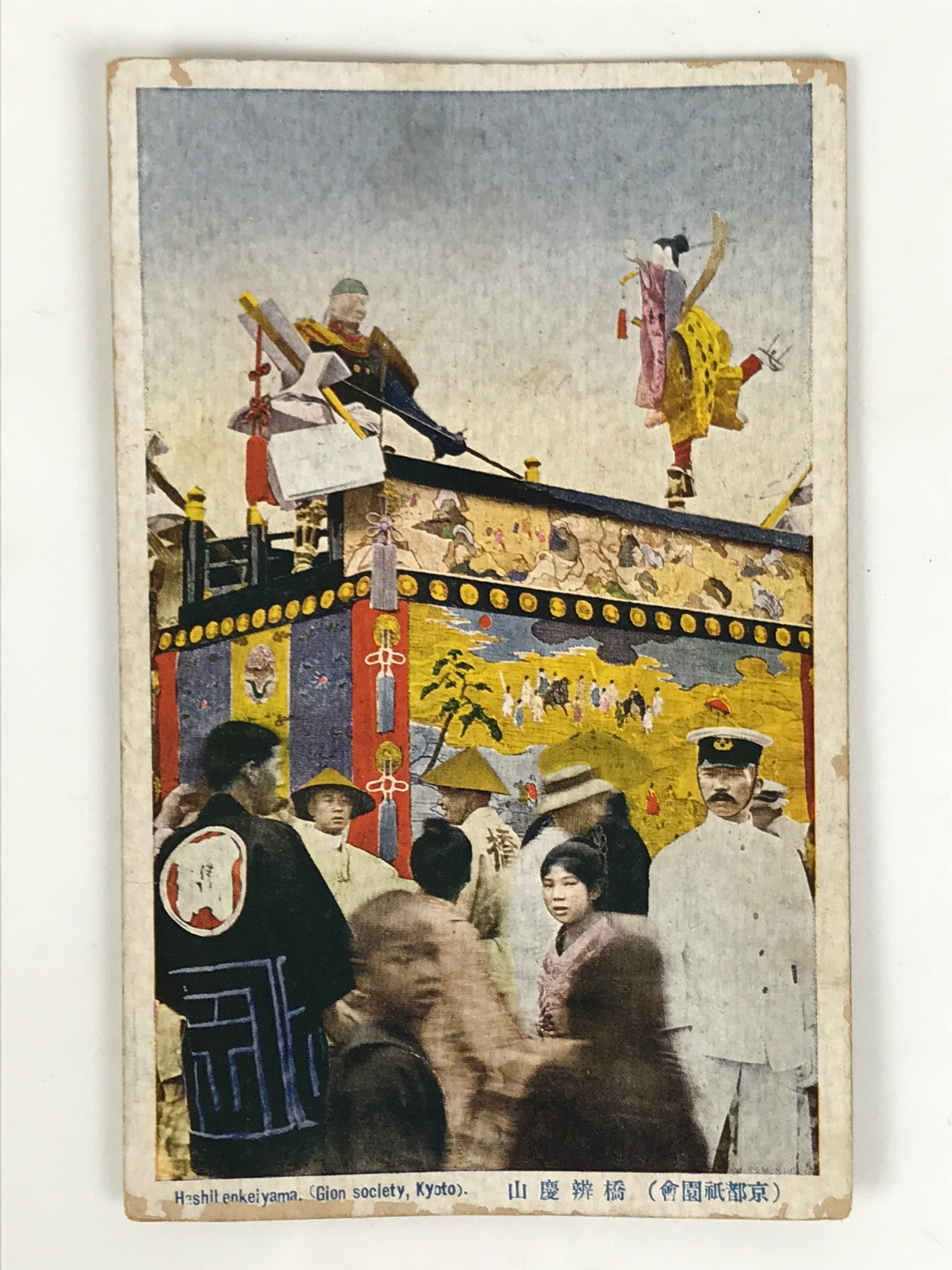 This vintage Japanese colorized postcard features a photograph of a matsuri float from the Kyoto Gion Festival. This particular float (or dashi in Japanese) is called Hashibenteiyama. The float features two puppets at the top: 2 people who appear to be fighting.