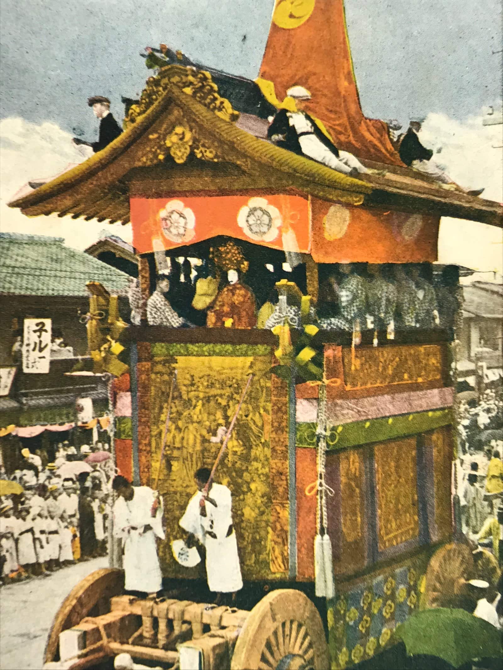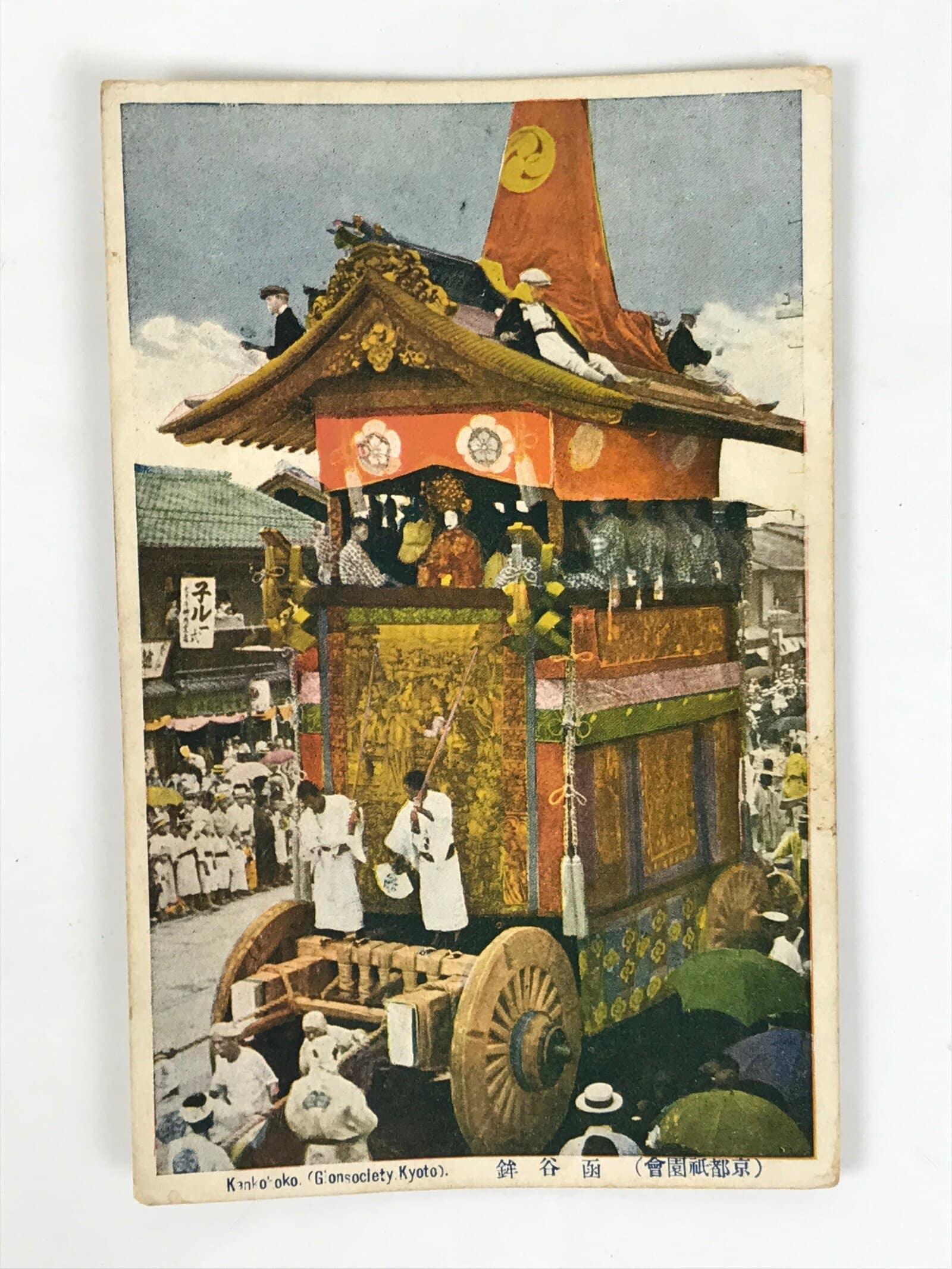 This vintage Japanese colorized postcard features a photograph of a matsuri float from the Kyoto Gion Festival. This particular float (or dashi in Japanese) is called Kankohoko. Musicians are riding the float, and a puppet is at the front. People are gathered to watch the float.