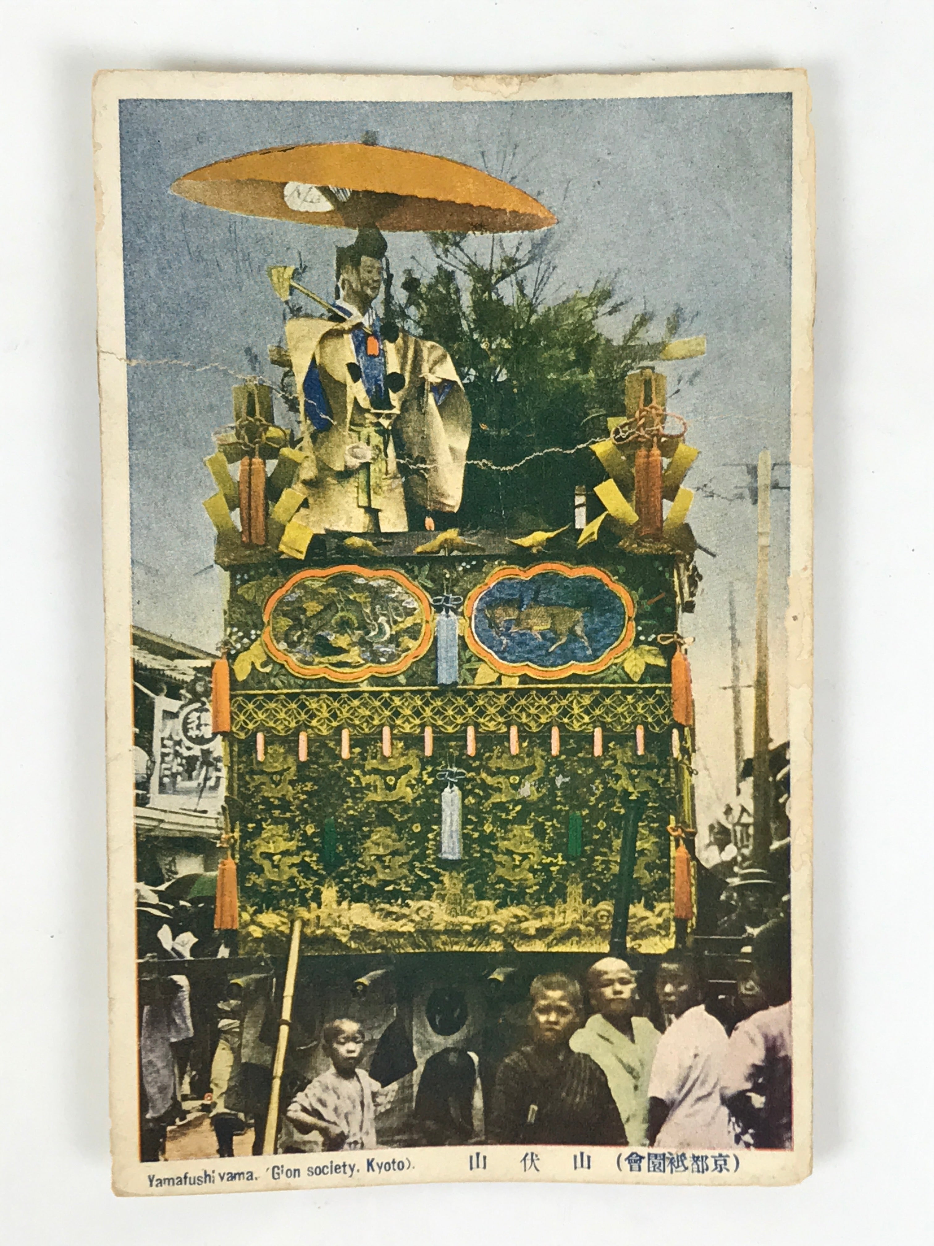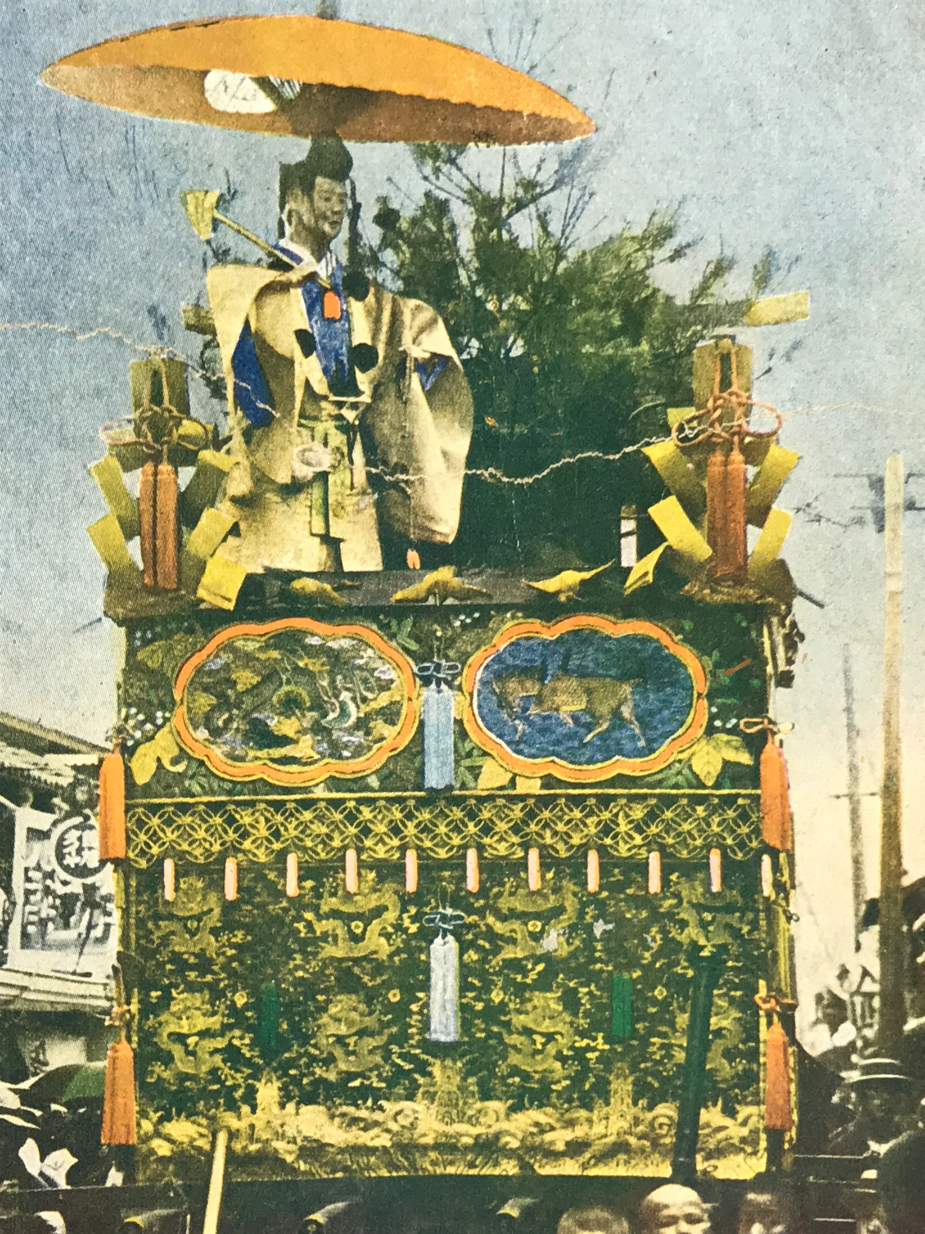 This vintage Japanese colorized postcard features a photograph of a matsuri float from the Kyoto Gion Festival. This particular float (or dashi in Japanese) is called Yamafushiyama. The float features a puppet and trees at the top.