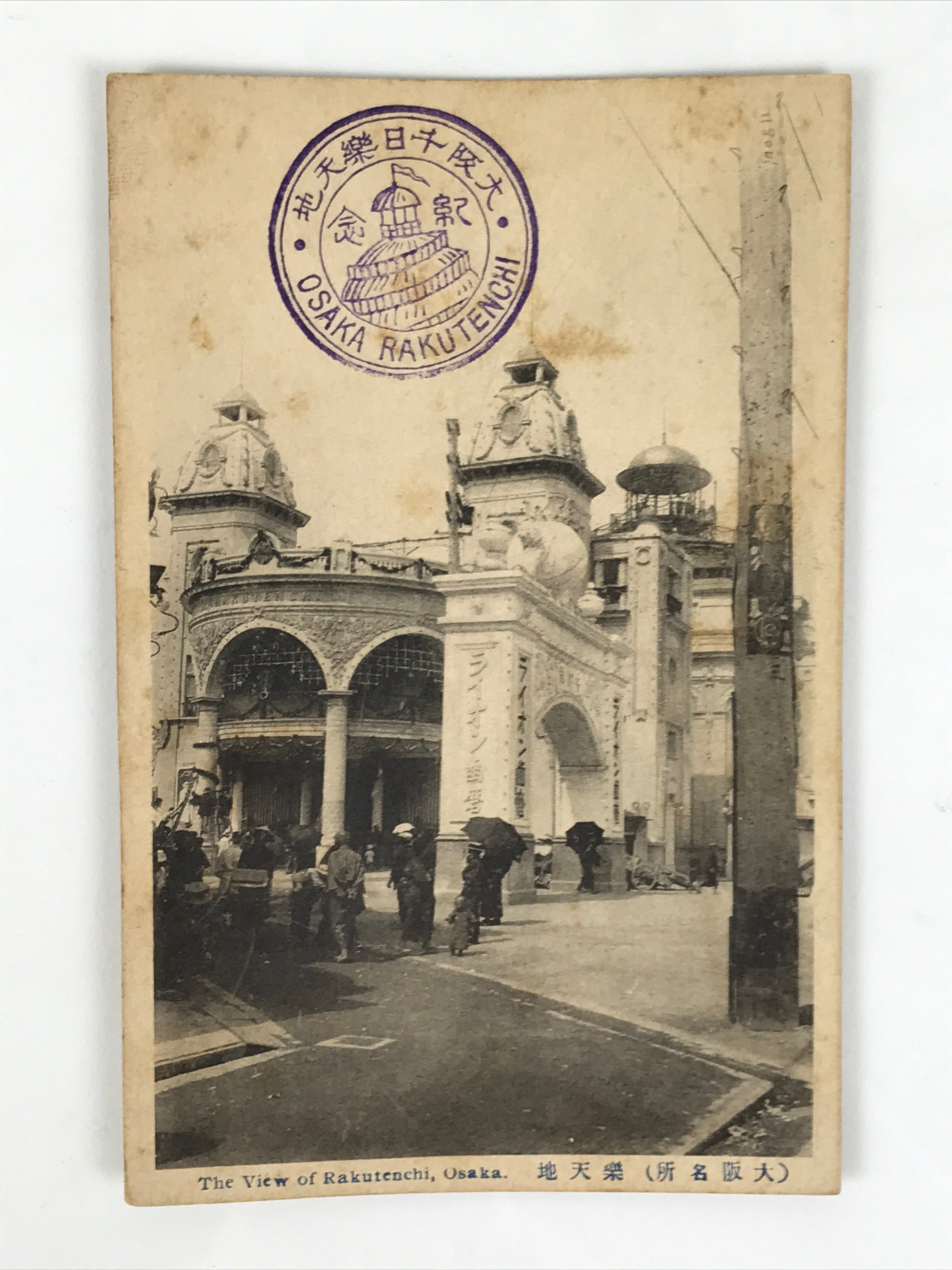This antique Japanese black-and-white postcard features a photograph of a building of Rakutenchi, a leisure facility in Osaka. The postcard features a stamp of the place on the front, and a caption in Japanese and English.