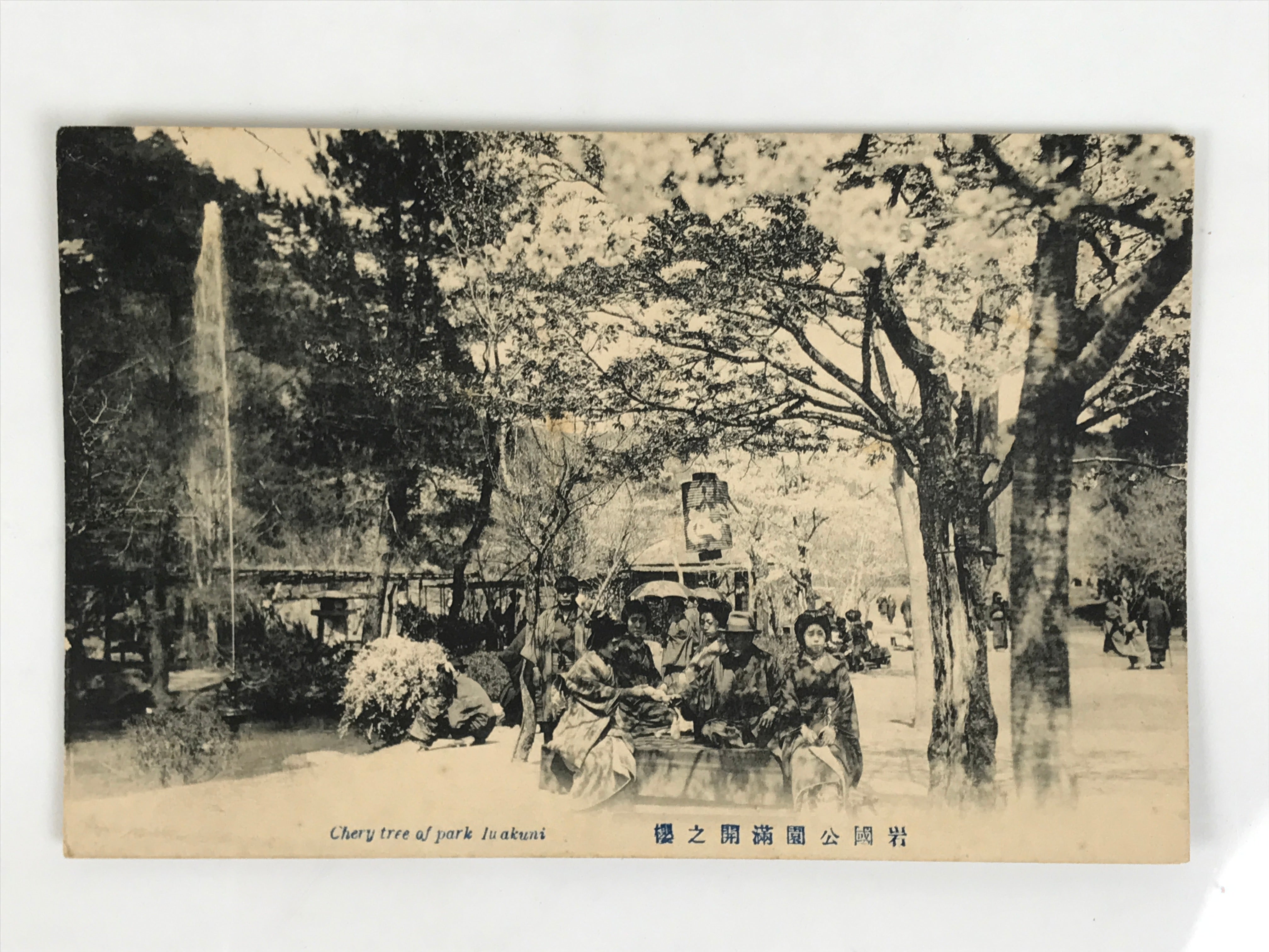 This antique Japanese black-and-white postcard is a photography taken at the Iwakuni Park during the cherry blossom season. Trees and Japanese people wearing traditional clothing are depicted. There is a caption in Japanese and in English.