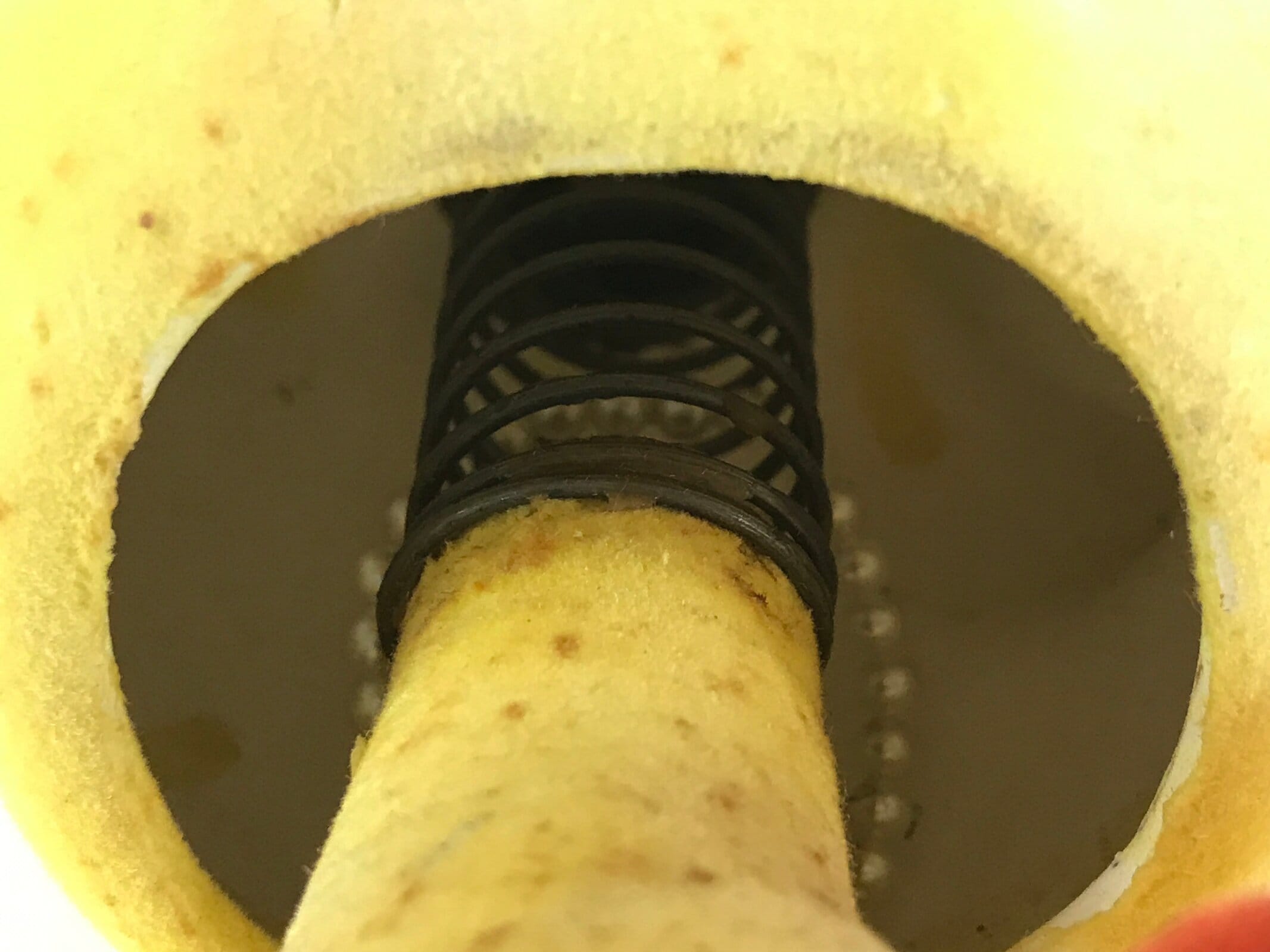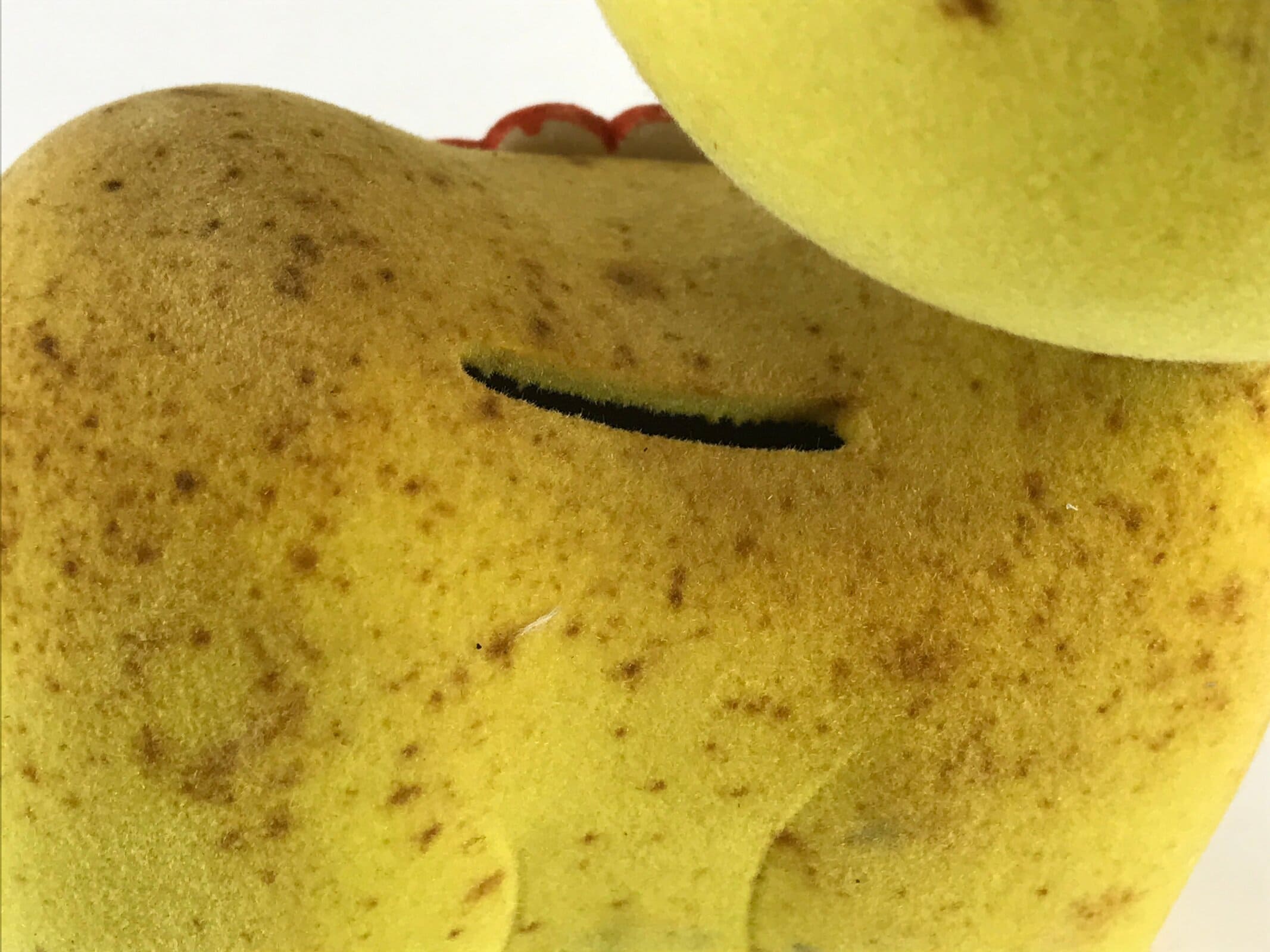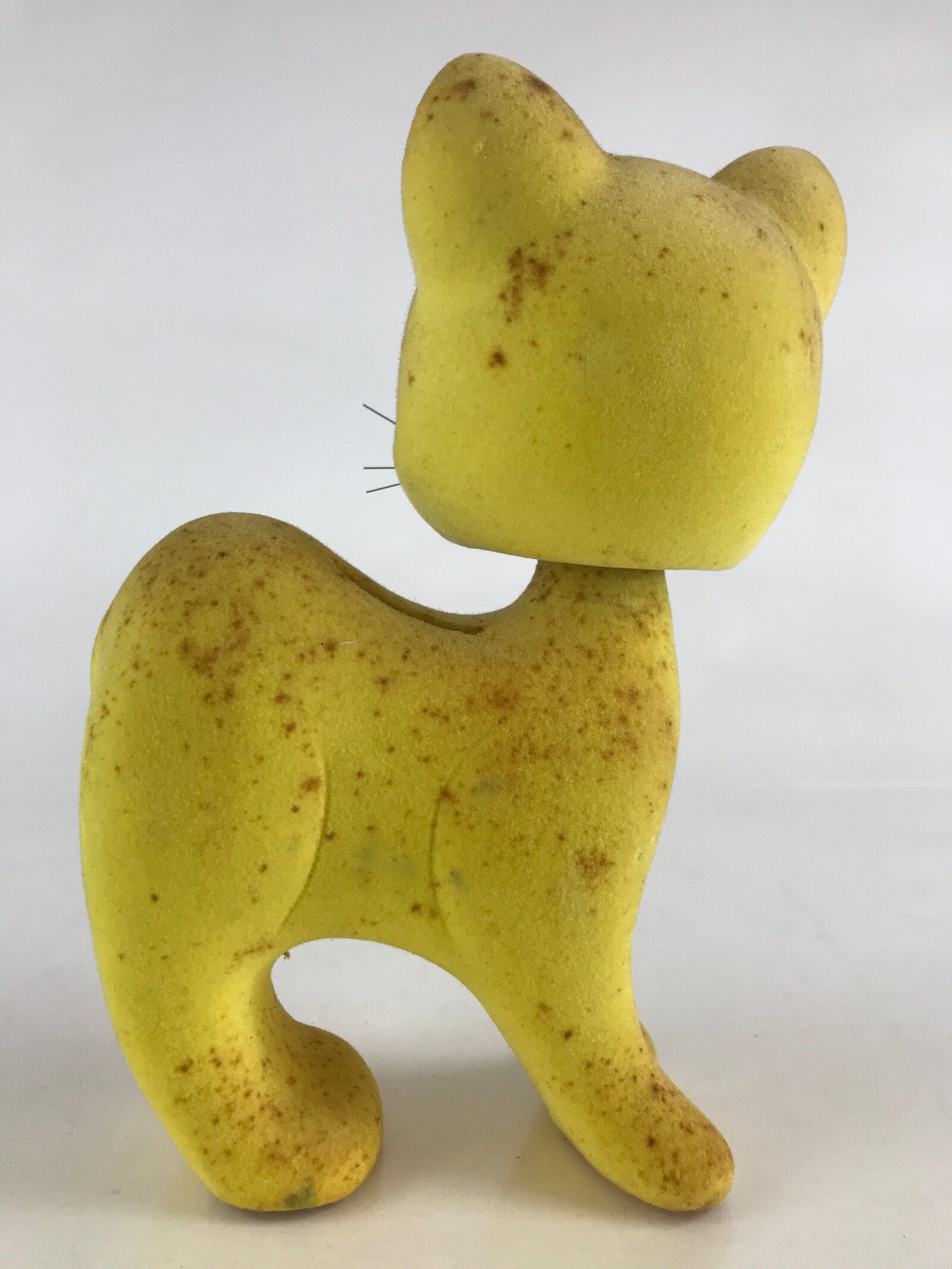 This is a vintage Japanese piggy bank. It has the shape of a yellow cat. It is made of pottery, and the surface has a texture like felt fabric. There is a beaded necklace and a thermometer on the body. The head has a spring so it shakes and moves.