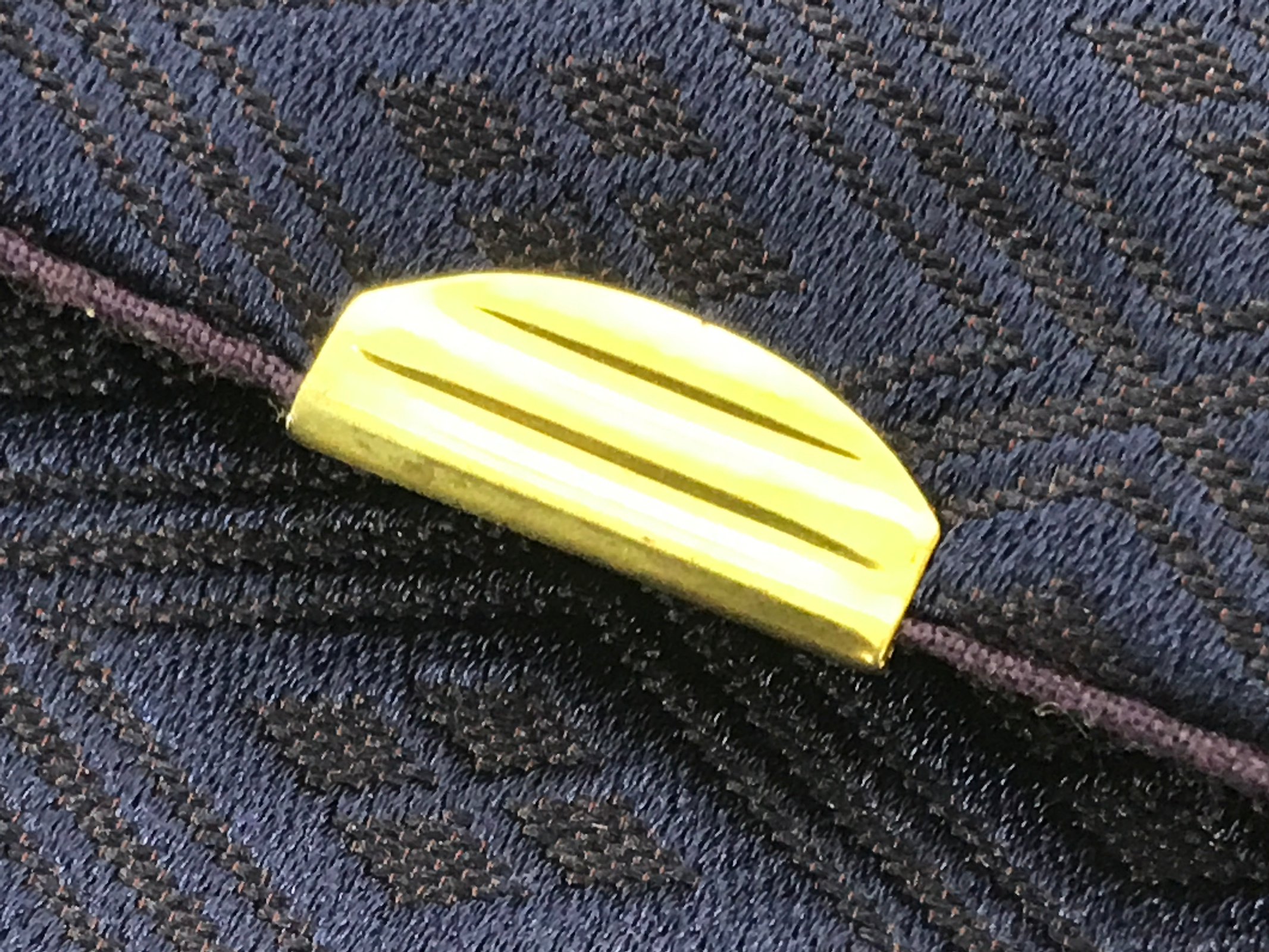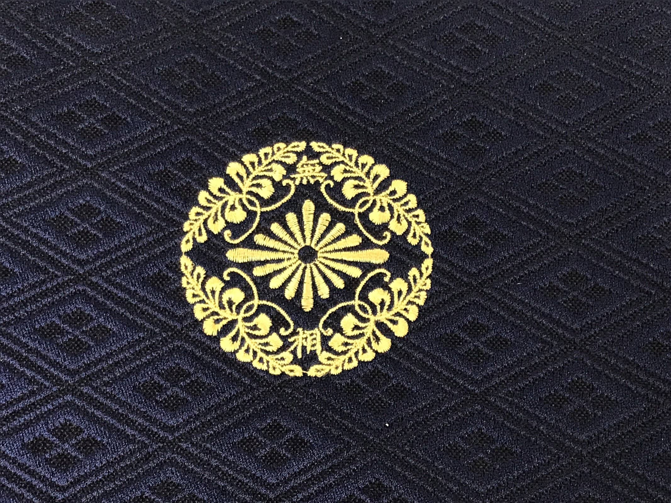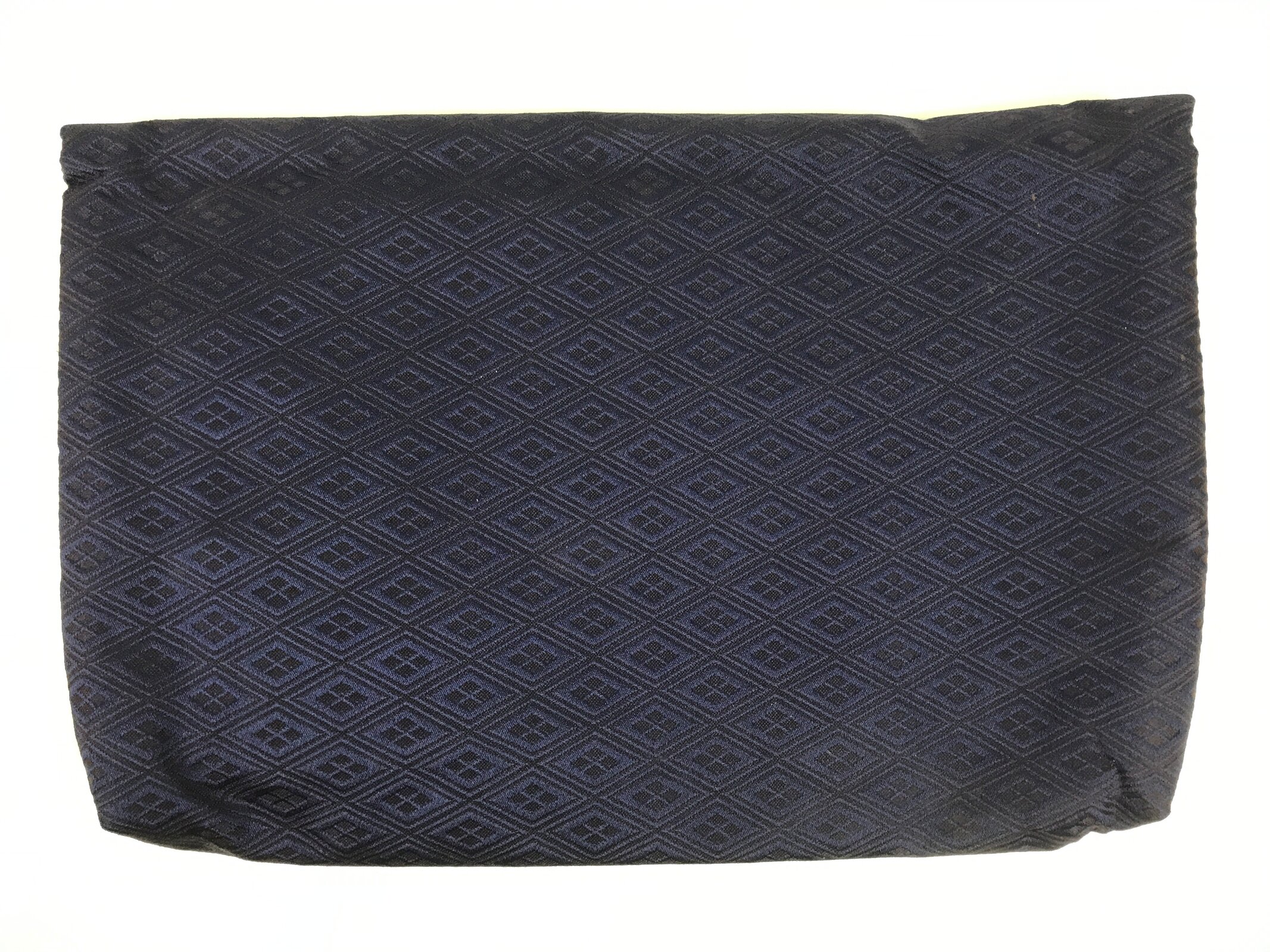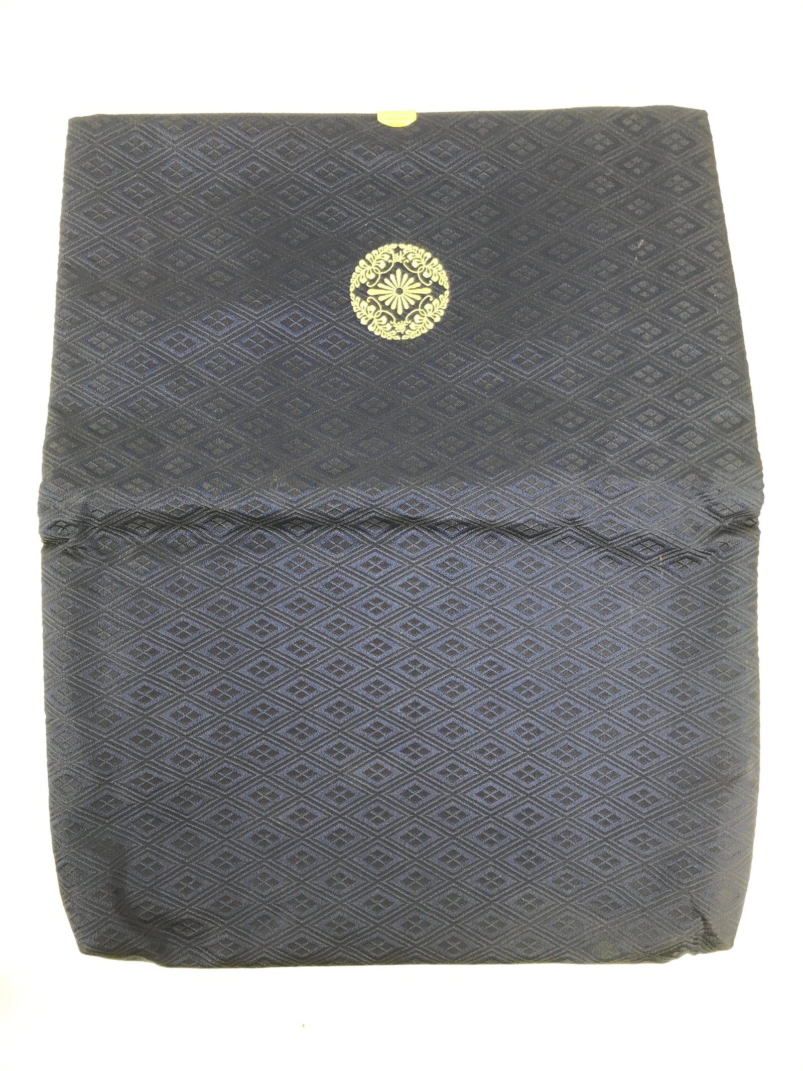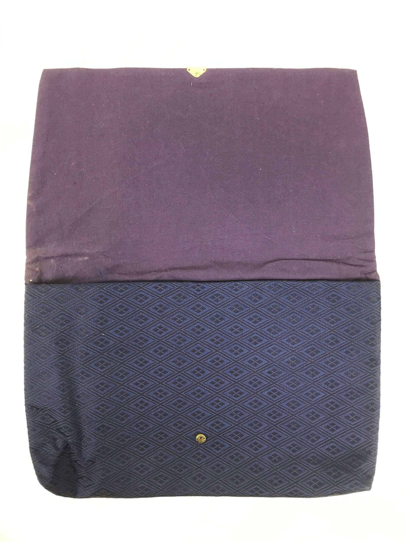 This is a Japanese vintage handmade fabric bag for prayer beads juzu, a sutrabook, and a silk cloth fukusa. It is used to carry items used in memorial services, such as funerals. It is made of a deep navy blue fabric with an embroidery-rhombus pattern called Hishi-monyo on the front. Its back is made of plain purple fabric. It has a gold crest at the center. This bag has a snap button to keep it closed.