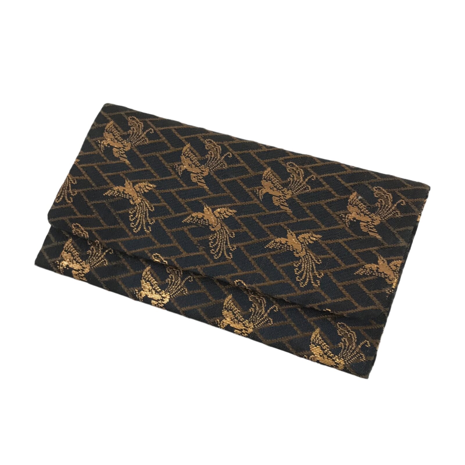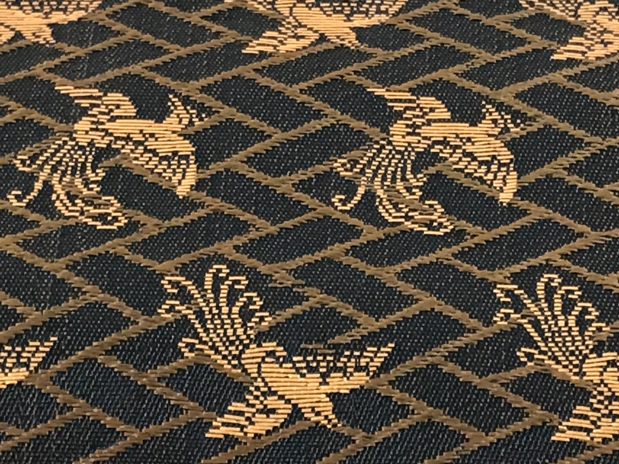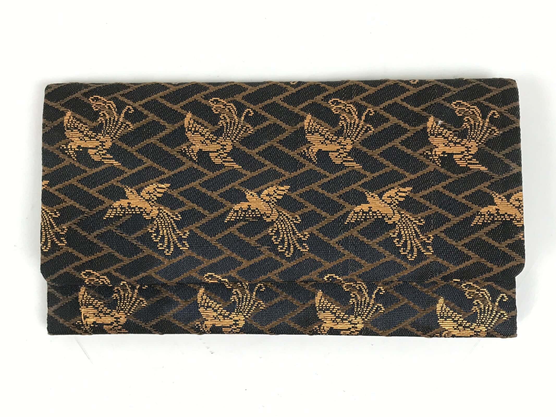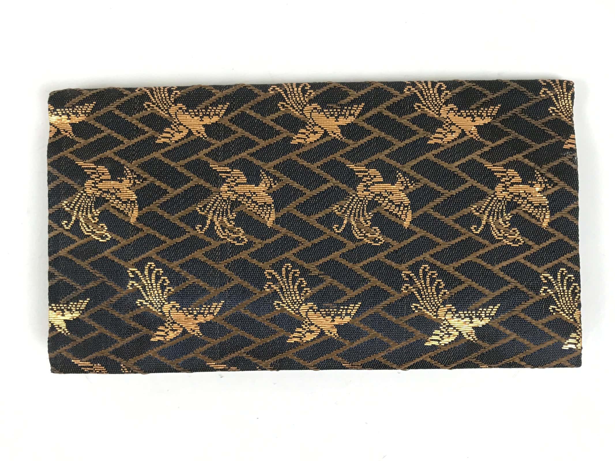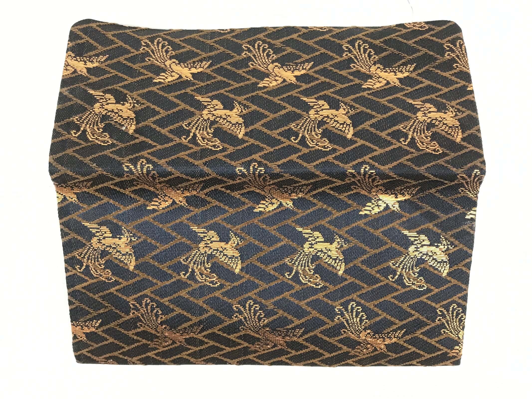 This is a Japanese vintage handmade fabric prayer beads juzu bag, also called juzu-bukuro. It is used to carry rosary beads used in memorial services such as funerals. It is made of a deep navy blue silk fabric with a woven basket/fence pattern called Ajiro/Higaki in brown and miniature depictions of the legendary bird Ho-oh in gold. There are two pockets inside, covered in plain beige fabric. This case has no clasp or hook to keep it closed.