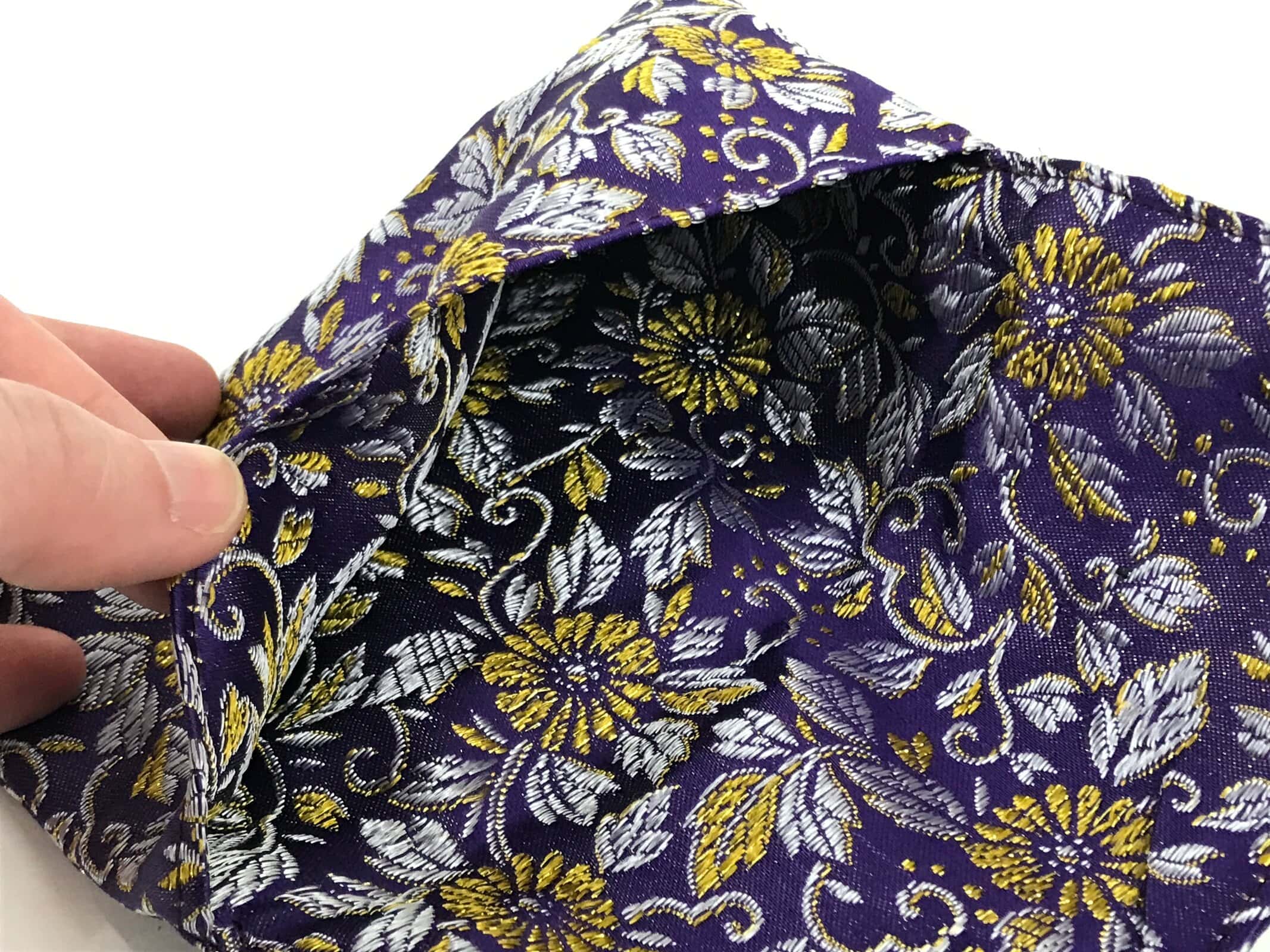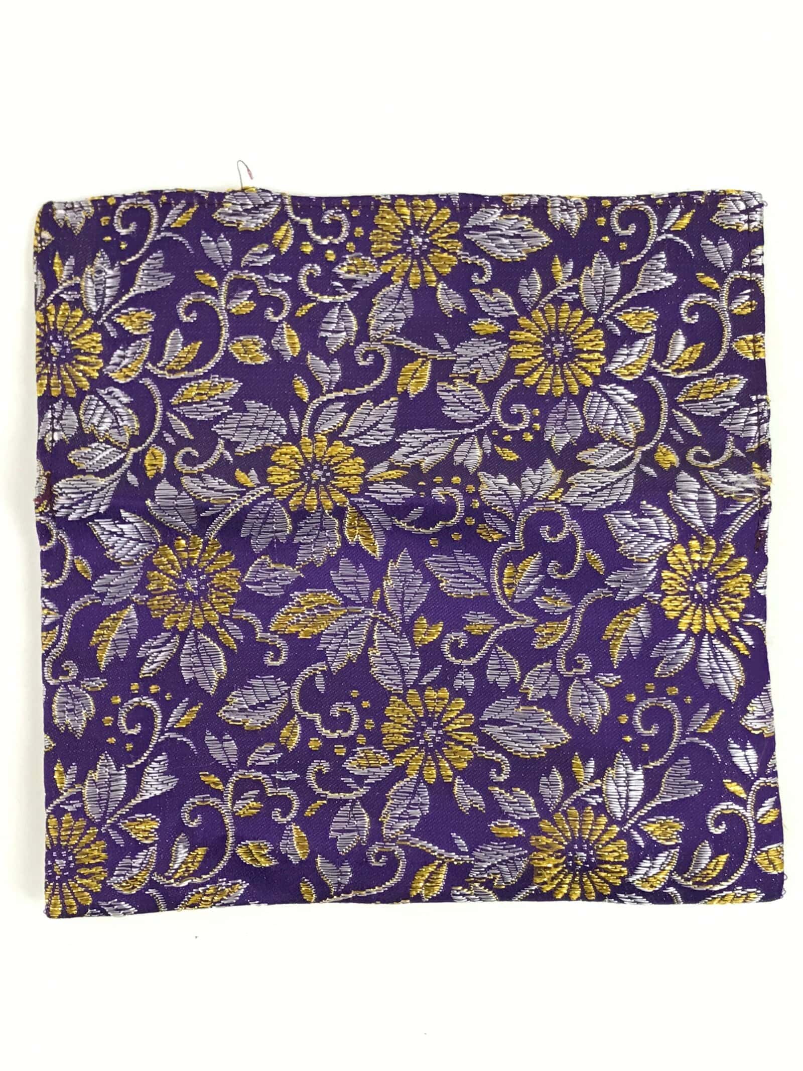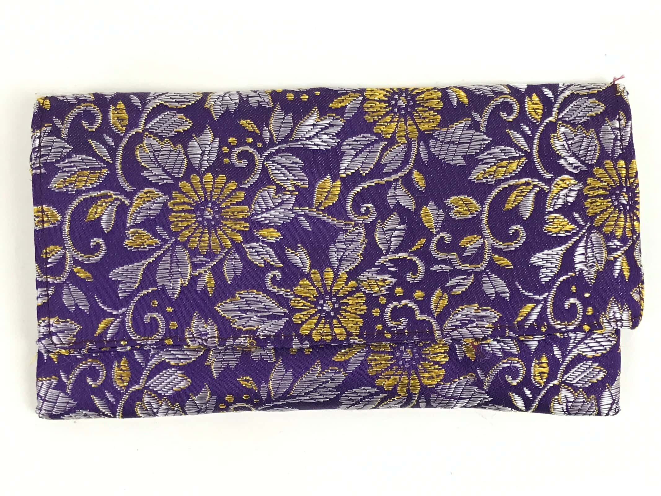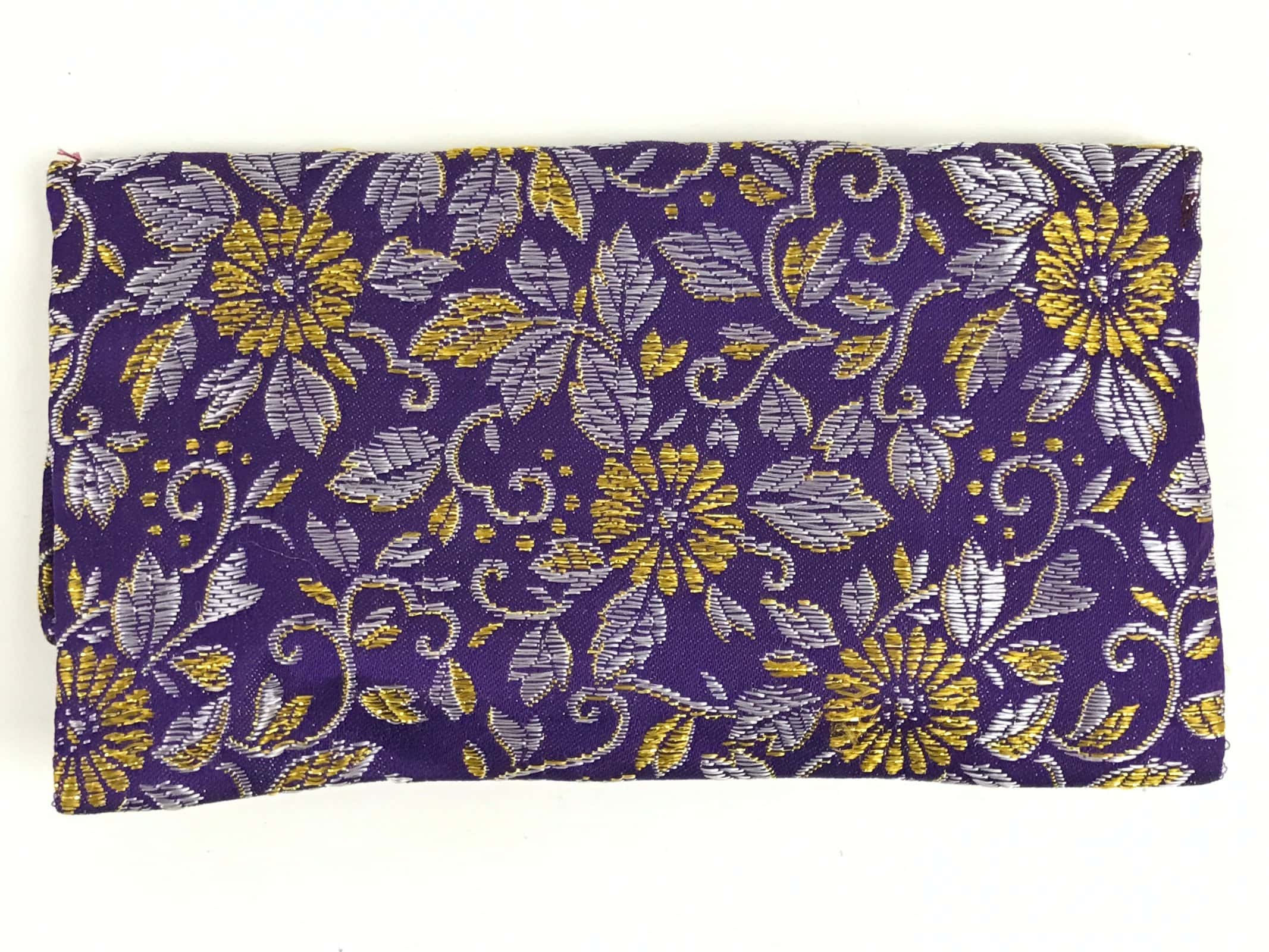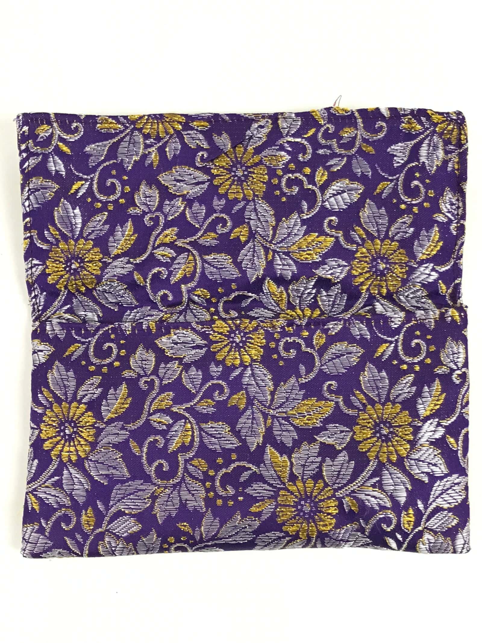 This is a Japanese vintage handmade fabric prayer beads Juzu bag, Jyuzu-Bukuro. It is used to carry rosary beads used in memorial services such as funerals. It is made of silk fabric that features chrysanthemums and leaves in purple and gold. There is only one pocket and as this is a very simple style pouch, there is no clasp, button, or toggle to keep it closed.