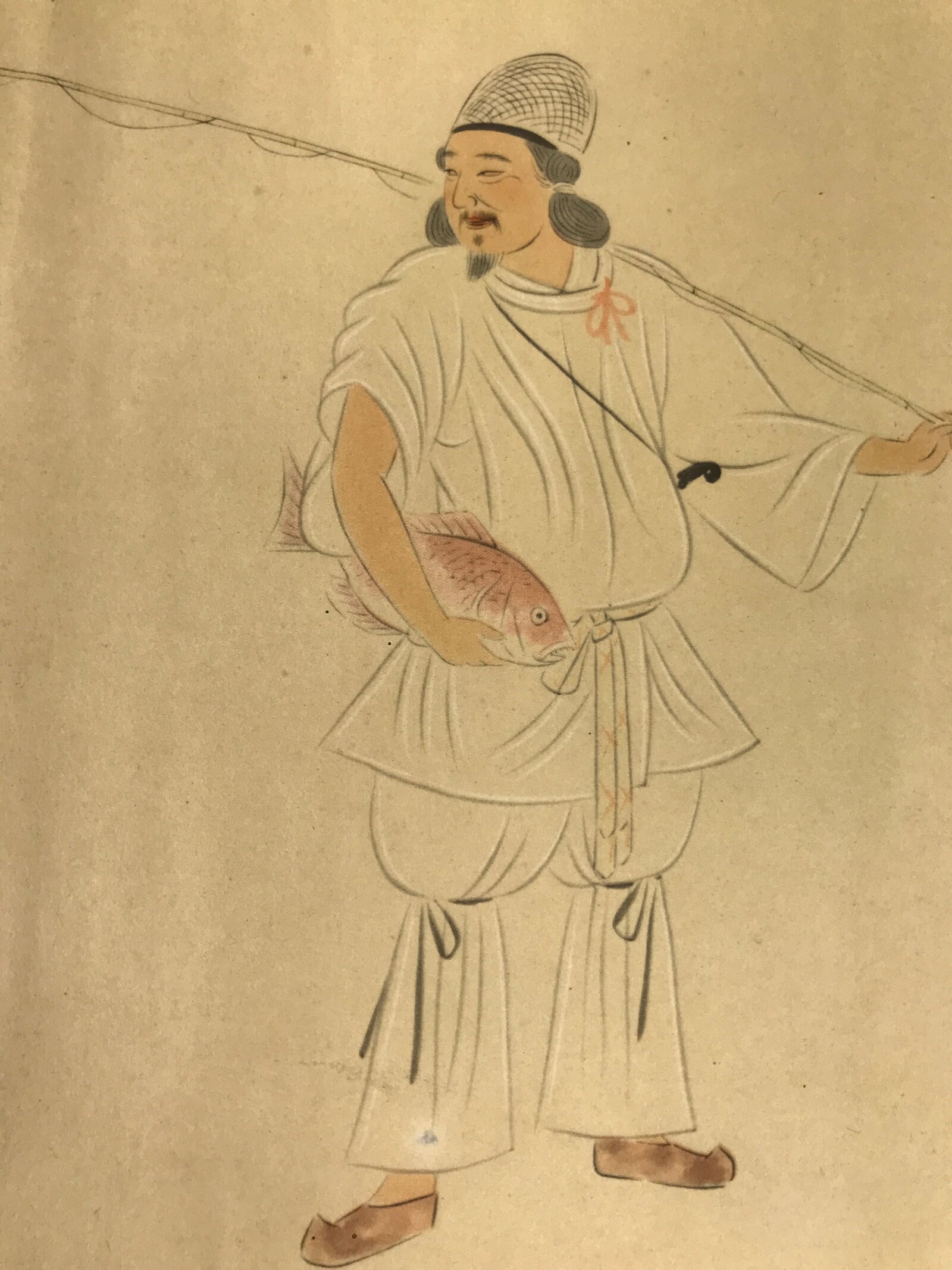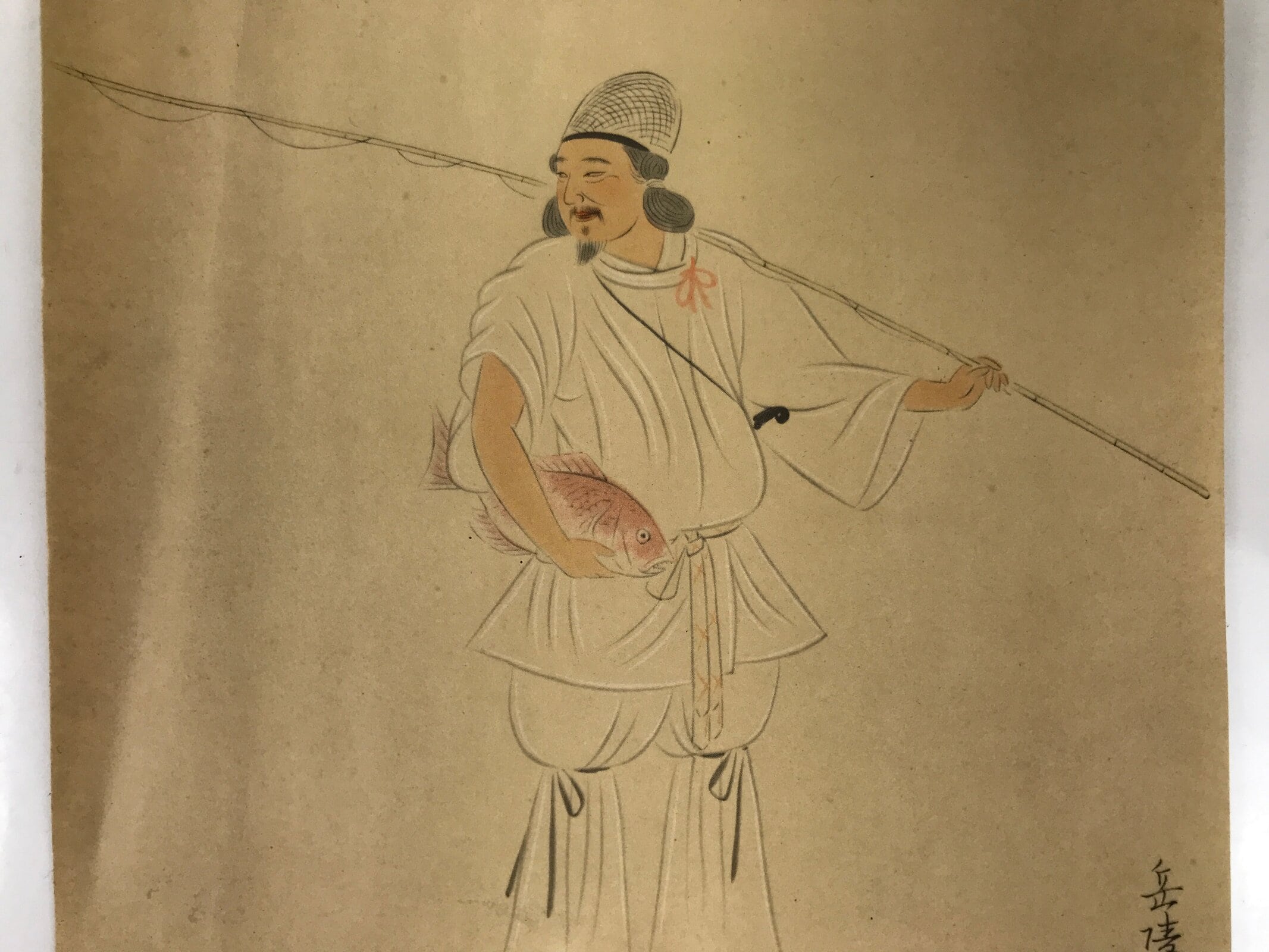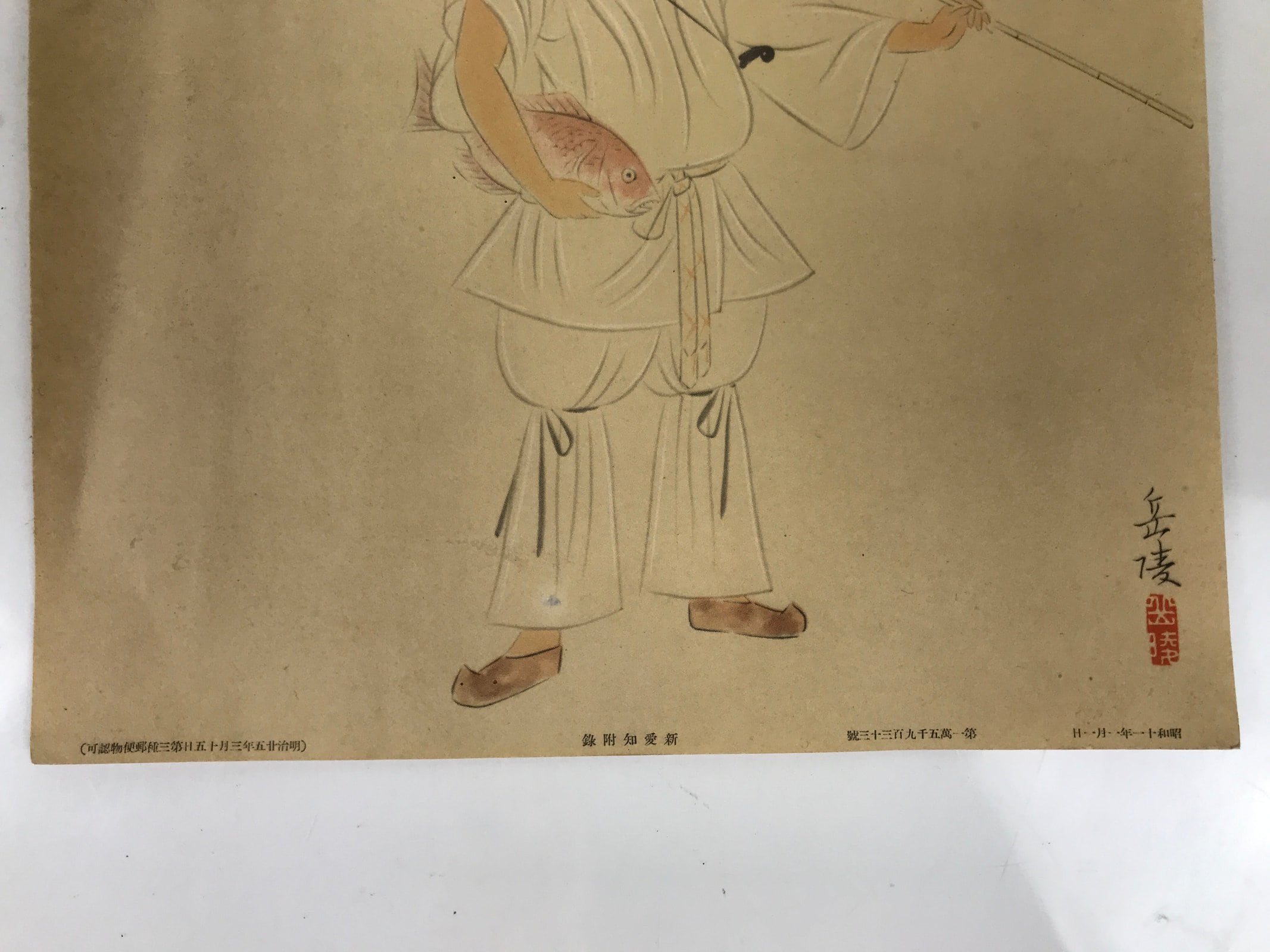 This vintage Japanese print reproduction features Ebisu, one of the Seven Lucky Gods. Ebisu is carrying a fishing rod and holds a red fish, likely a carp, in one of his hands. This type of print is a gift that comes with magazines or newspapers.