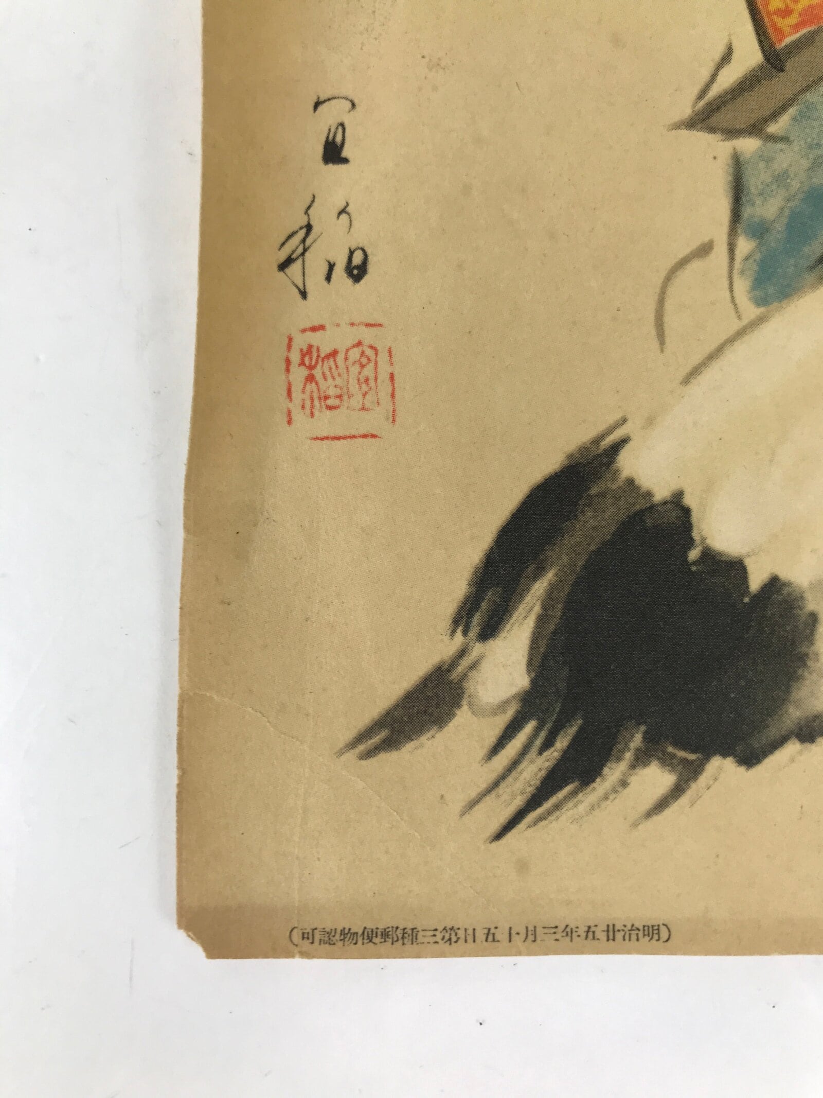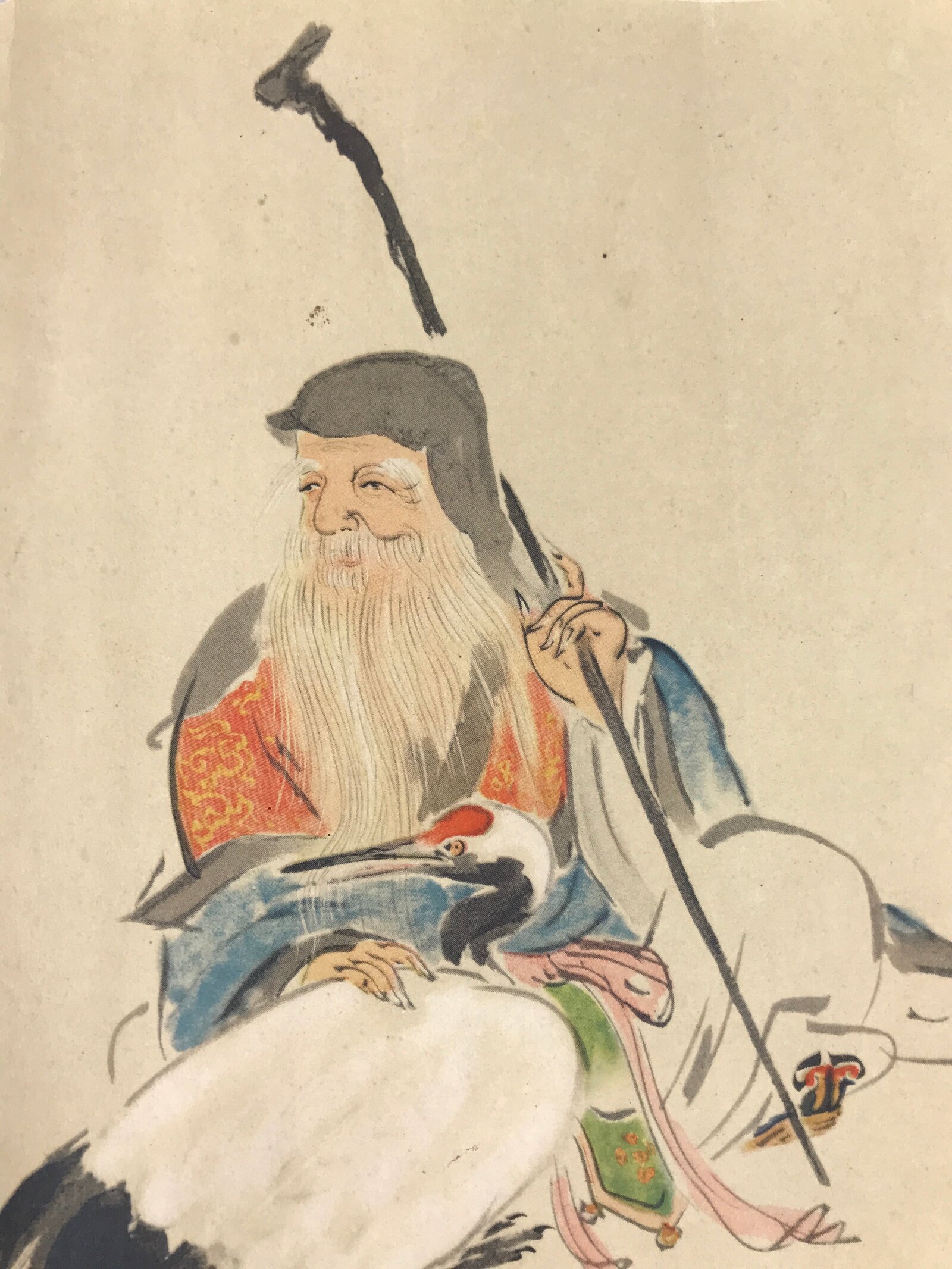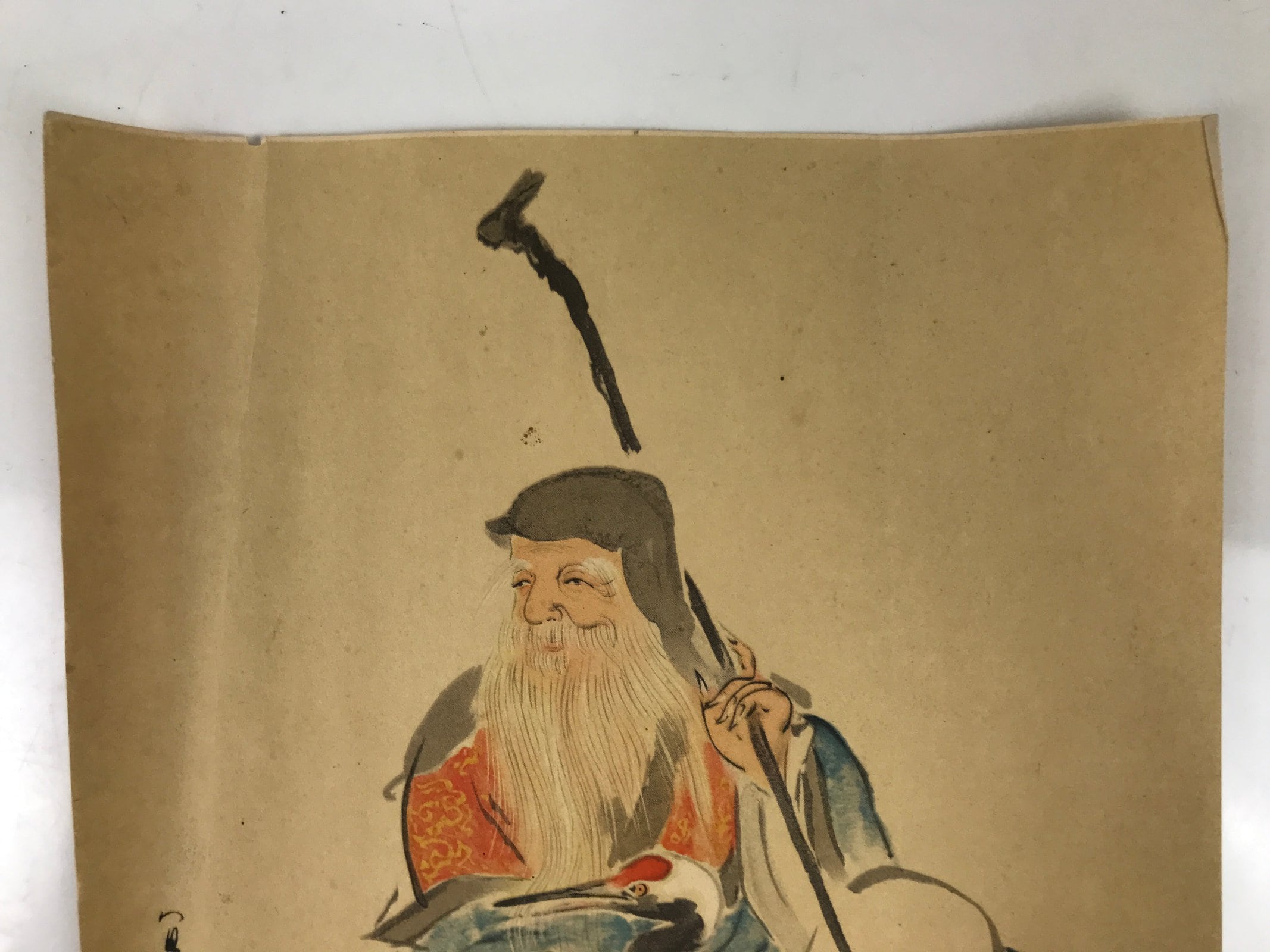 This vintage Japanese print reproduction features Fukurokujin, one of the Seven Lucky Gods. Fukurokujin, the god of wisdom, has the appearance of an old man with a stick and is petting a Japanese crane, or tsuru. This type of print is a gift that comes with magazines or newspapers.