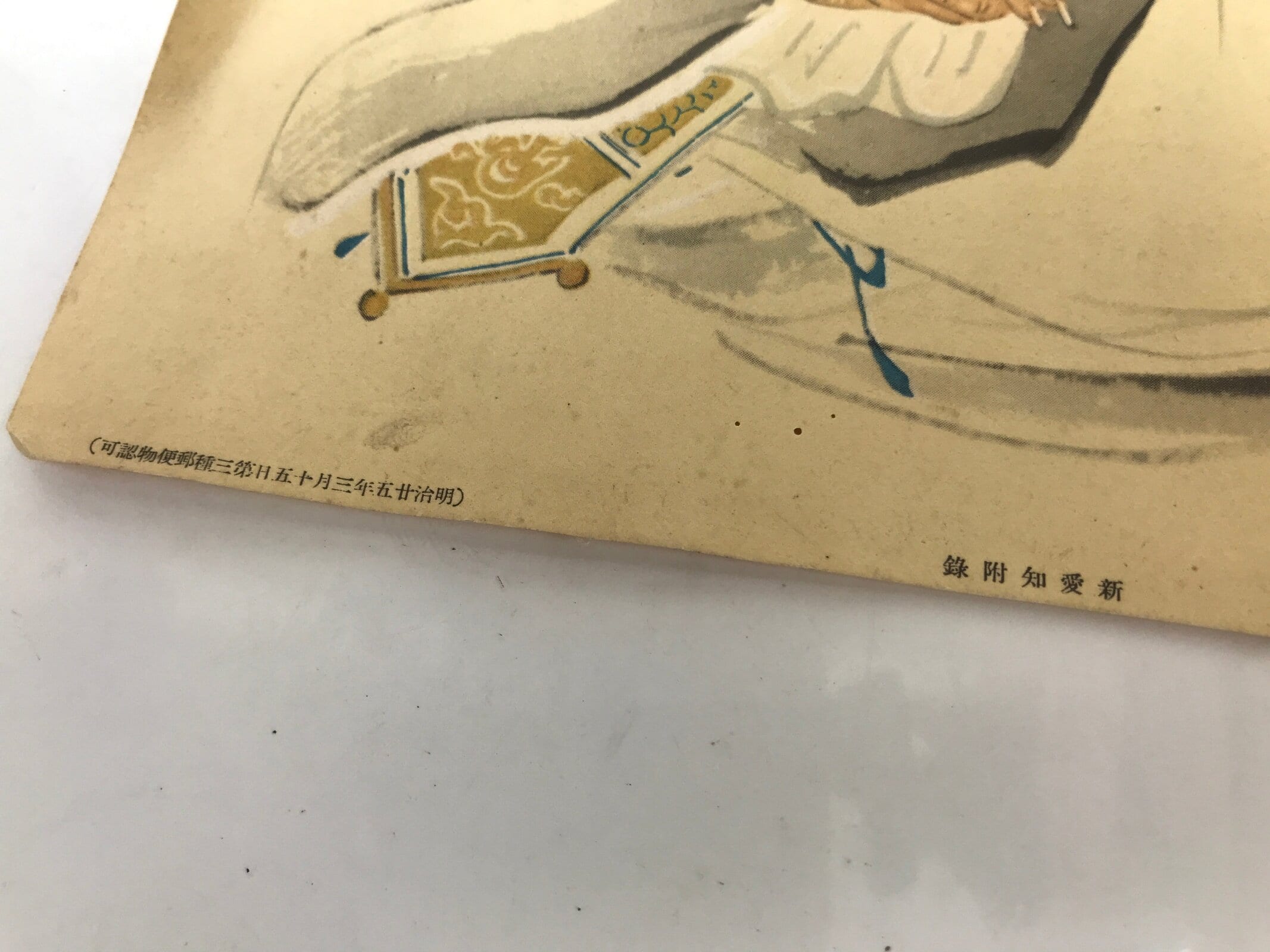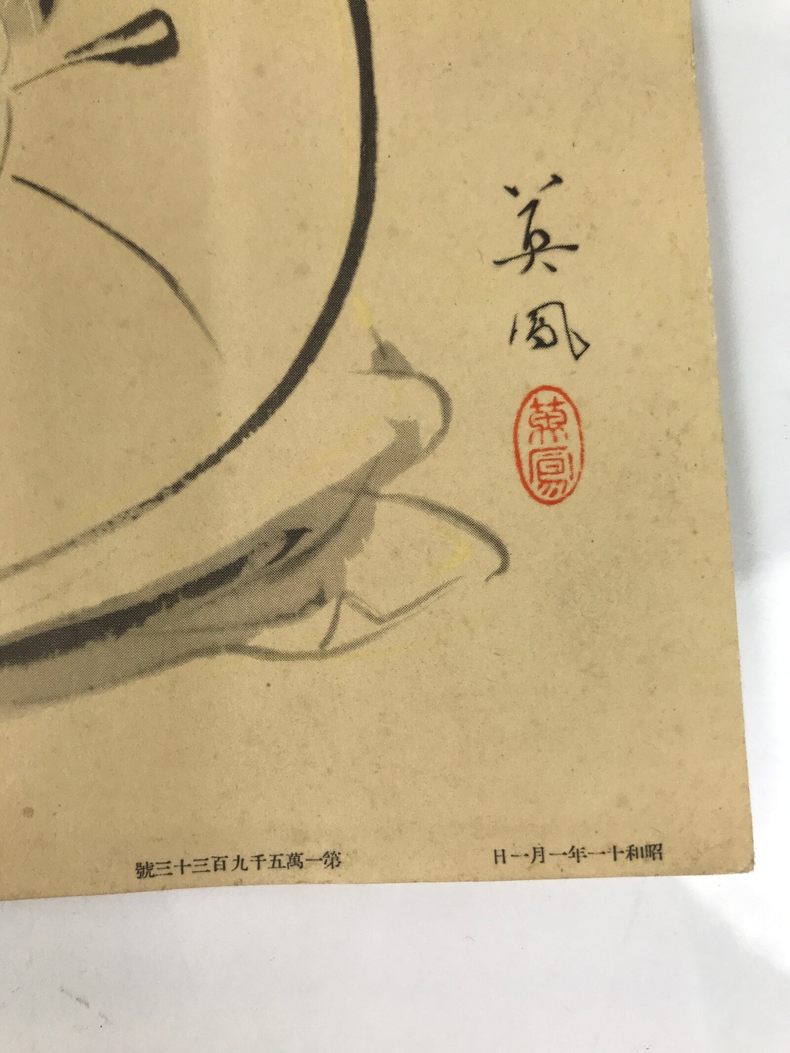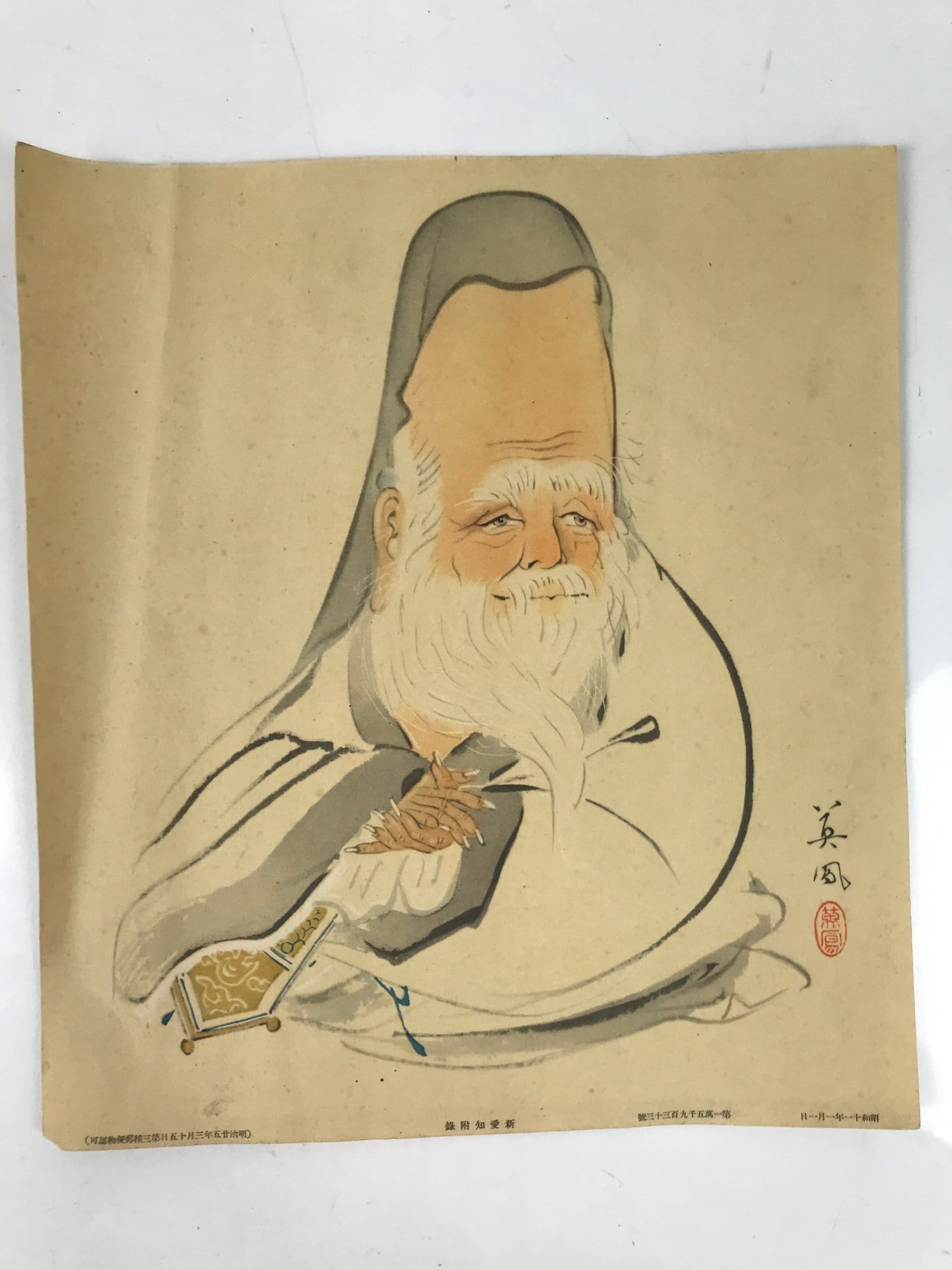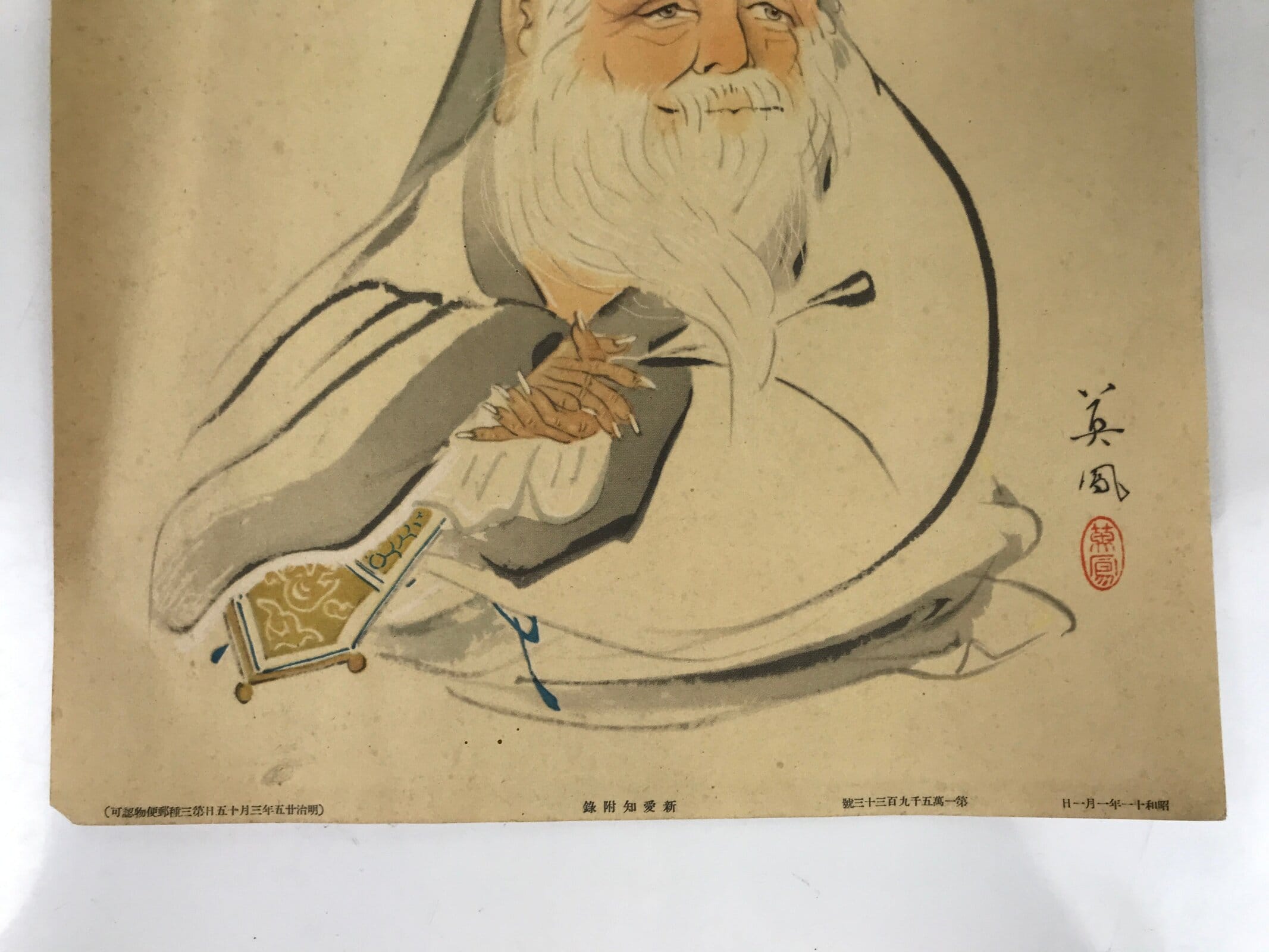 This vintage Japanese print reproduction features Jurojin, one of the Seven Lucky Gods. Jurojin, the god of the elderly, is depicted in his usual look: an old man with a tall forehead and a long white beard. This type of print is a gift that comes with magazines or newspapers.