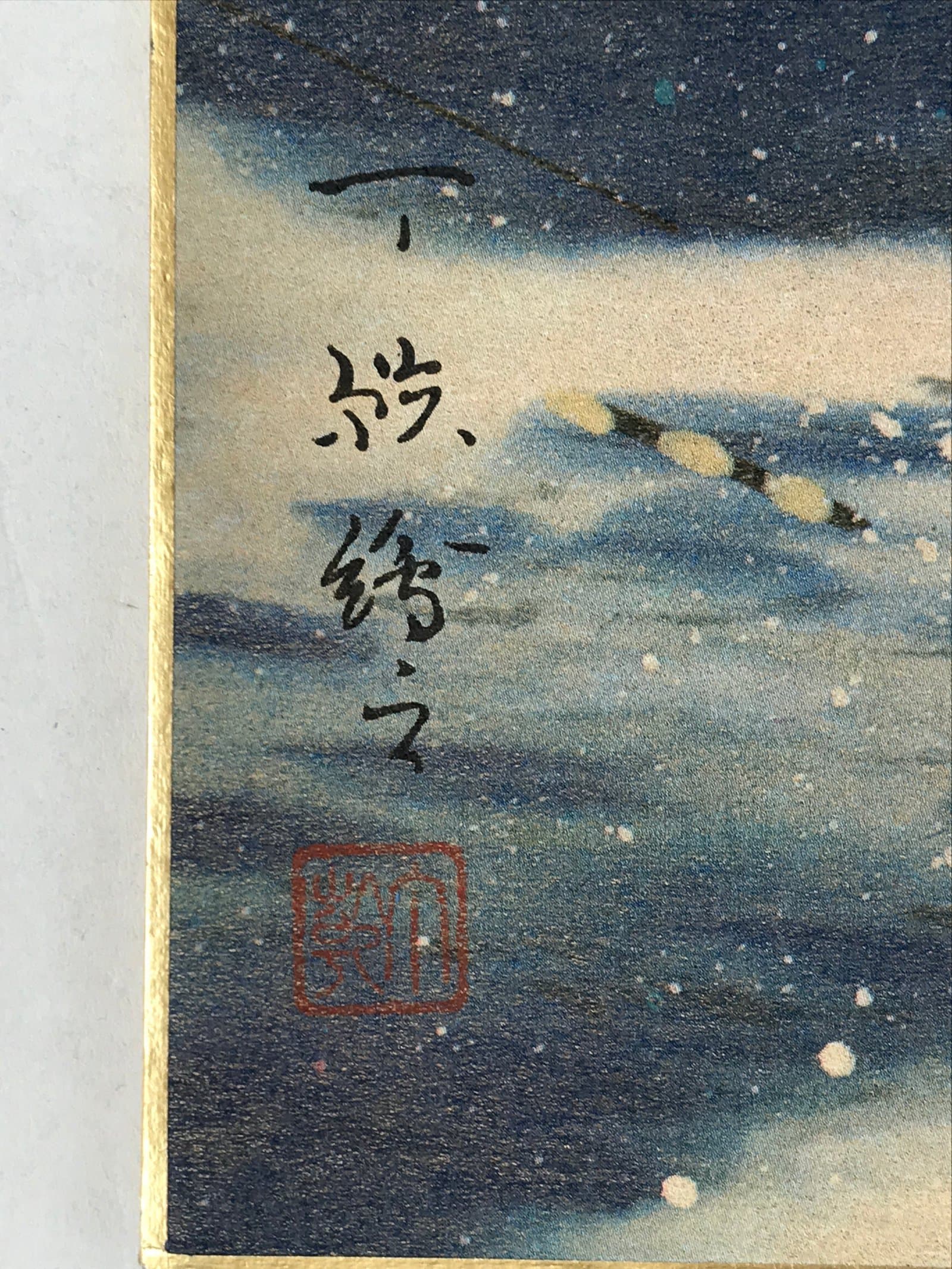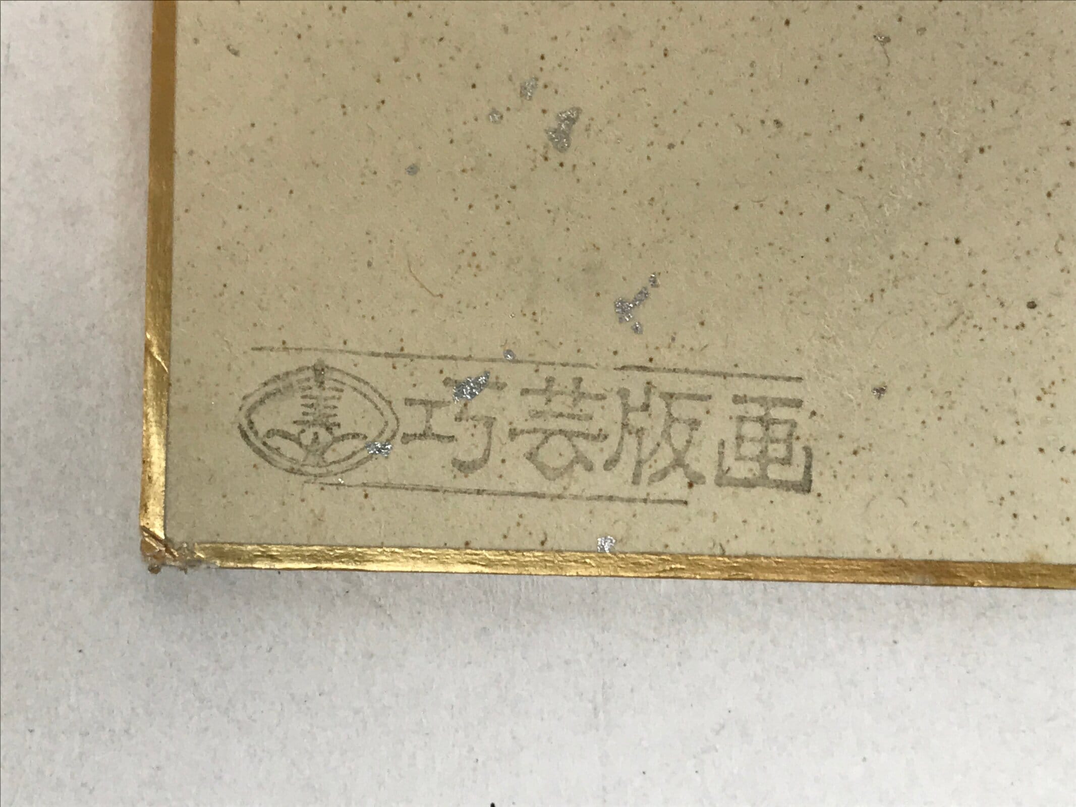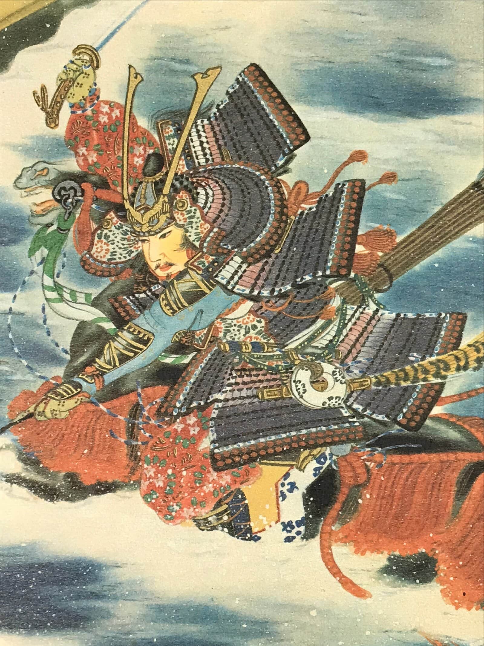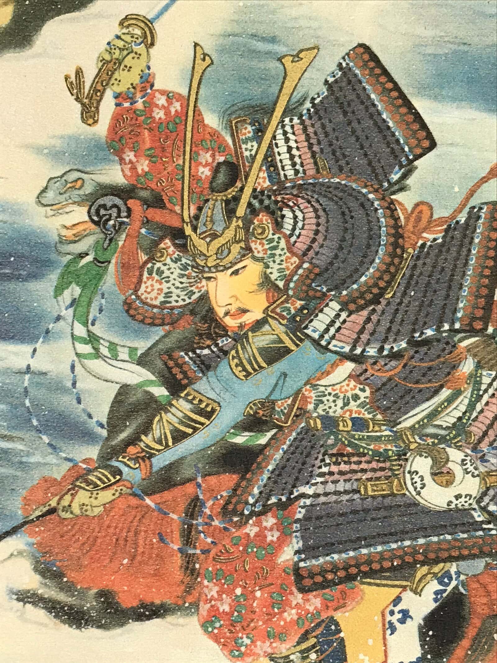 This is a vintage Japanese shikishi art board. It features a printed reproduction of a woodblock painting. The picture represents a man in samurai yoroi armor riding a black horse. This reproduction has some gold foil embellishments. The shikishi art board has a stamp on the back.