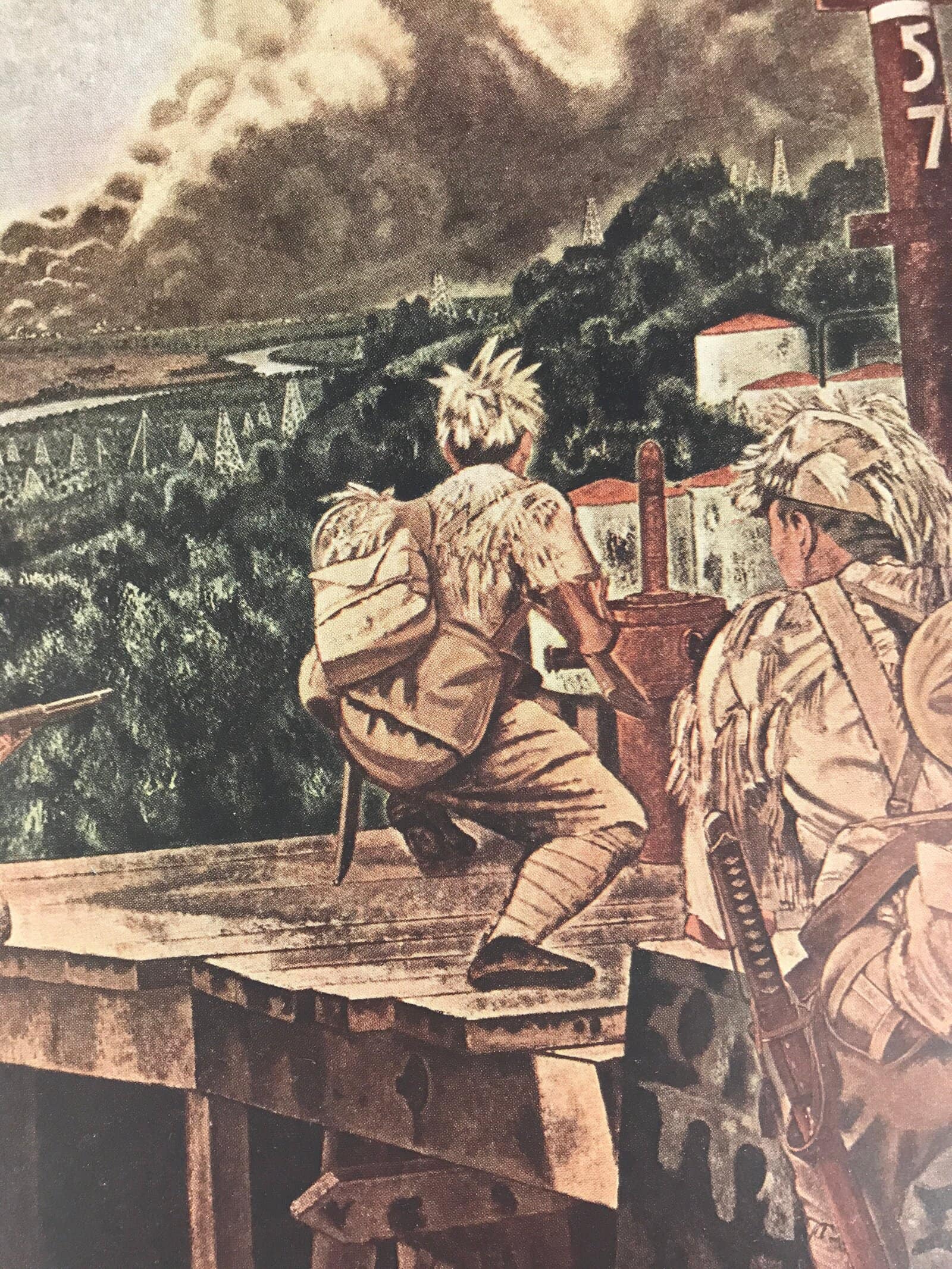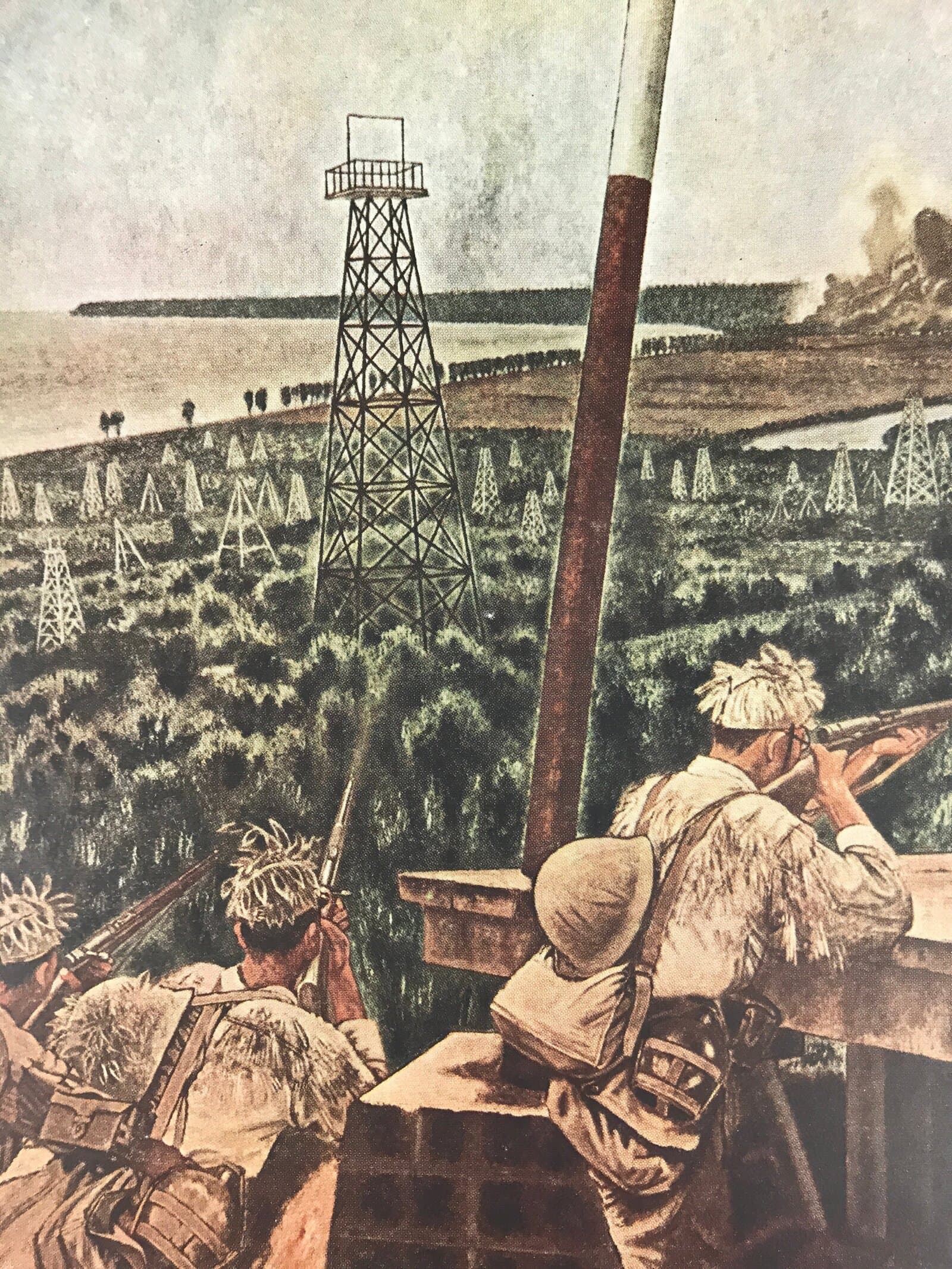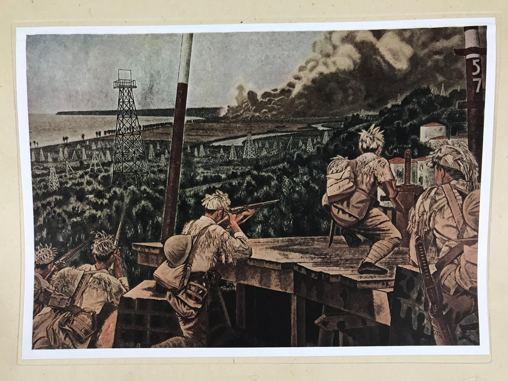 This is a vintage Japanese machine-printed reproduction of a military drawing by Shimizu Toshi. The piece is called ‘Soldiers protecting the area of the Miri oil field’. The oil field located in Miri, actual Malaysia, was a strategic location. The piece is placed on a piece of cardboard with a protective sheet of paper on top, with the title and the name of the painter.