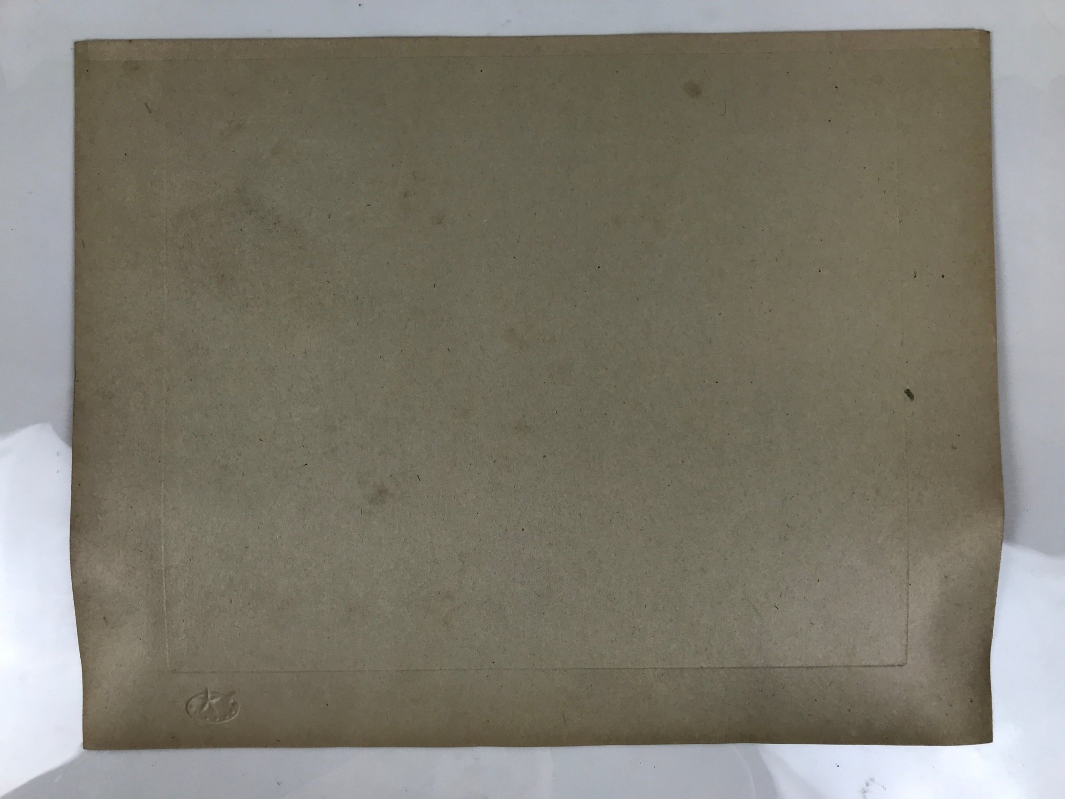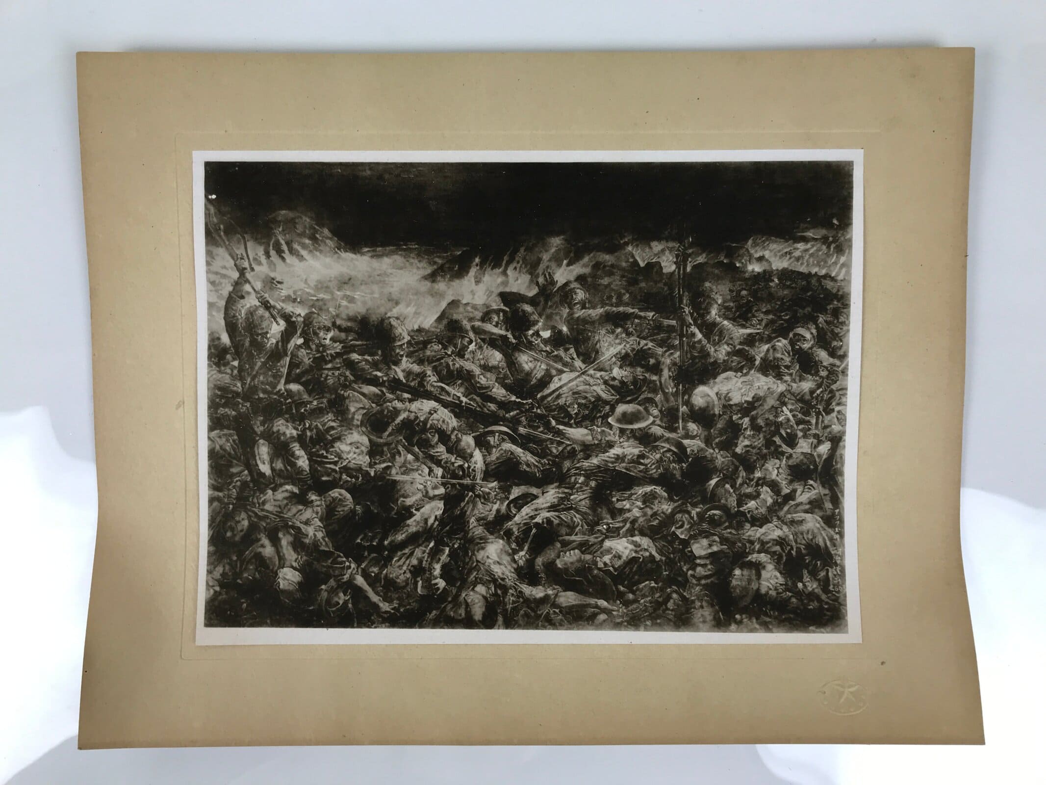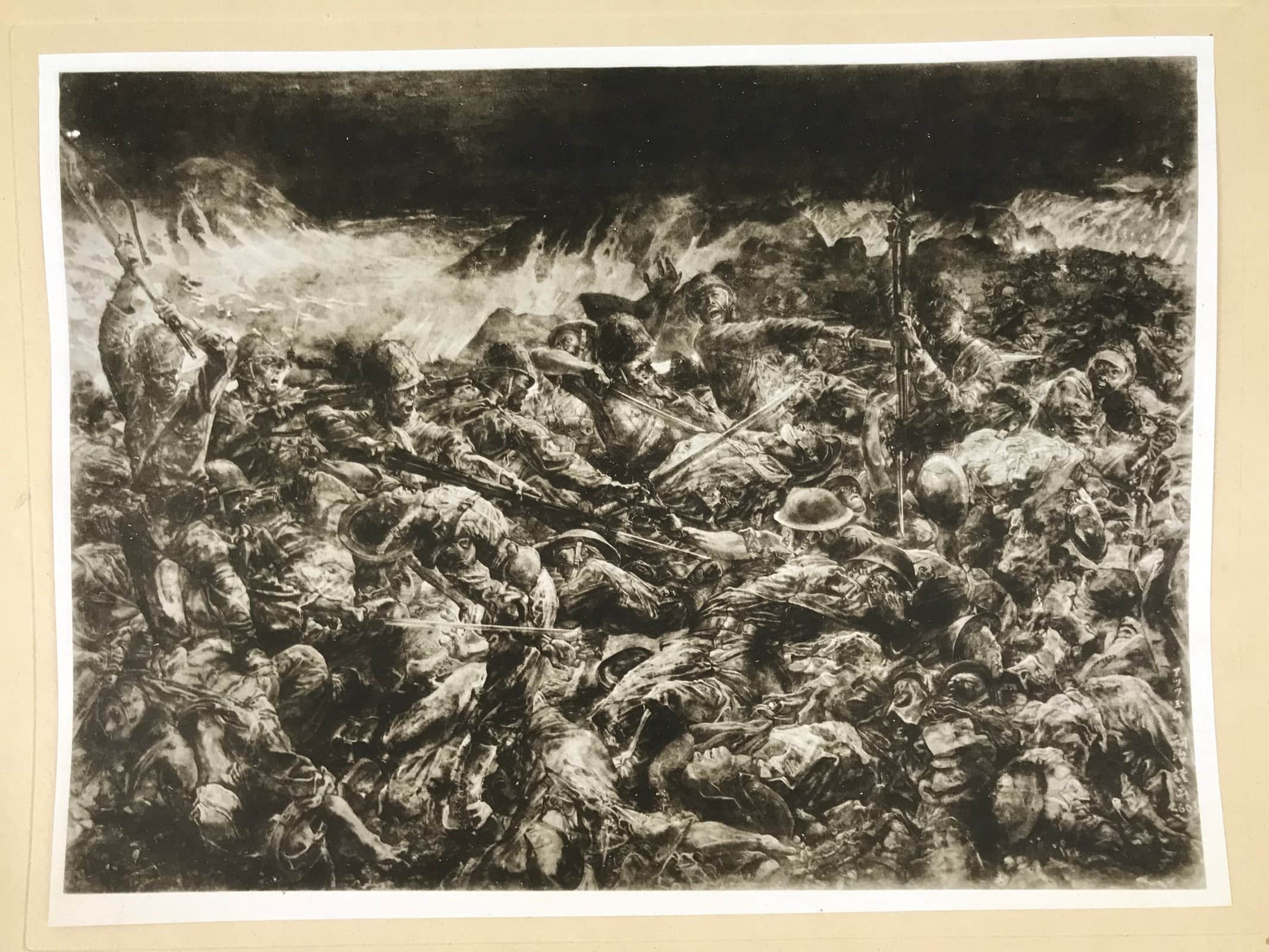 This is a vintage Japanese machine-printed reproduction of a military drawing by Fujita Tsuguharu, also known as Léonard Tsuguharu Foujita. The piece is called ‘Defeat on Attu Island’. The Battle of Attu took place in 1943. It is placed on a piece of cardboard with a protective sheet of paper on top, with explanations in Japanese.