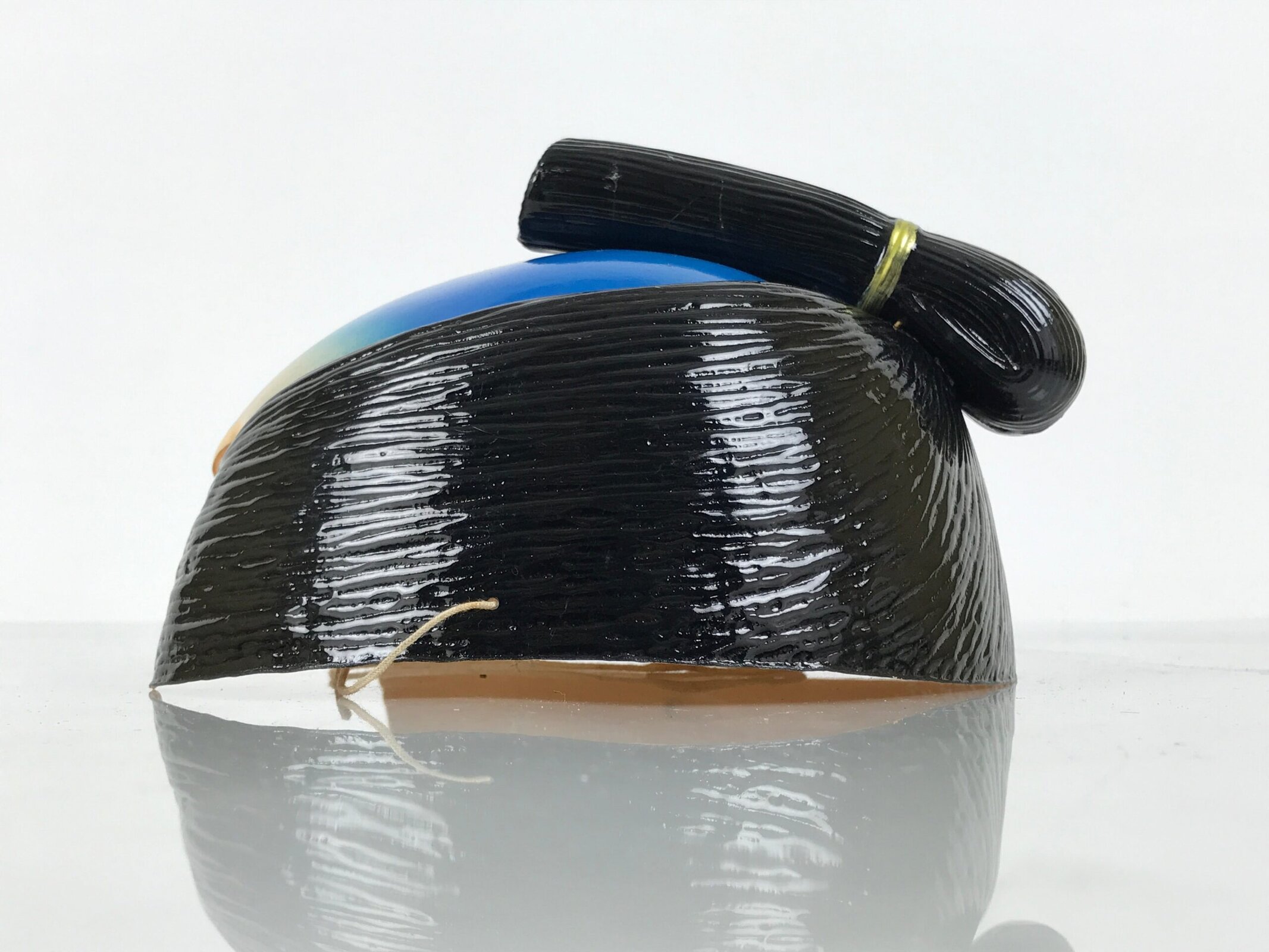 This is a vintage Japanese thin resin plastic wig depicting the traditional chonmage topknot hairstyle made popular by nobles, samurai, and sumo wrestlers. This is mainly made for children for costume and dress-up use, and can also be used in theatre/plays. It has a elastic string.