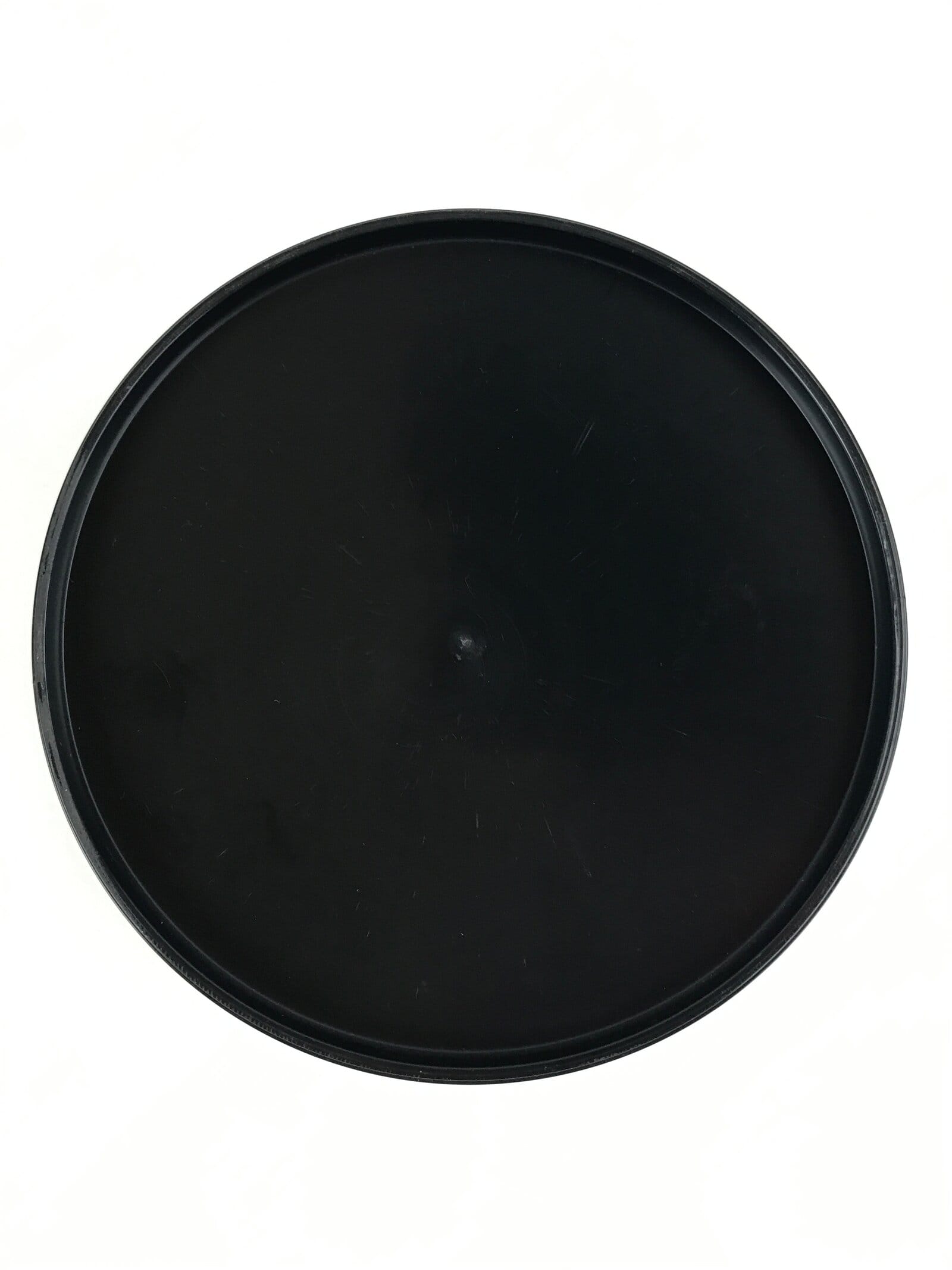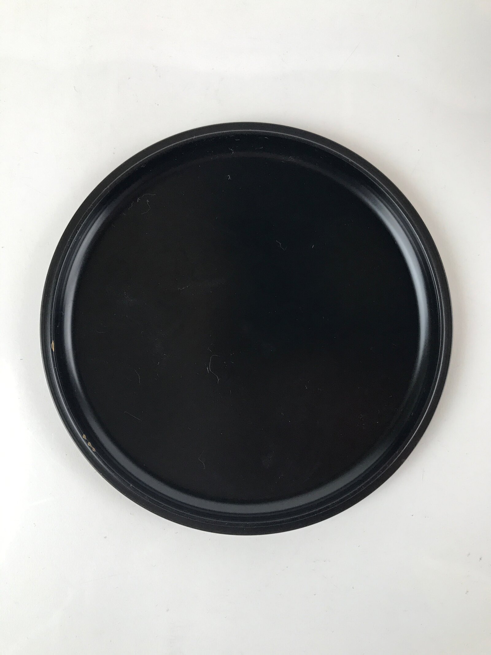 This is a vintage lidded Japanese bento lunch box. While made of sturdy resin plastic, this box is stylized to look like a traditional lacquerware bento box. It is round and painted red on the outside, black on the inside. The lid features a classic plum blossom branch replica makie design in red, white, and gold.