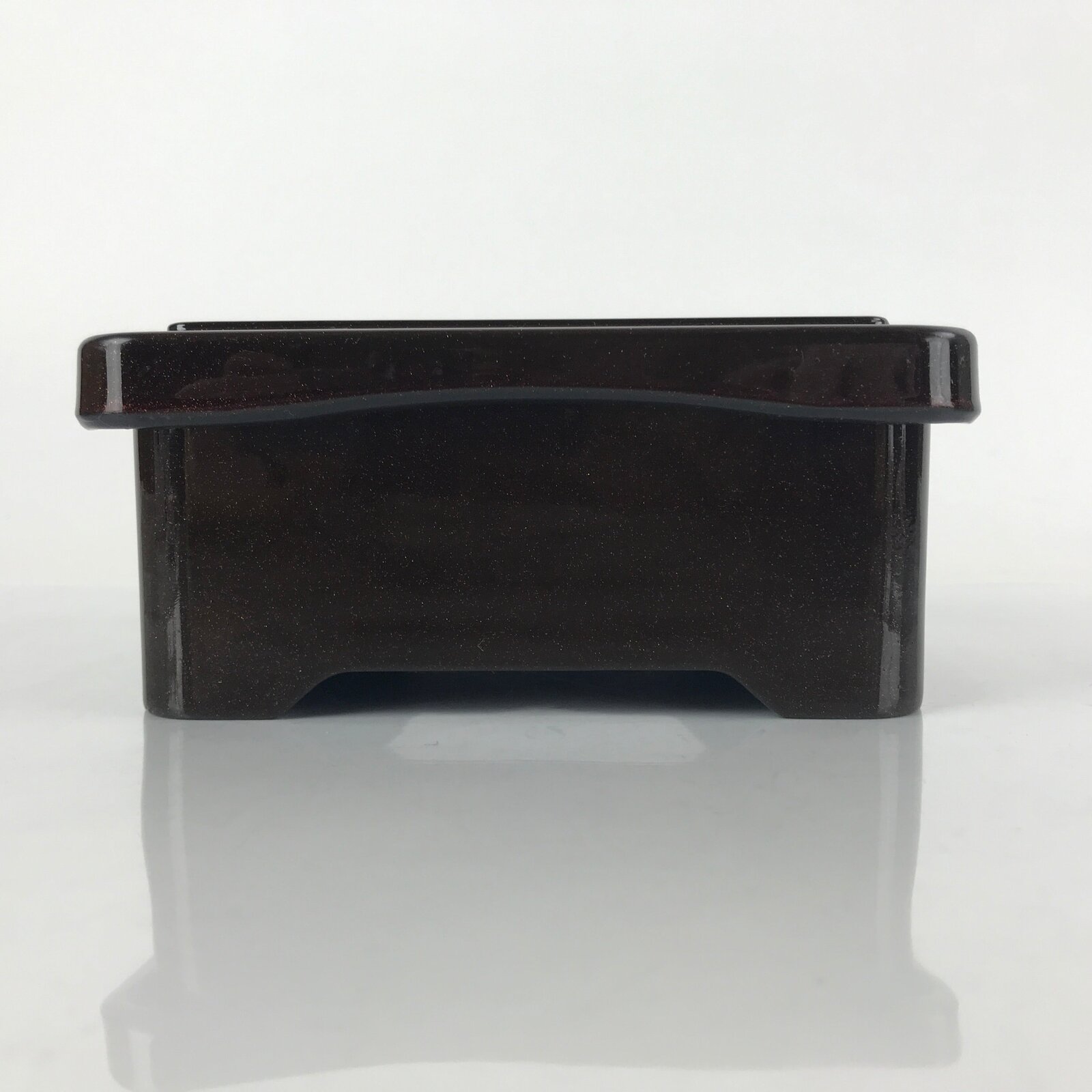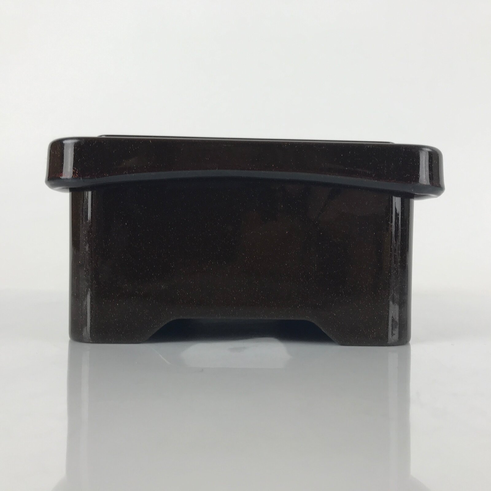 This is a vintage lidded Japanese bento lunch box. While made of sturdy resin plastic, this box is stylized to look like a traditional lacquerware bento box. It is brown with a coppery glitter. Inside is a classic simple red with a black edge. On the lid displays a replica makie design of vine flowers. It does not contain any partitions, however plastic wrappers and lettuce leaves are commonly used for that purpose.