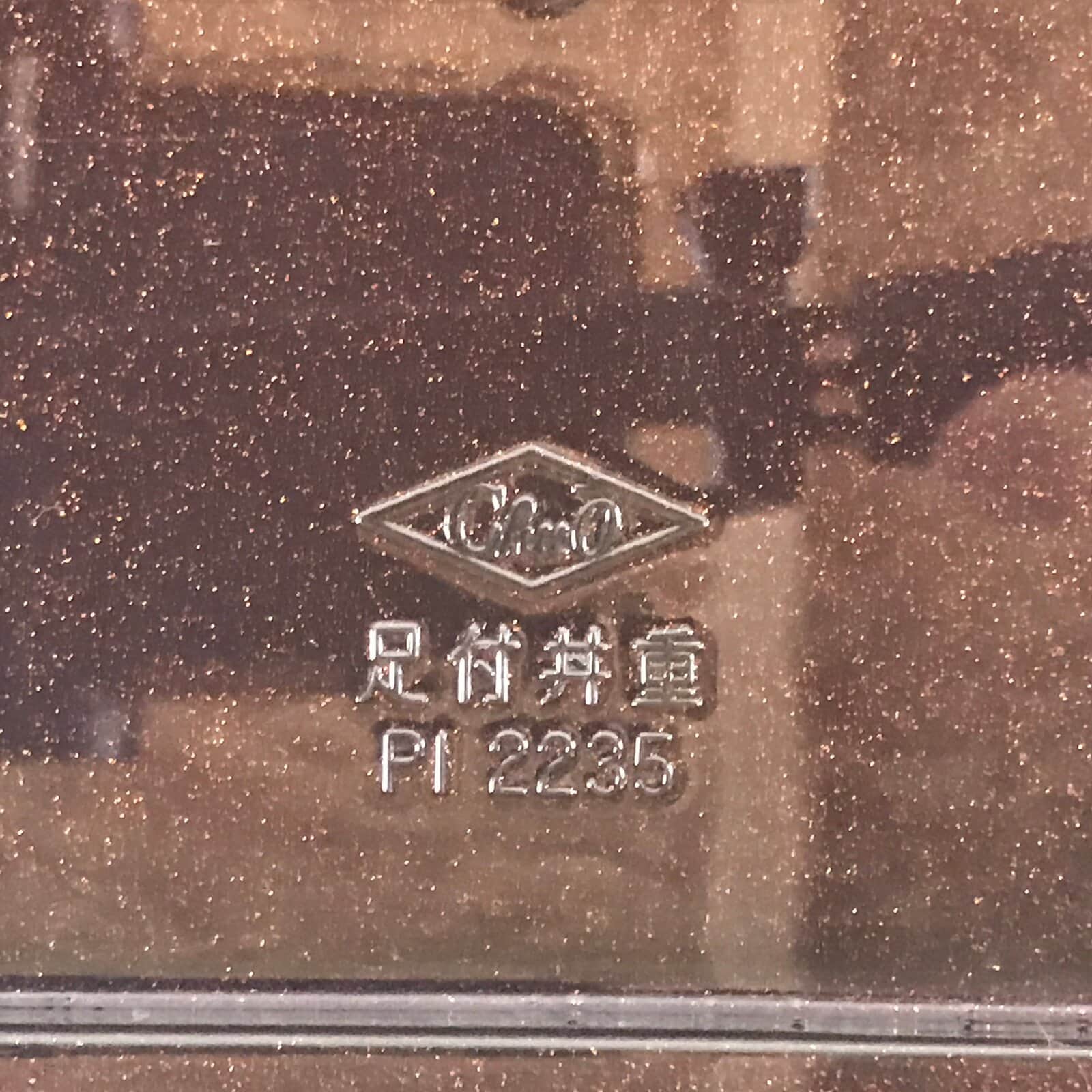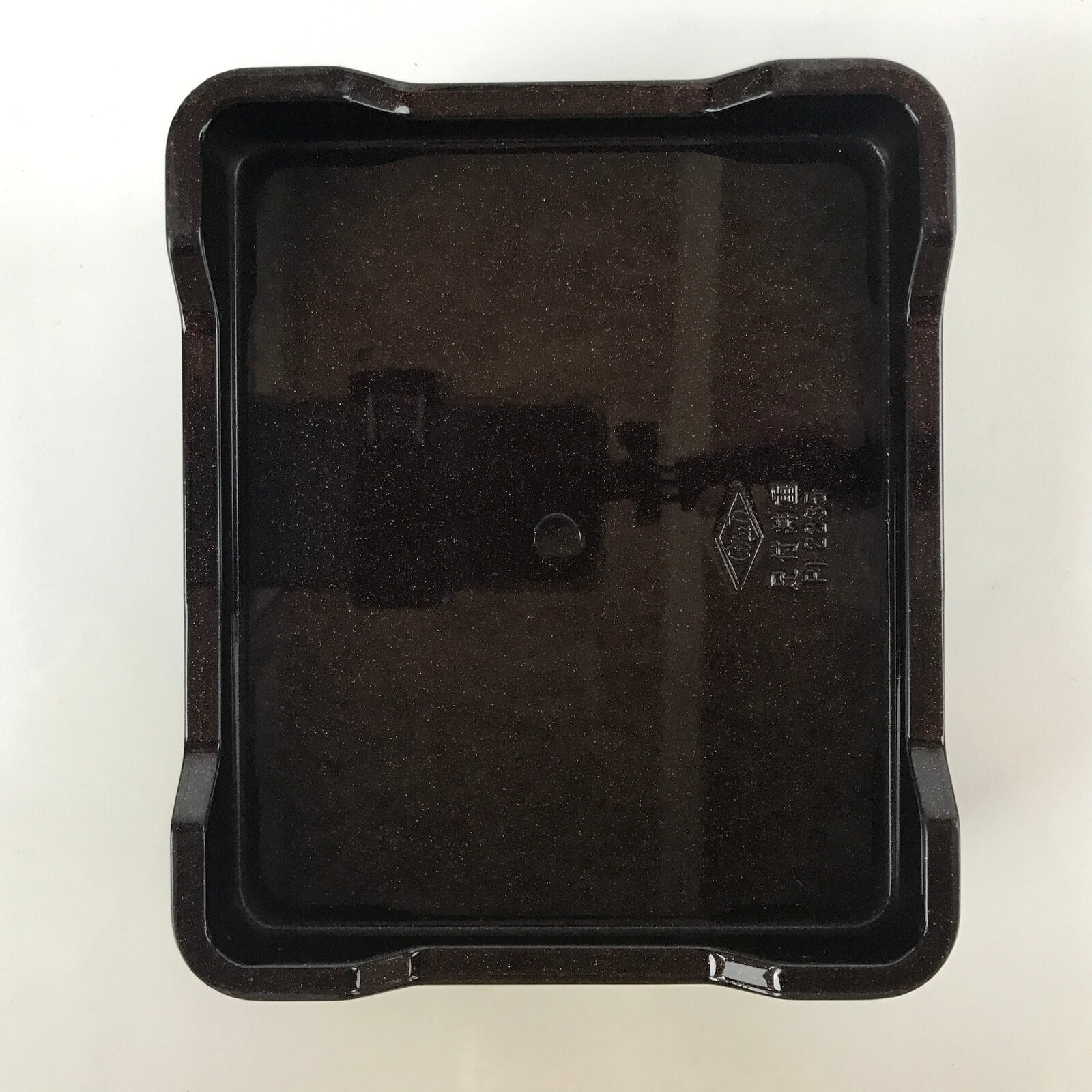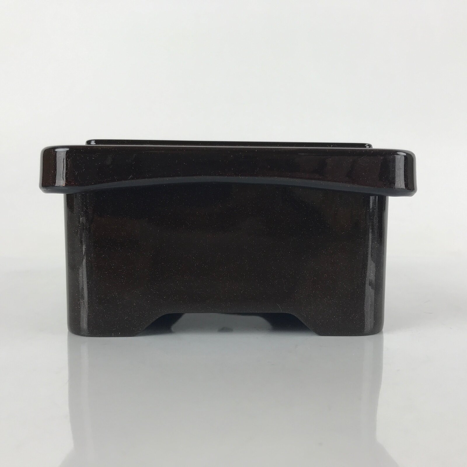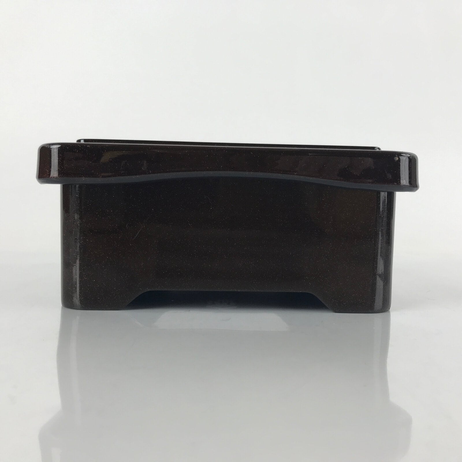 This is a vintage lidded Japanese bento lunch box. While made of sturdy resin plastic, this box is stylized to look like a traditional lacquerware bento box. It is brown with a coppery glitter. Inside is a classic simple red with a black edge. On the lid displays a replica makie design of vine flowers. It does not contain any partitions, however plastic wrappers and lettuce leaves are commonly used for that purpose.
