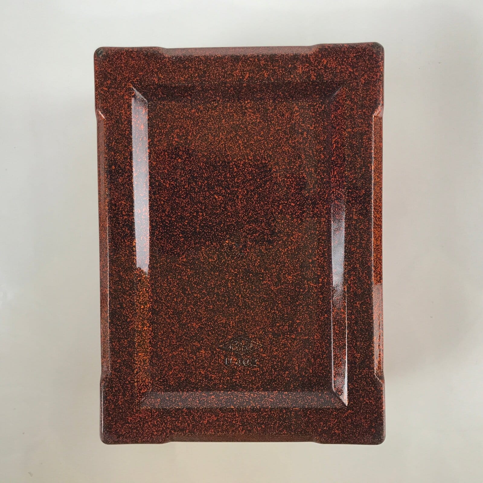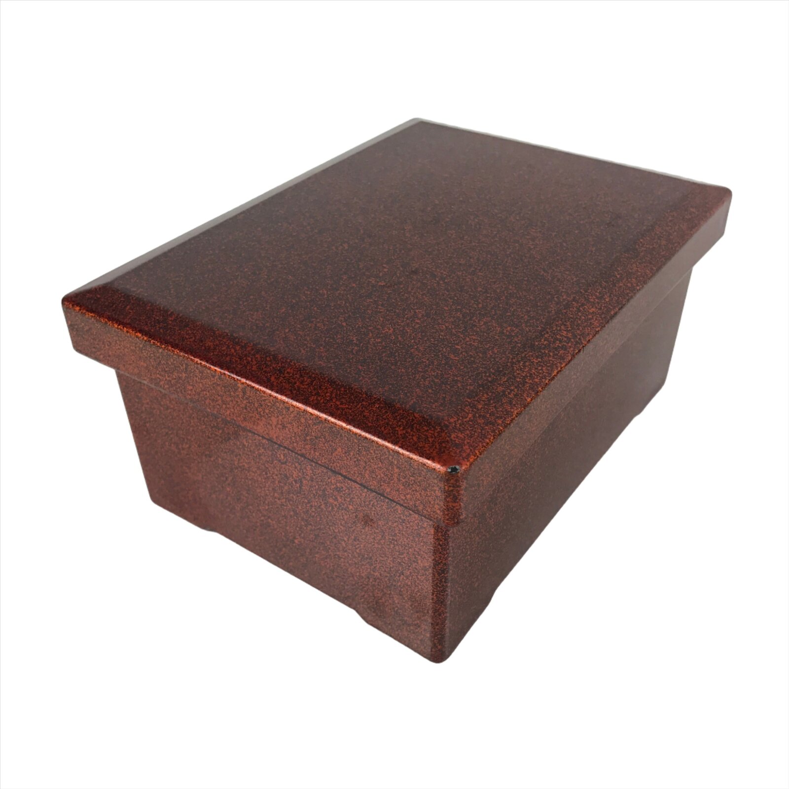 This is a vintage lidded Japanese bento lunch box. While made of sturdy resin plastic, this box is stylized to look like a traditional lacquerware bento box. It is a glittery copper orange color with a plain red inside and black rim. There are no partitions, however ones are often made with small plastic wrappers or lettuce leaves.