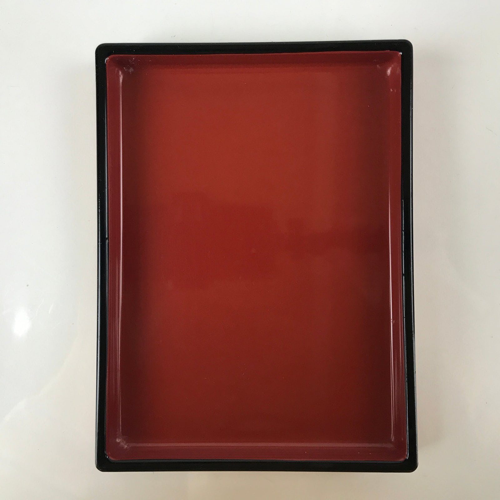 This is a vintage lidded Japanese bento lunch box. While made of sturdy resin plastic, this box is stylized to look like a traditional lacquerware bento box. It is a glittery copper orange color with a plain red inside and black rim. There are no partitions, however ones are often made with small plastic wrappers or lettuce leaves.