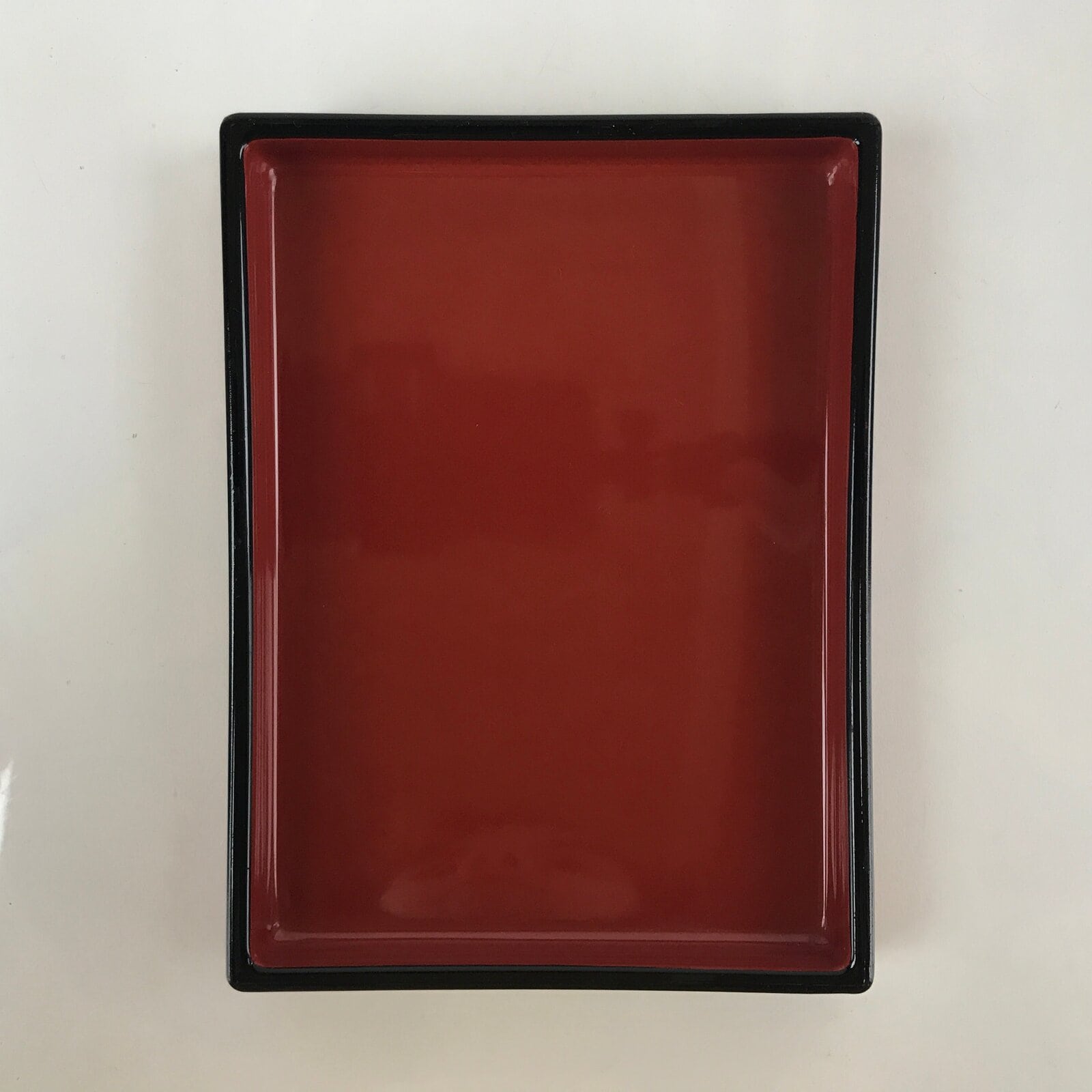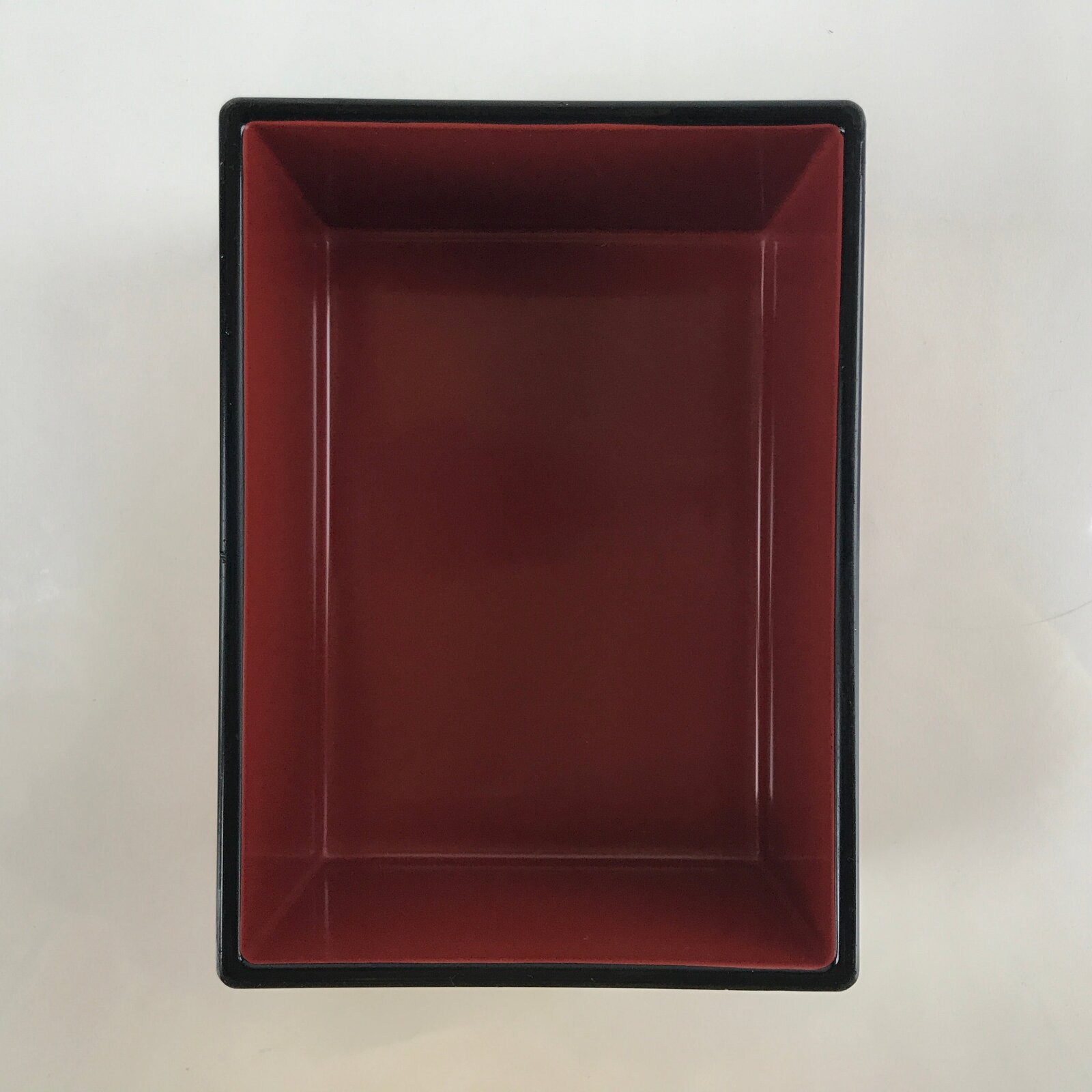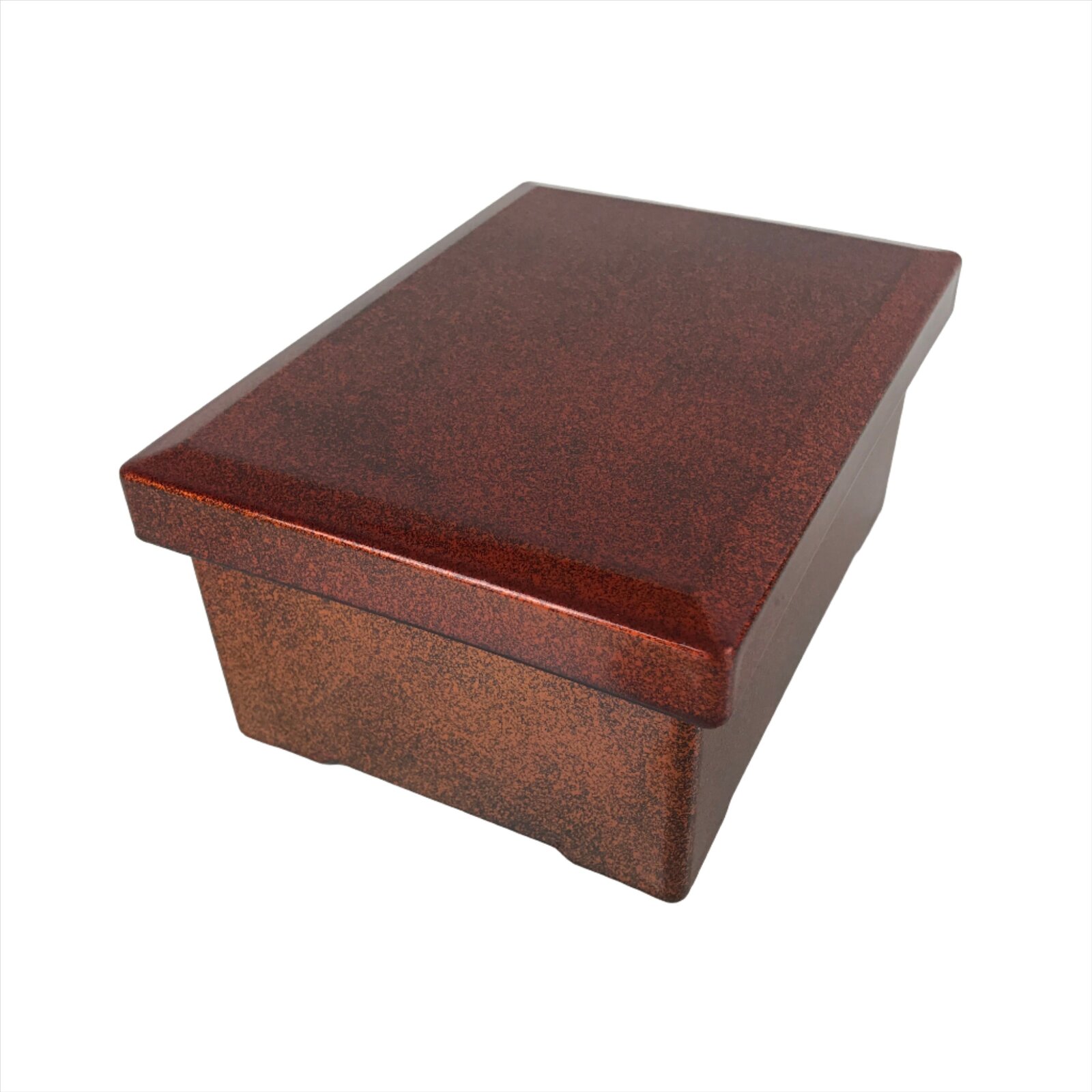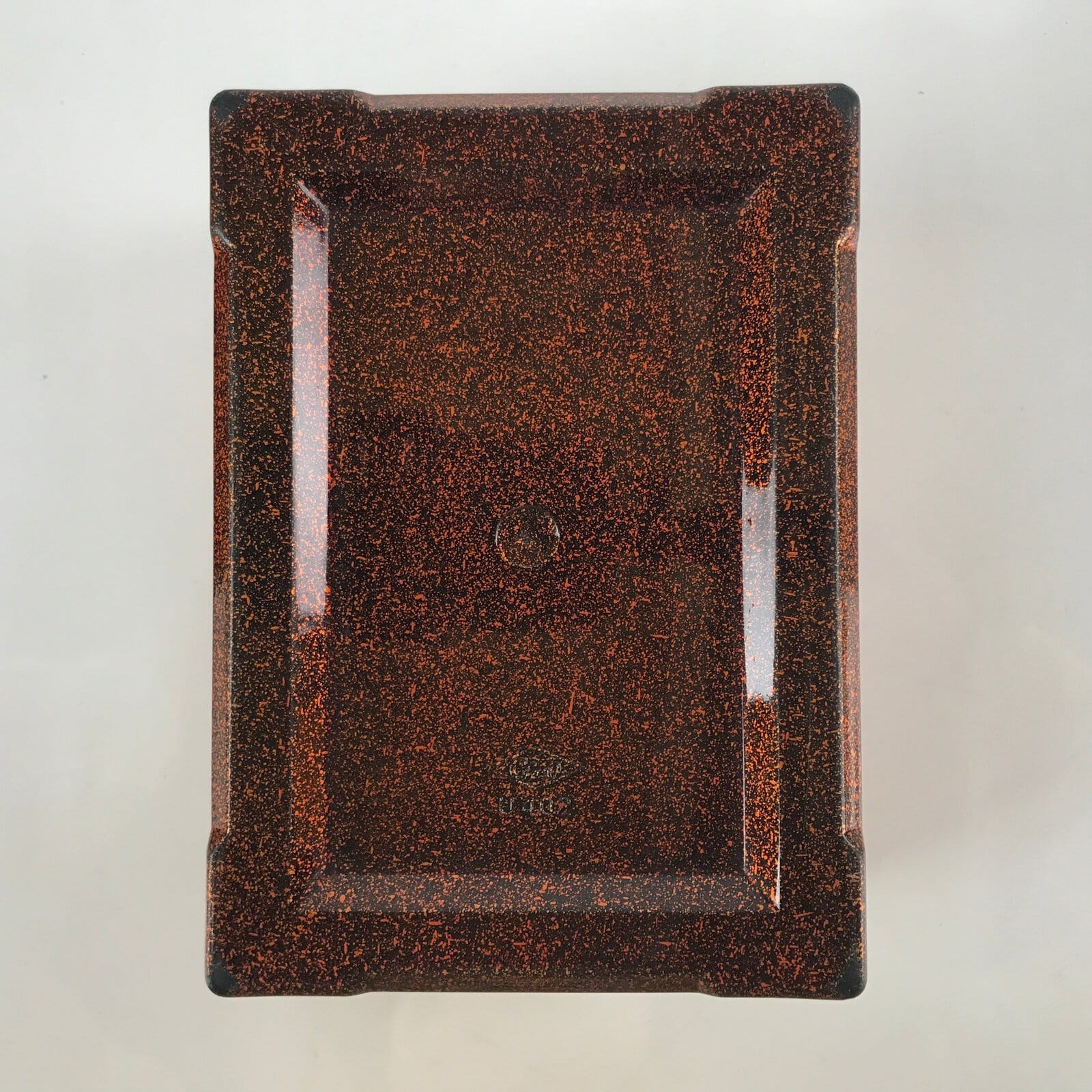 This is a vintage lidded Japanese bento lunch box. While made of sturdy resin plastic, this box is stylized to look like a traditional lacquerware bento box. It is a glittery copper orange color with a plain red inside and black rim. There are no partitions, however ones are often made with small plastic wrappers or lettuce leaves.
