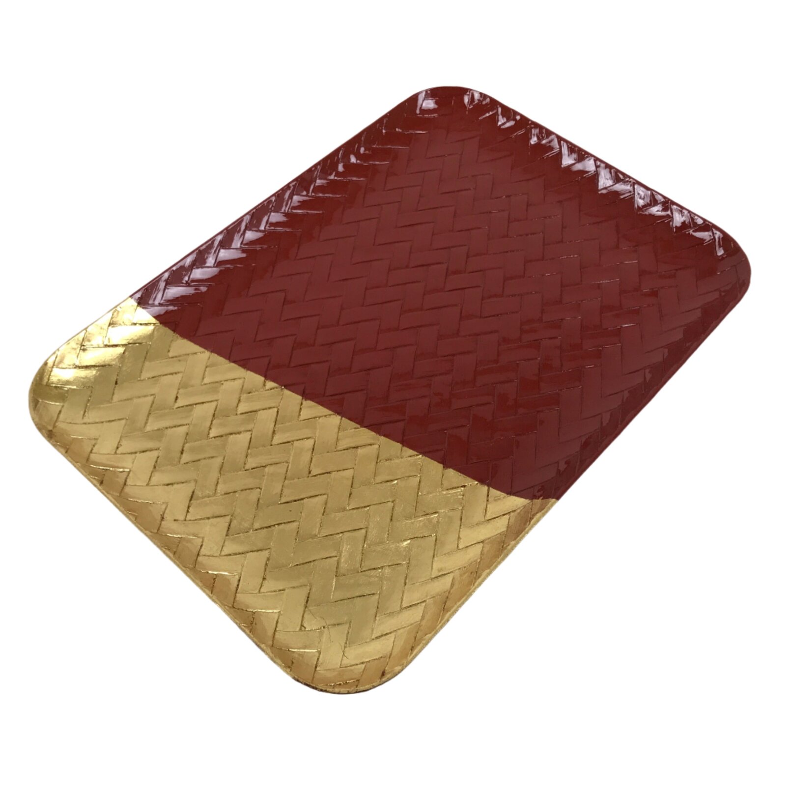 This is a Japanese vintage small serving tray made of resin. This bold red and gold-painted tray is made to mimic rantai, a style of lacquerware that coats a woven bamboo tray, box, or basket with shiny lacquer. This size of tray is perfect for serving sweets or holding trinkets and jewelry. It comes with the original paper box.