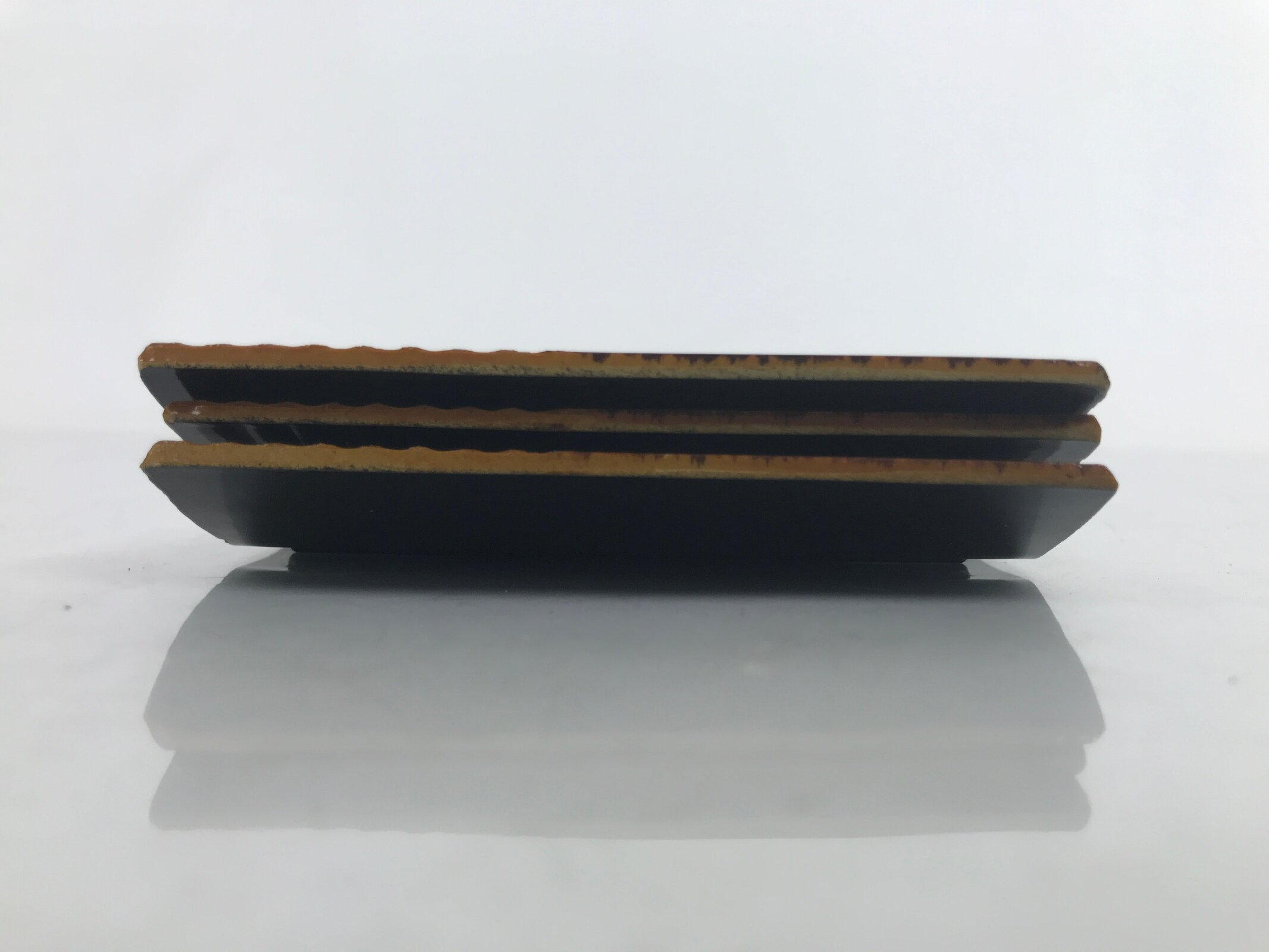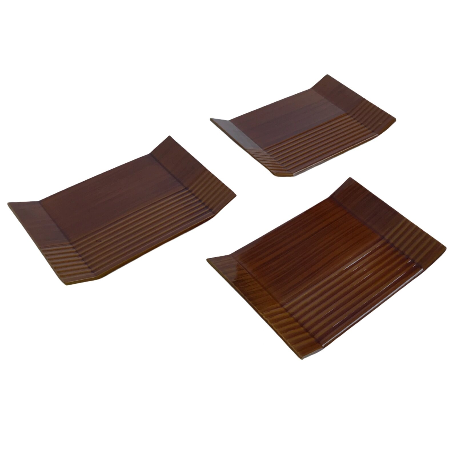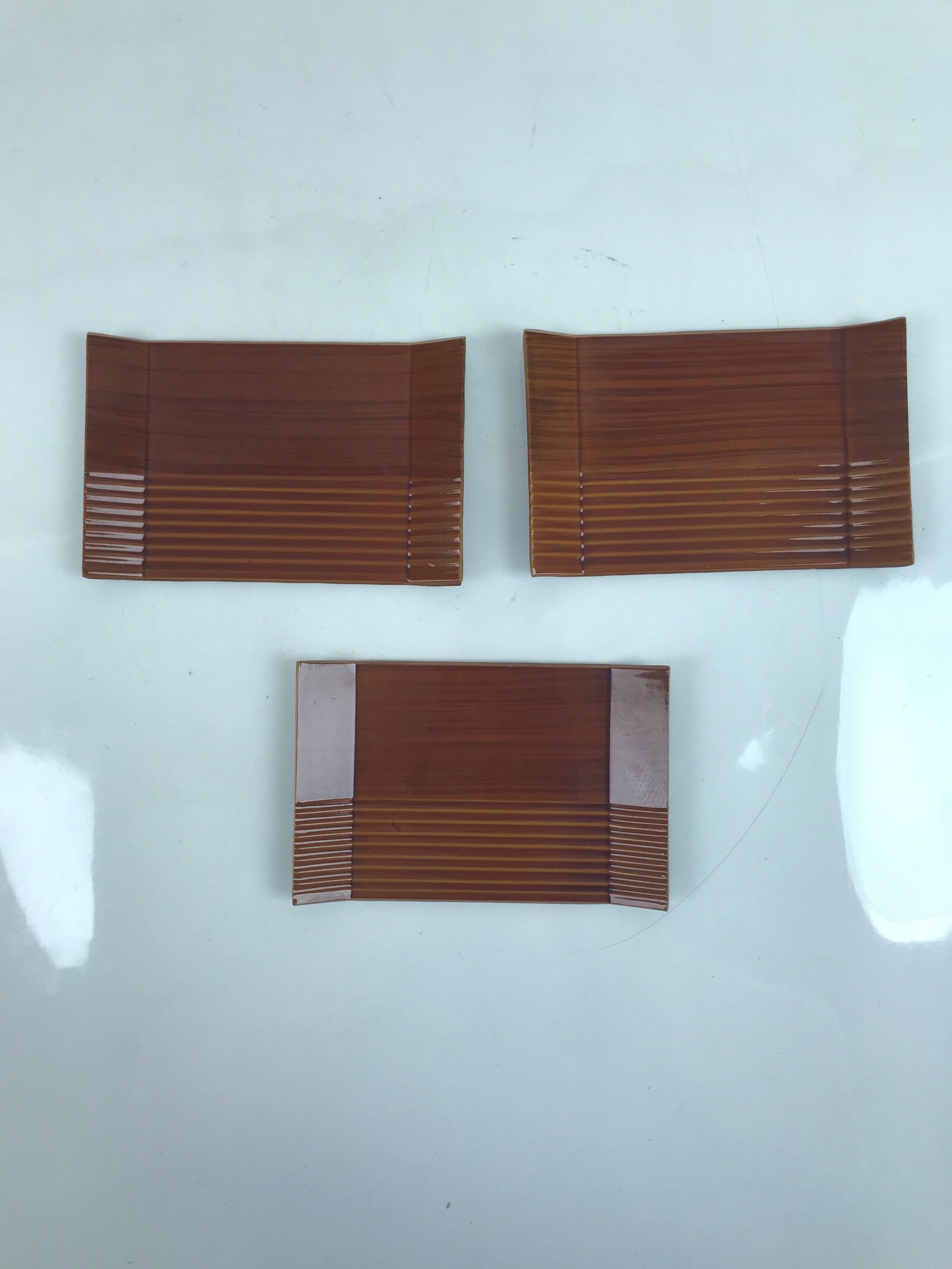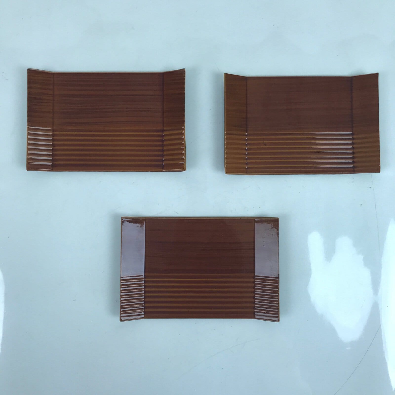 This is a set of vintage Japanese small plates (meimeizara). This set of three plates is made of plastic resin and has the replica look of traditional Hida Shunkei style lacquerware. It is a caramel brown color with a subtle line design and faux wood grain. These can also be used as coasters or as trinket trays.