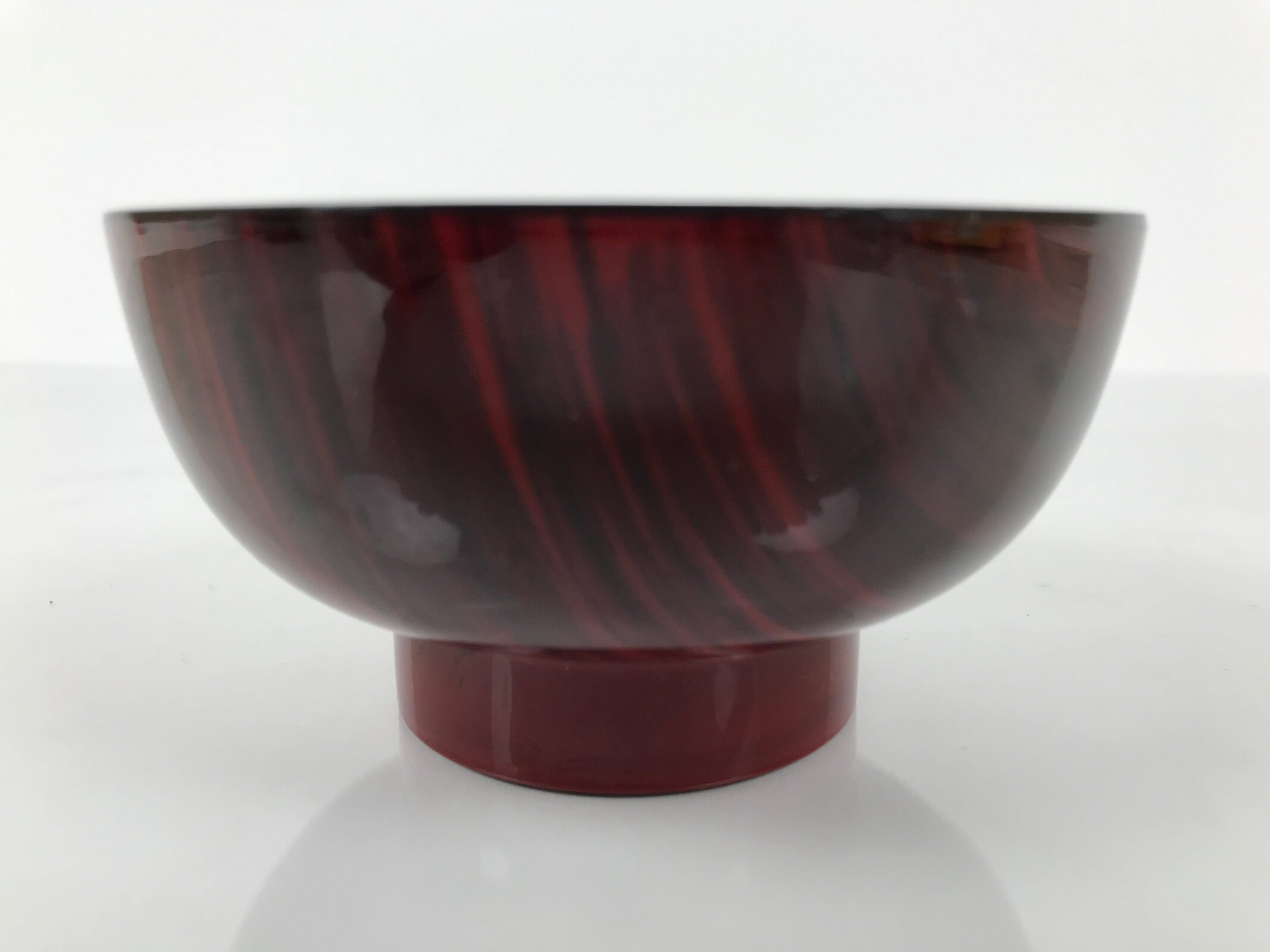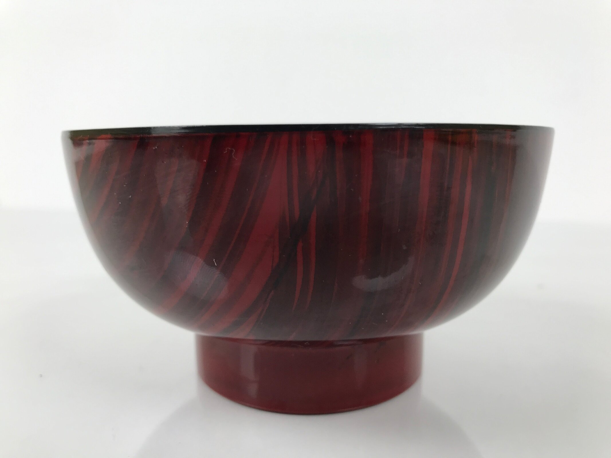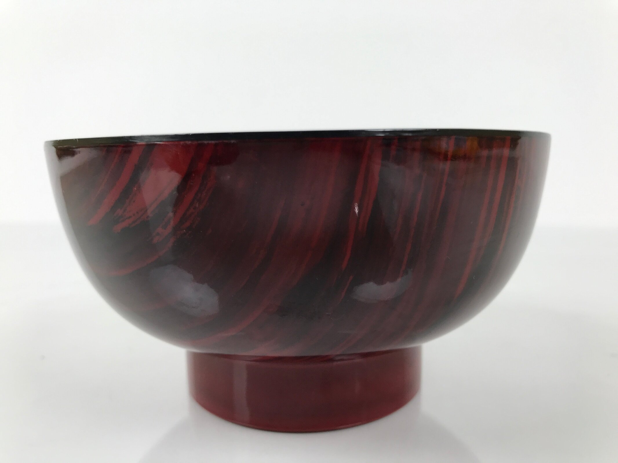 This is a vintage Japanese soup bowl, owan, typically used for serving rice, miso soup, or other kinds of soup. This lacquerware replica bowl is red and has a design on the outside, resembling a brushed mark with black ink. This easy-to-use bowl is a good addition to a traditional Japanese dinnerware set.