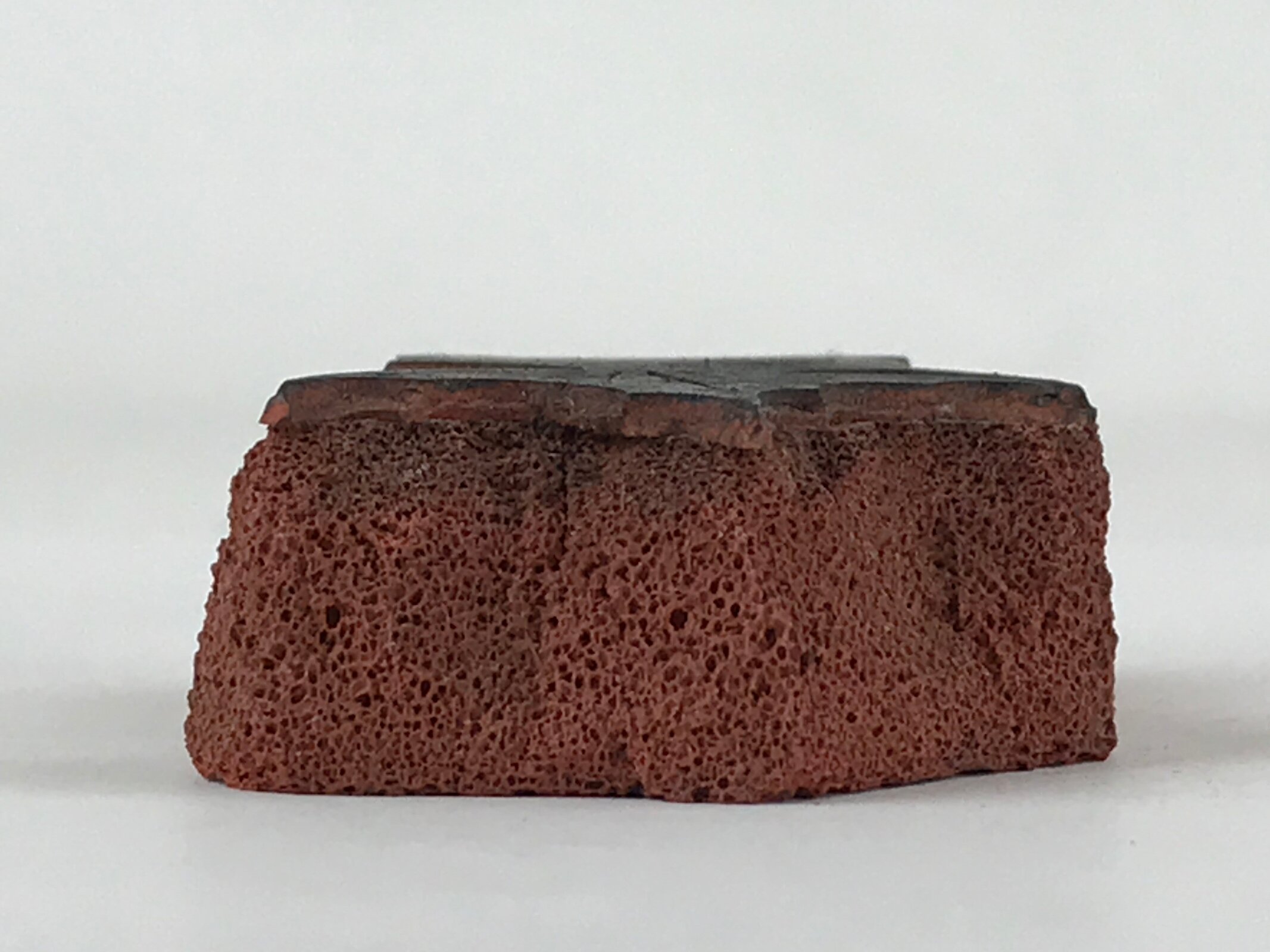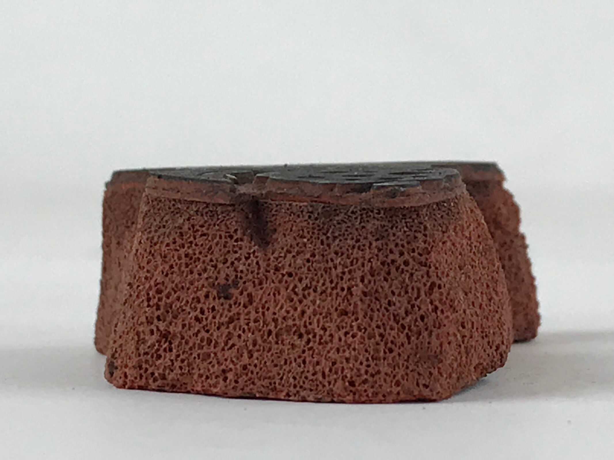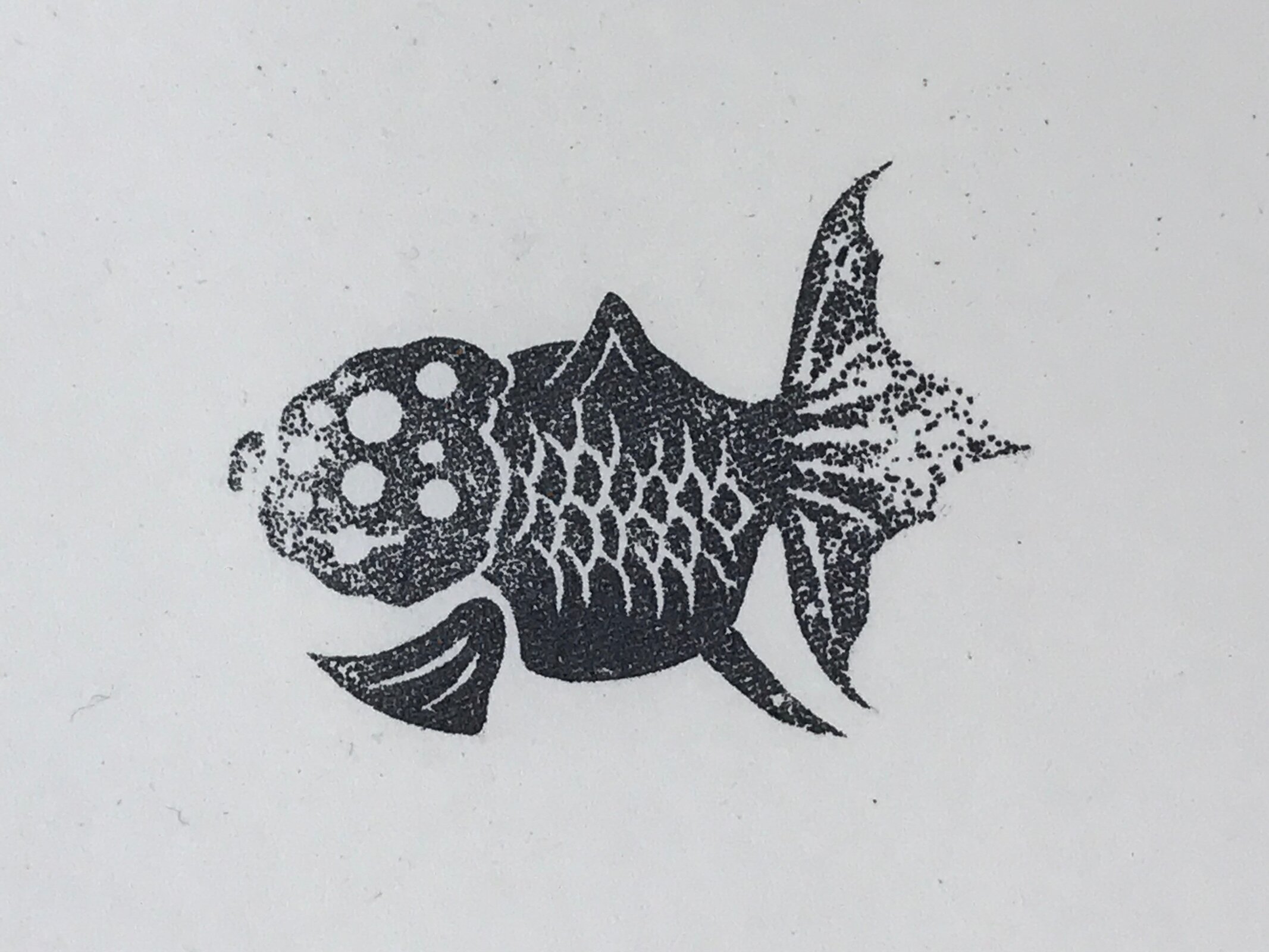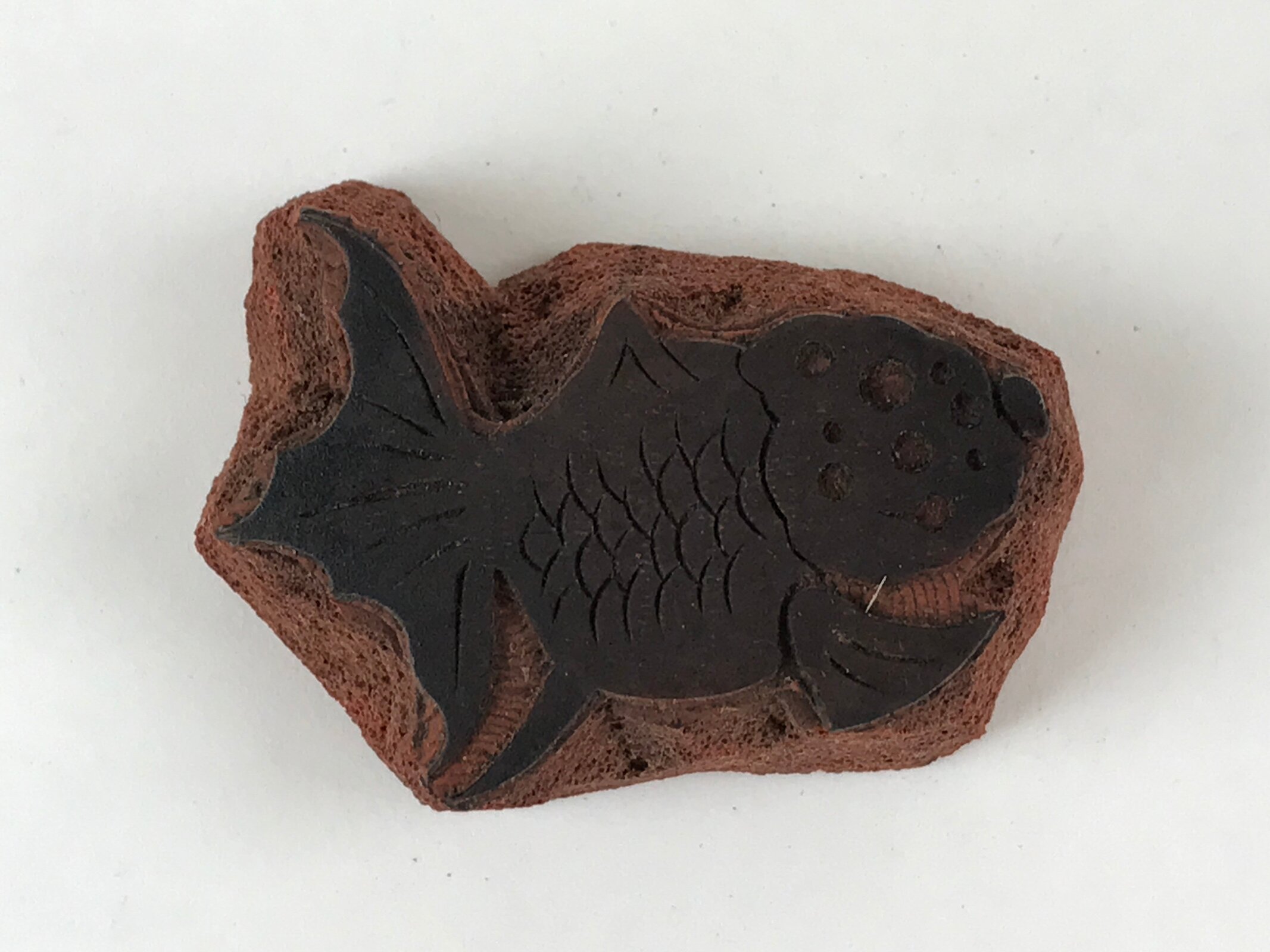 This is a Japanese vintage rubber stamp attached to a sponge-like base. The stamp features a goldfish with a big head, a Ranchu goldfish. The sponge base has hardened. This stamp can be used as it or you can remove the rubber to place it on another base.