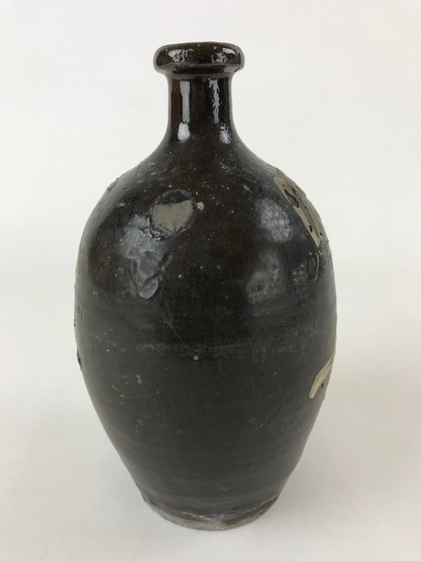 This is a vintage Japanese ceramic sake bottle. It is called a Kayoi-Tokkuri and is used to pour sake. The commuting sake bottle became popular as a rental container for liquor stores in the Edo period when sake began to be consumed on a daily basis. This sake bottle has a dark brown color with white Japanese characters hand-written on the outside.