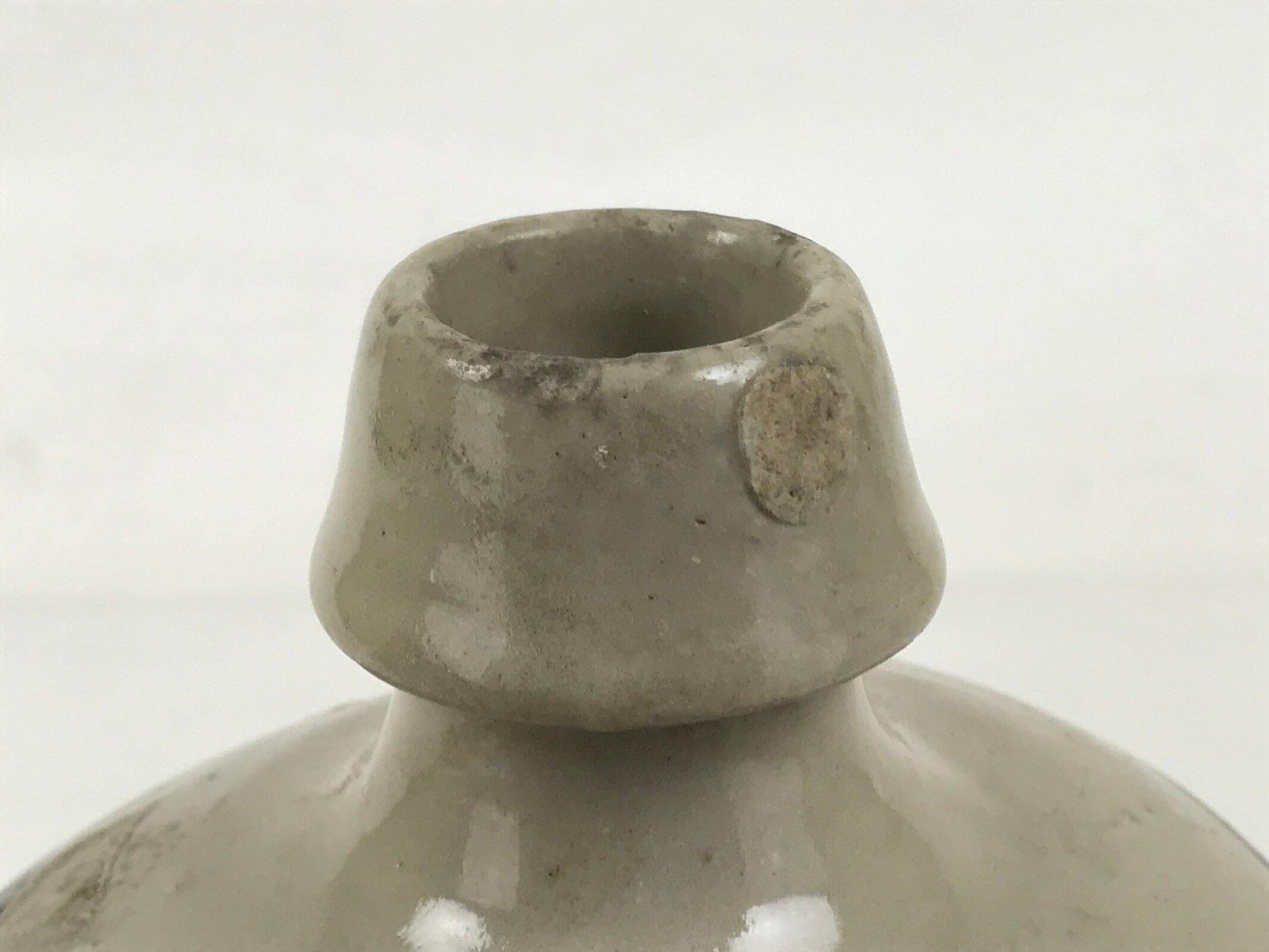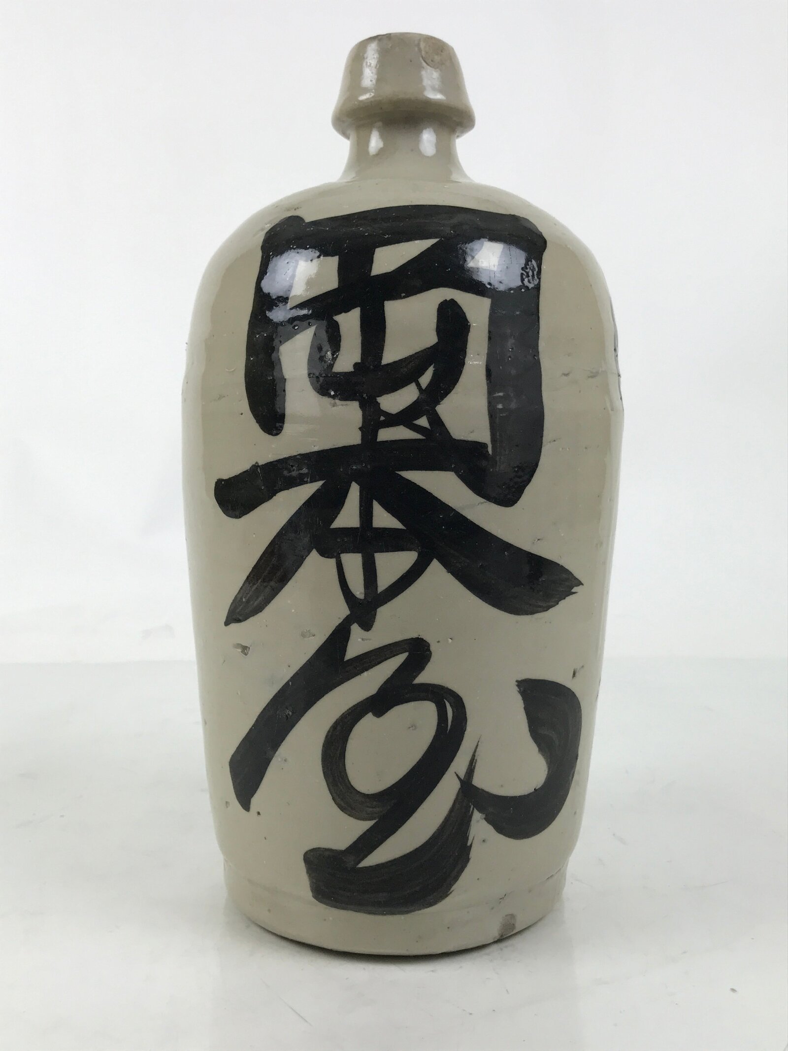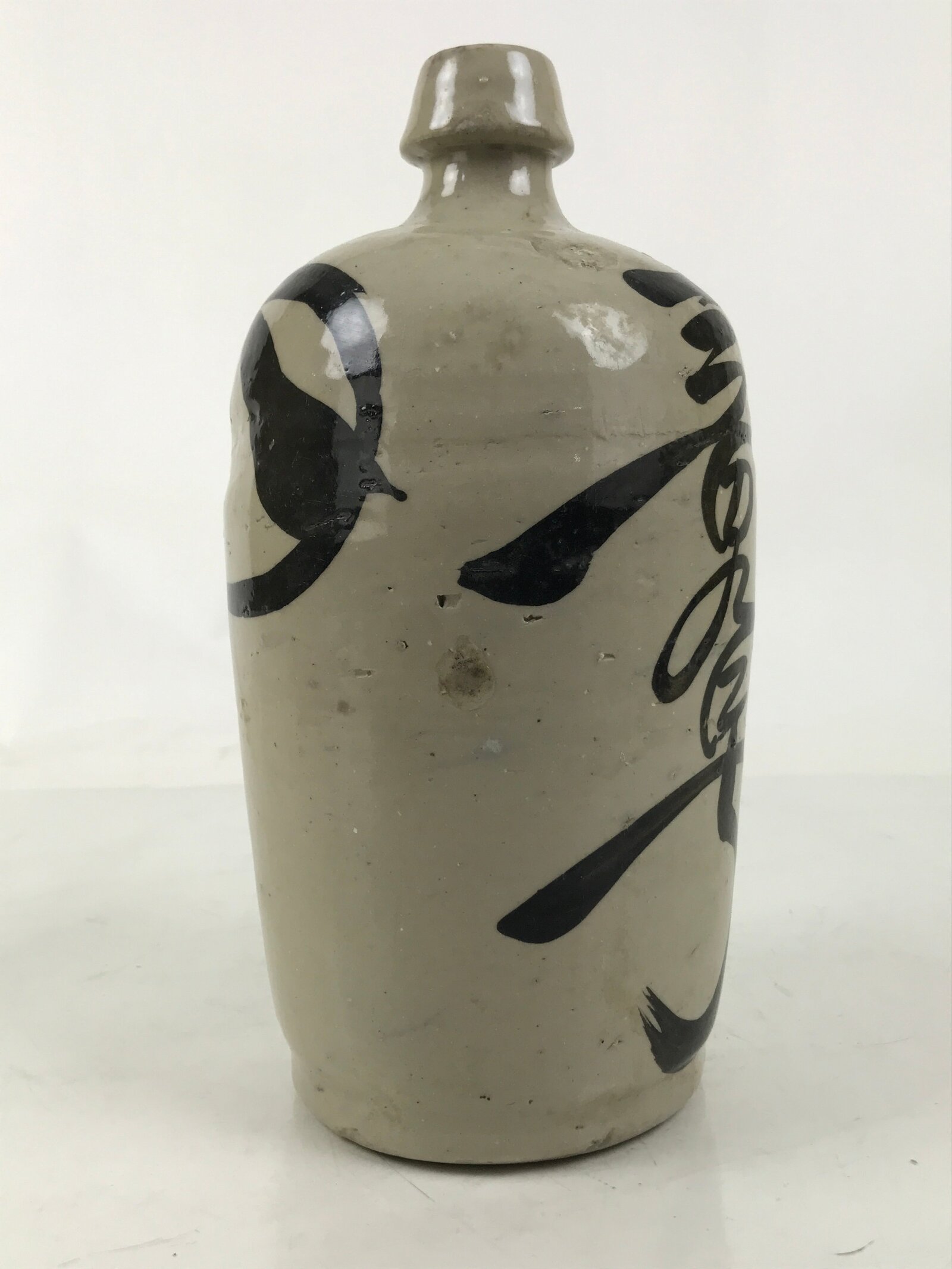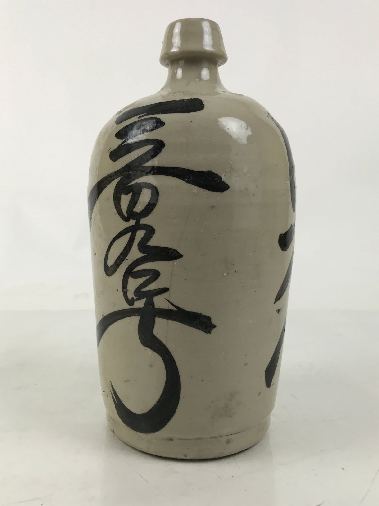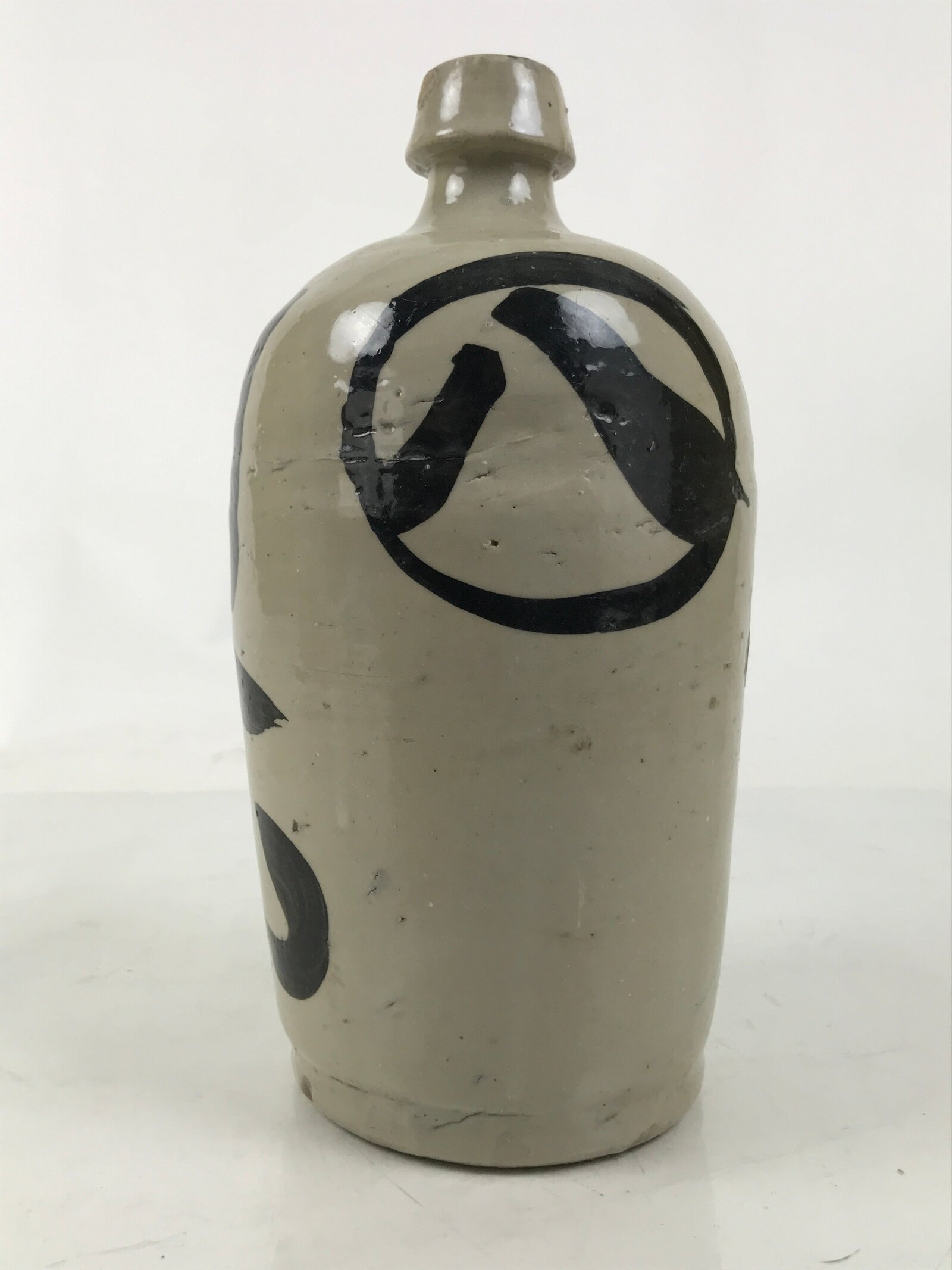 This is a vintage Japanese ceramic sake bottle. It is called a Kayoi-Tokkuri and is used to pour sake. The commuting sake bottle became popular as a rental container for liquor stores in the Edo period when sake began to be consumed on a daily basis. This gray bottle has black characters.