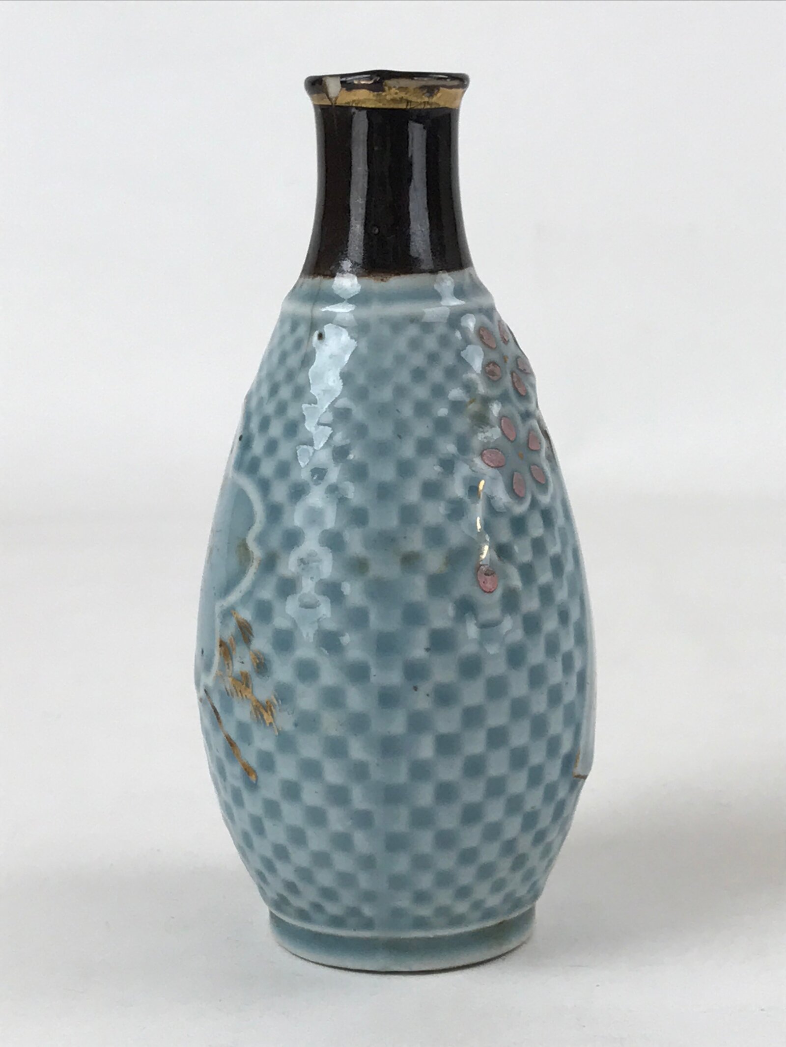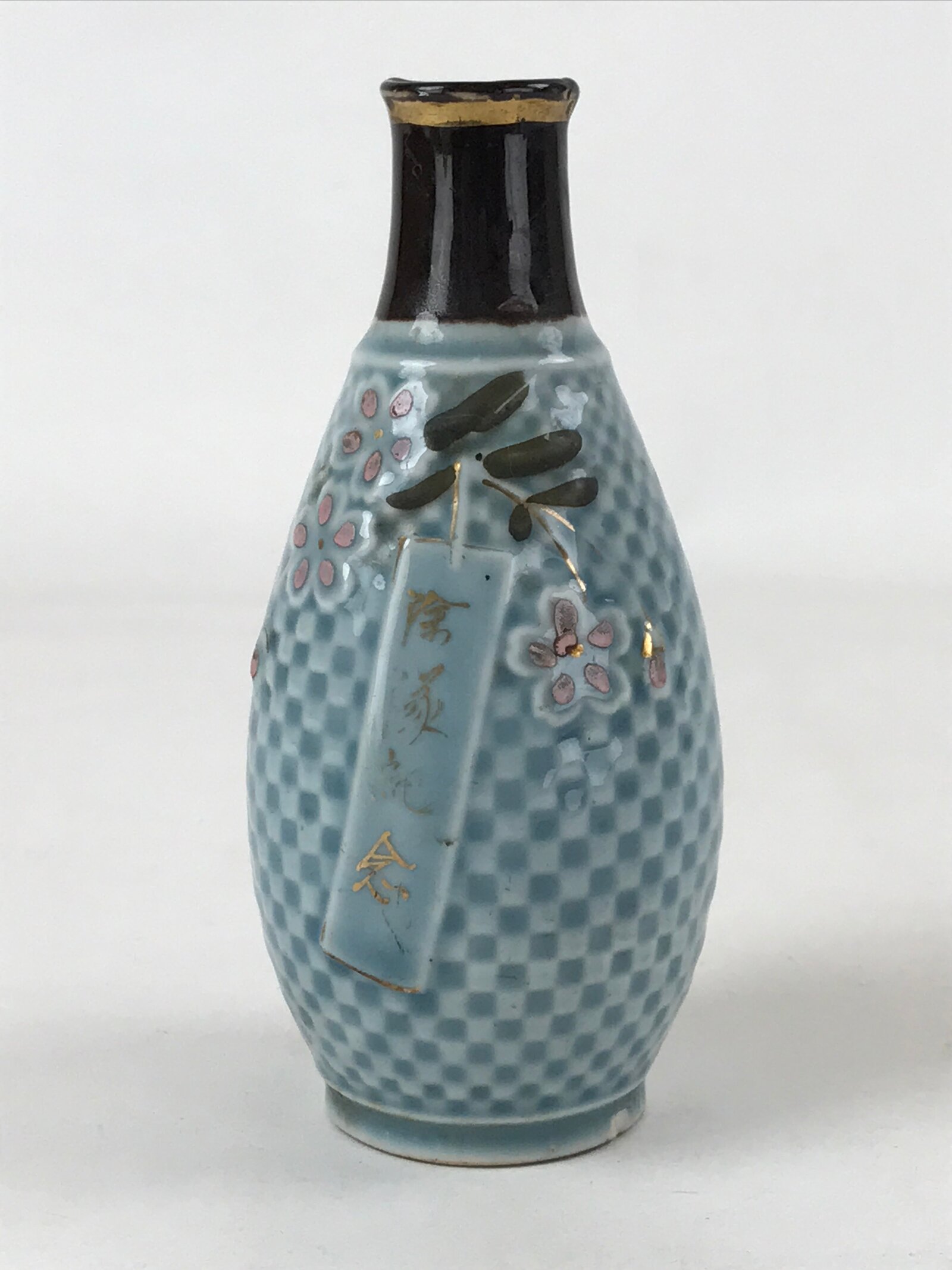 This is a Japanese vintage porcelain sake bottle or Tokkuri. This particular sake bottle is a military discharge commemorative item. It is a blue checkmate pattern with a dark brown neck and mouth. This sake bottle is adorned with a tanzaku strip of paper with inscriptions in gold color and a sakura cherry flower with gold inscriptions as well. It is signed on the bottom.
