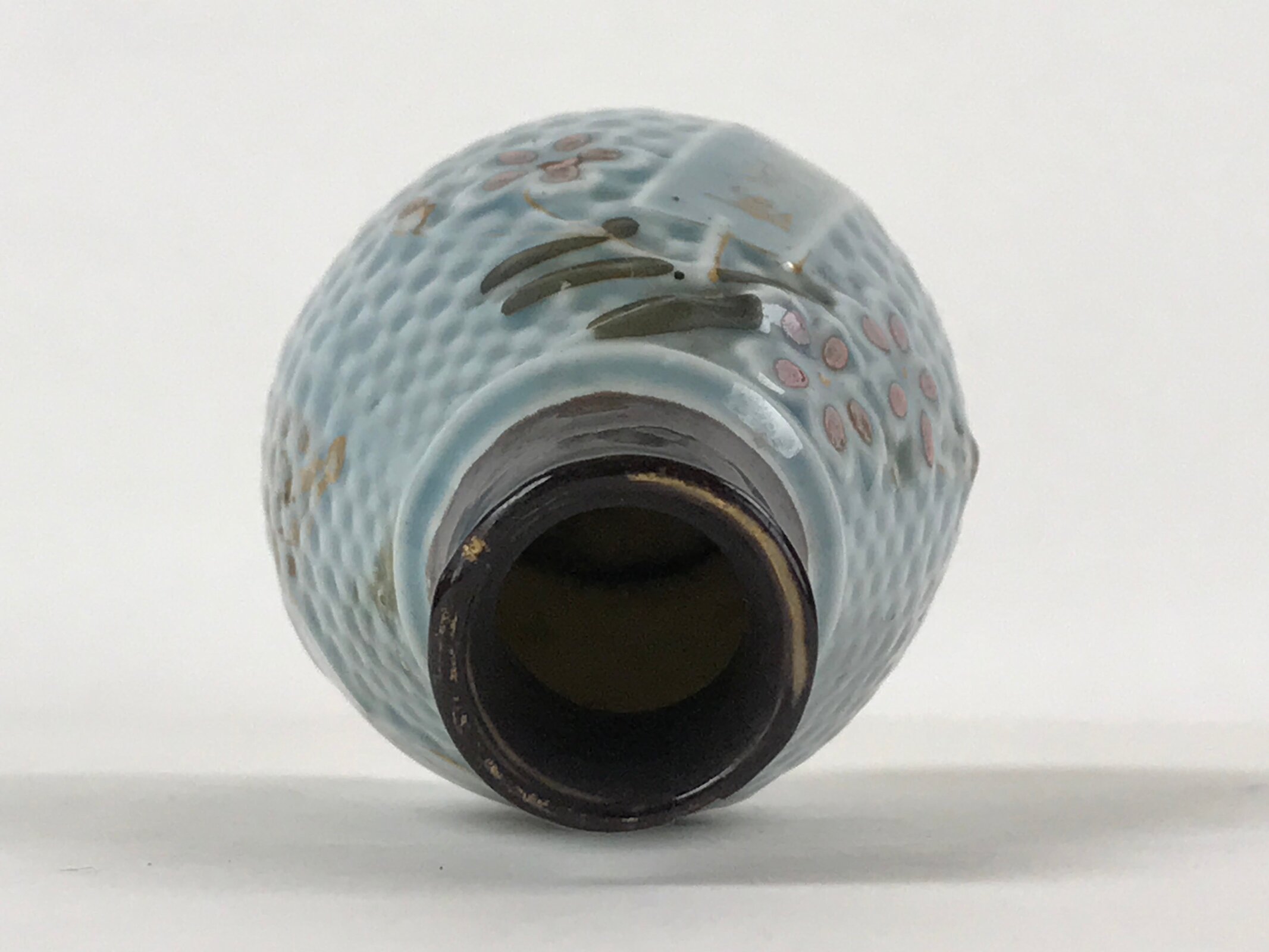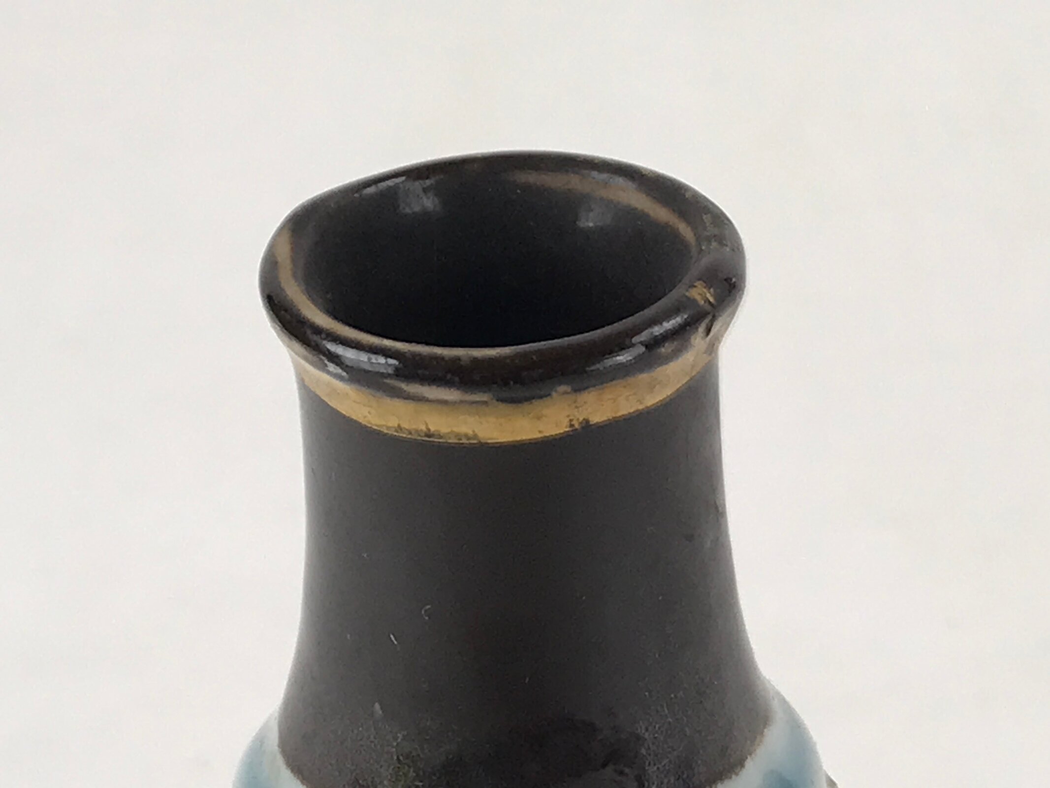 - Good condition considering its age. Chips (mouth, bottom). Cracks on mouth and neck. Marks. Golden inscriptions faded. Wear and tear due to age. Please see the photos carefully.