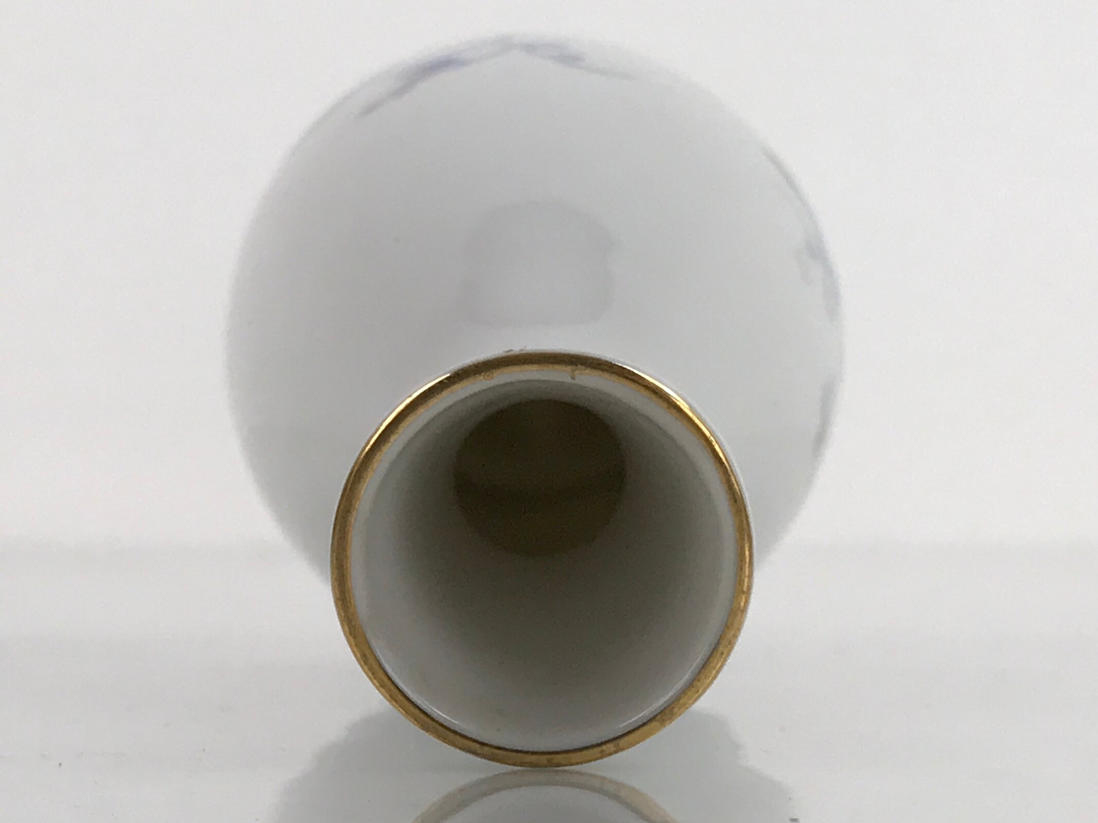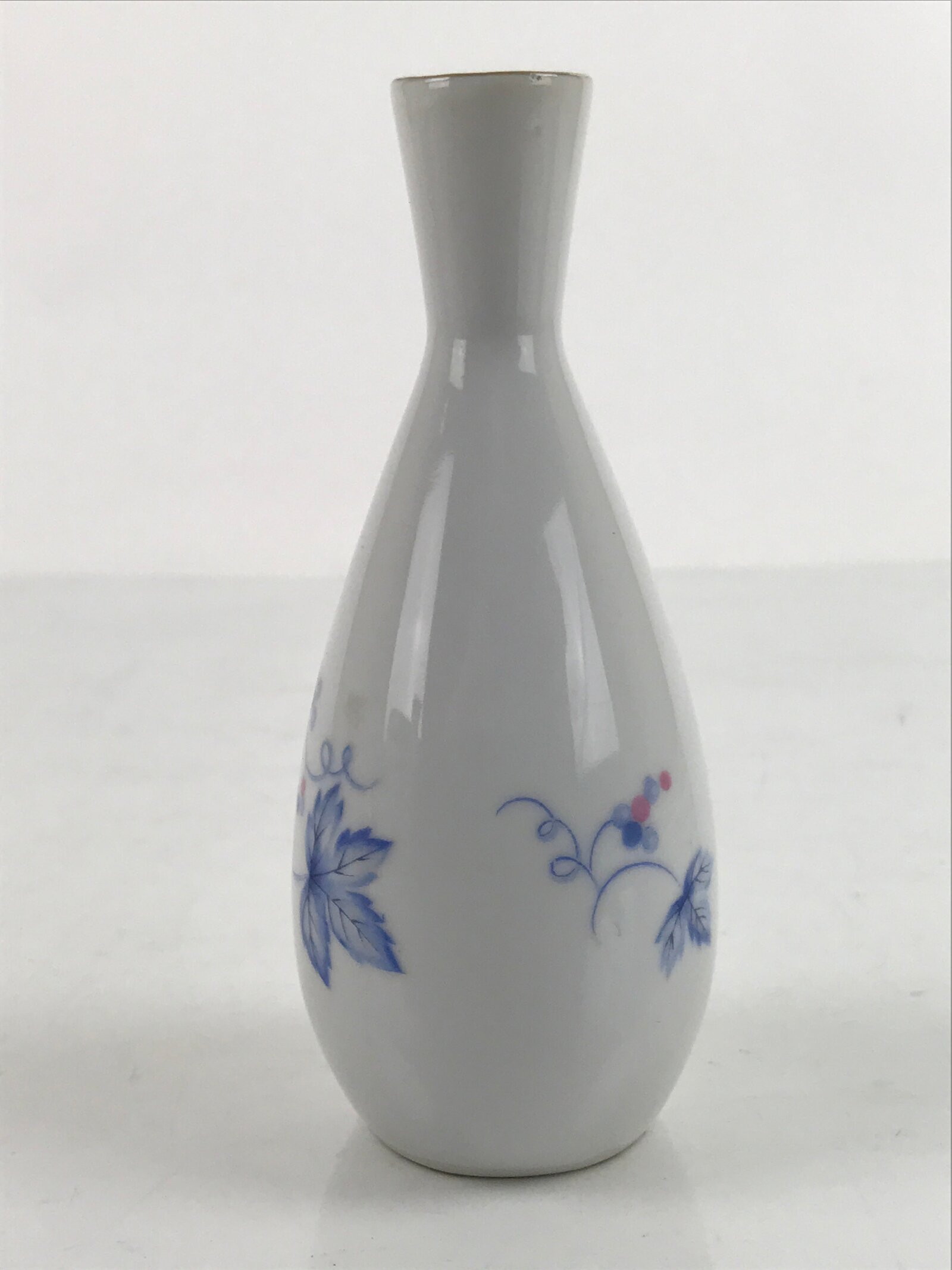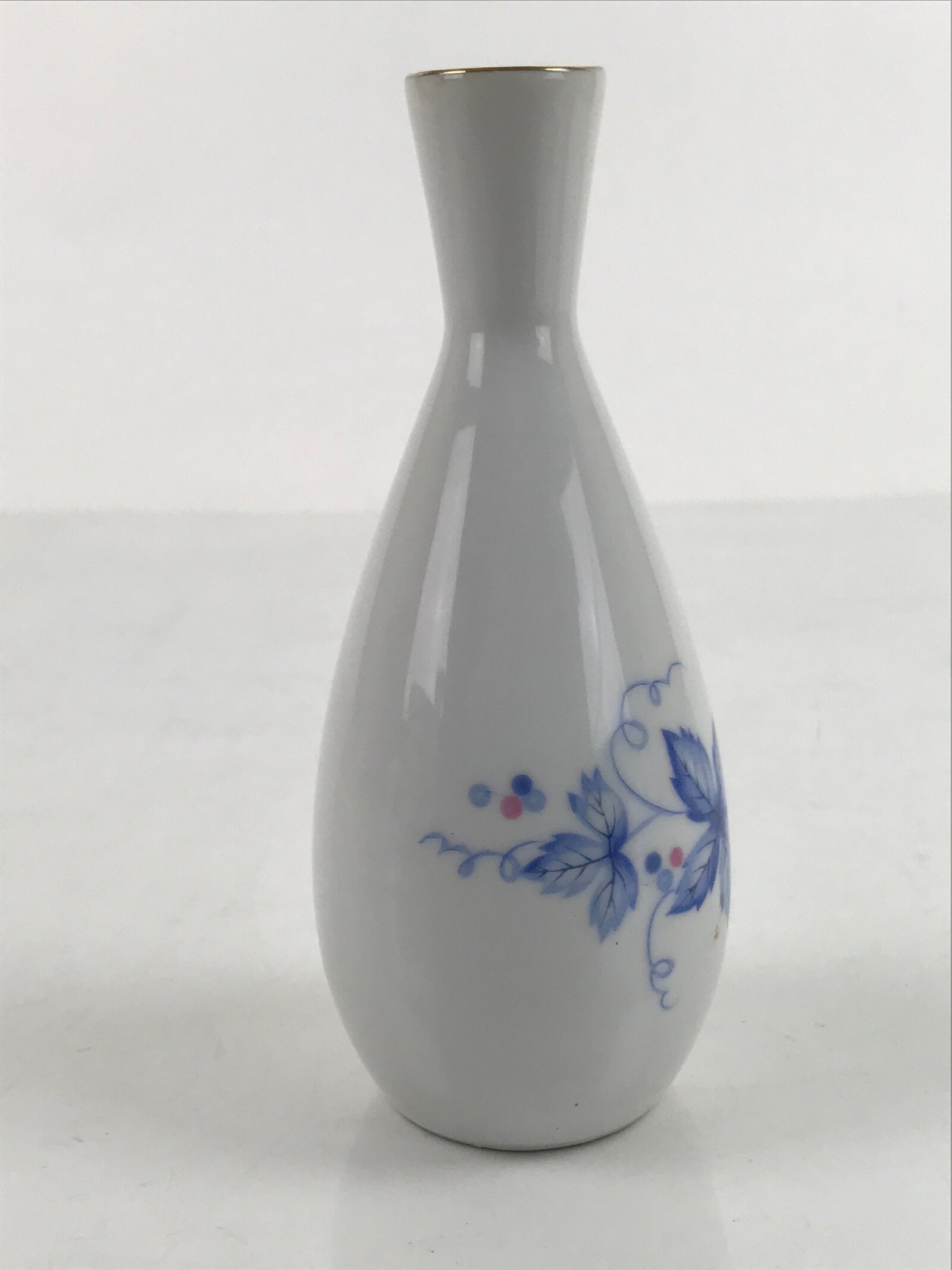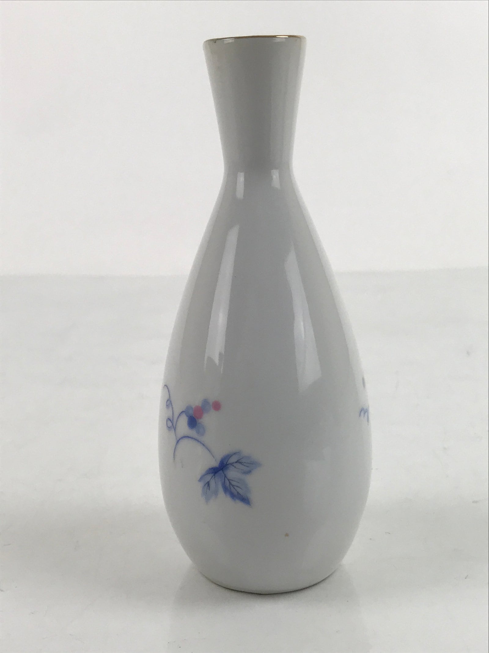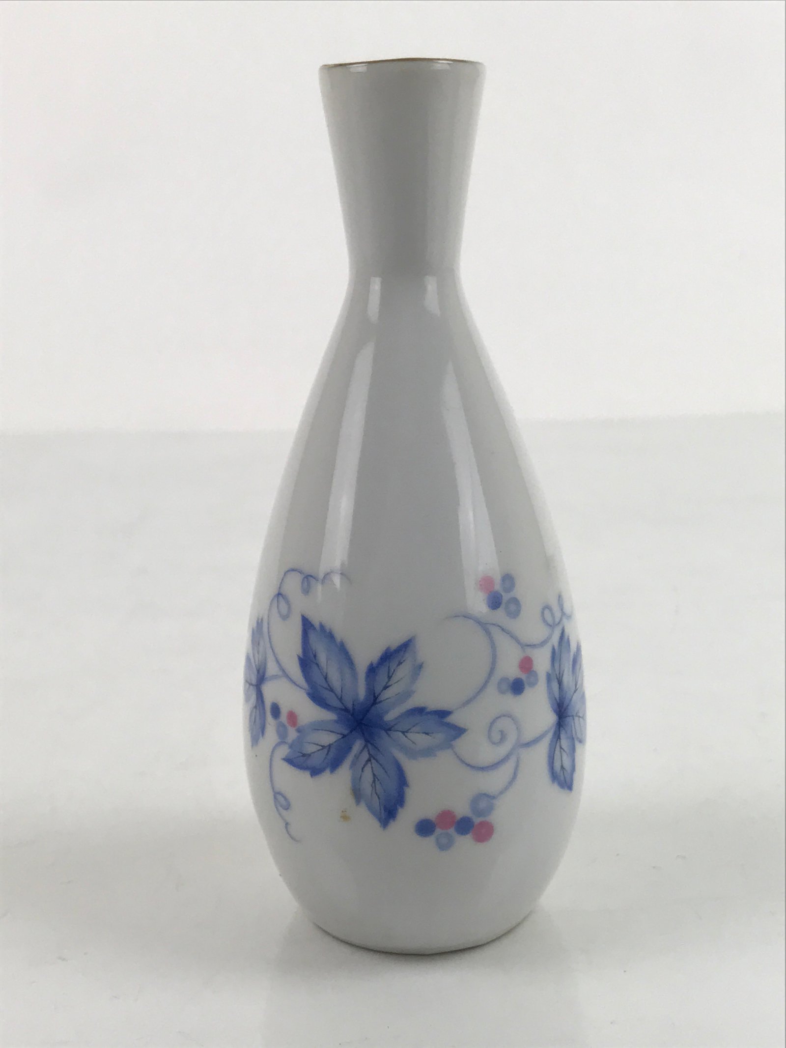 This is a Japanese vintage porcelain sake bottle or Tokkuri. This particular sake bottle is white with a gold rim and a blue and pink design of grapes with leaves and vines. It is a compact size with a generous volume (roughly ichi-go), making it easy to use daily for beverages or as a small flower vase.