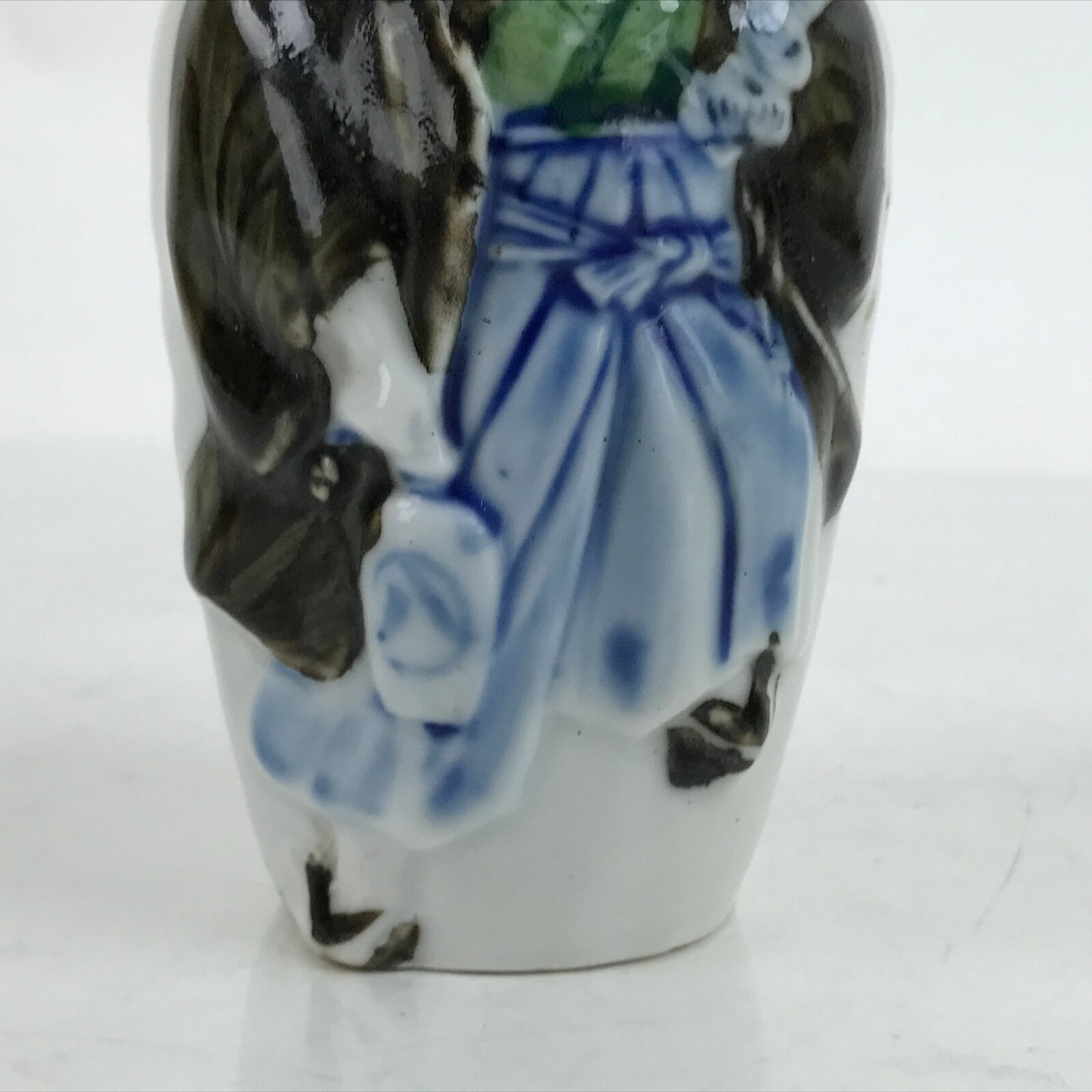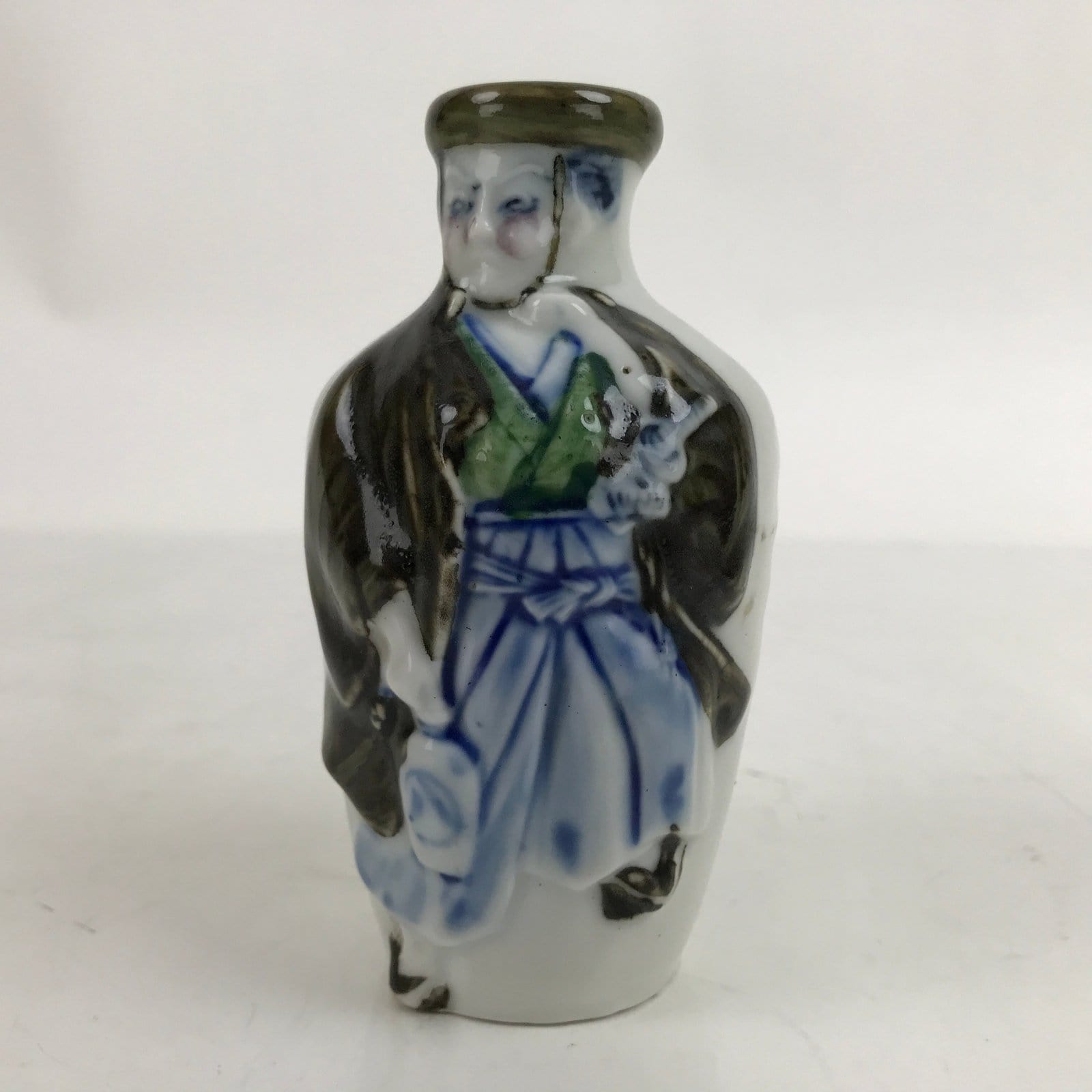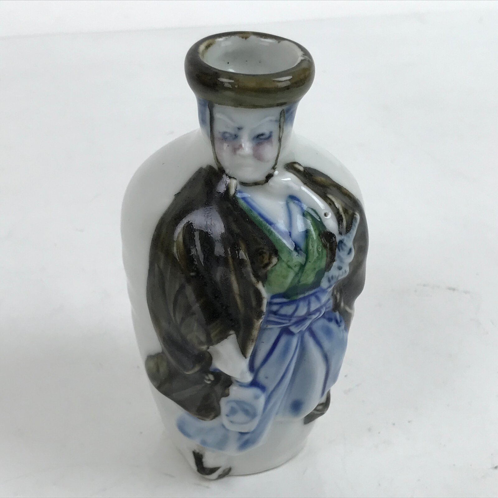 This is a Japanese vintage ceramic sake bottle or Tokkuri. This sake bottle features a 3D samurai wearing a blue and green kimono and holding a tokkuri bottle. On the back, there is a calligraphy. It is a compact size making it easy to use daily for beverages or as a small flower vase.