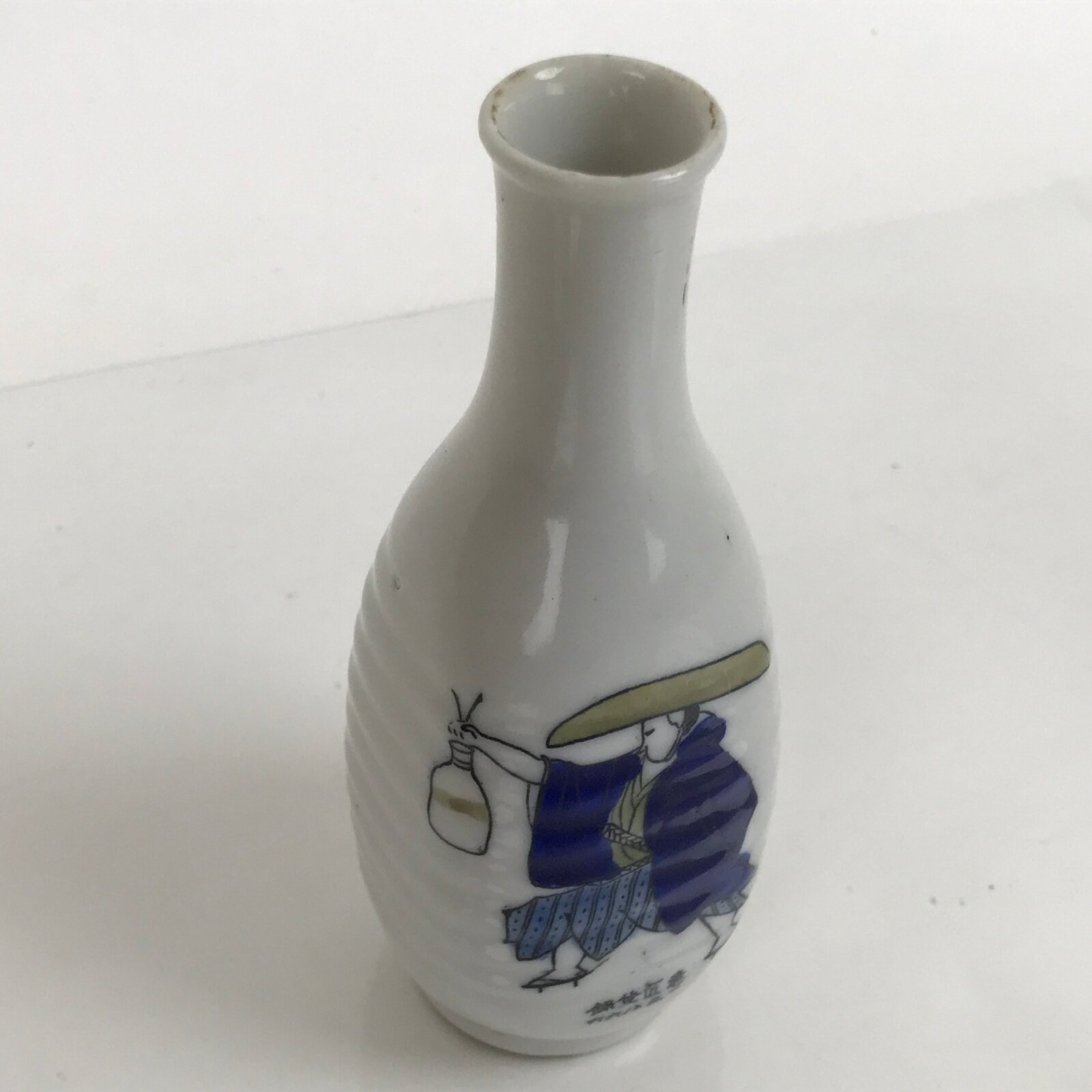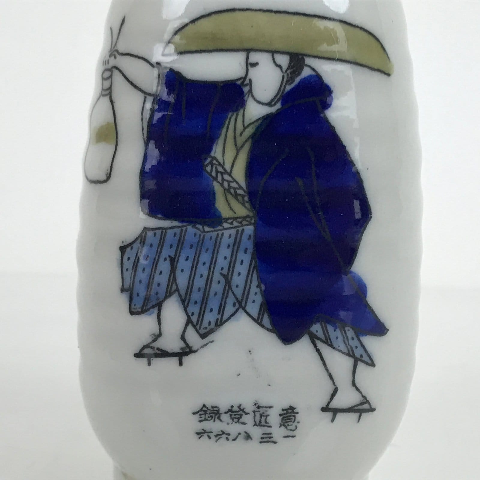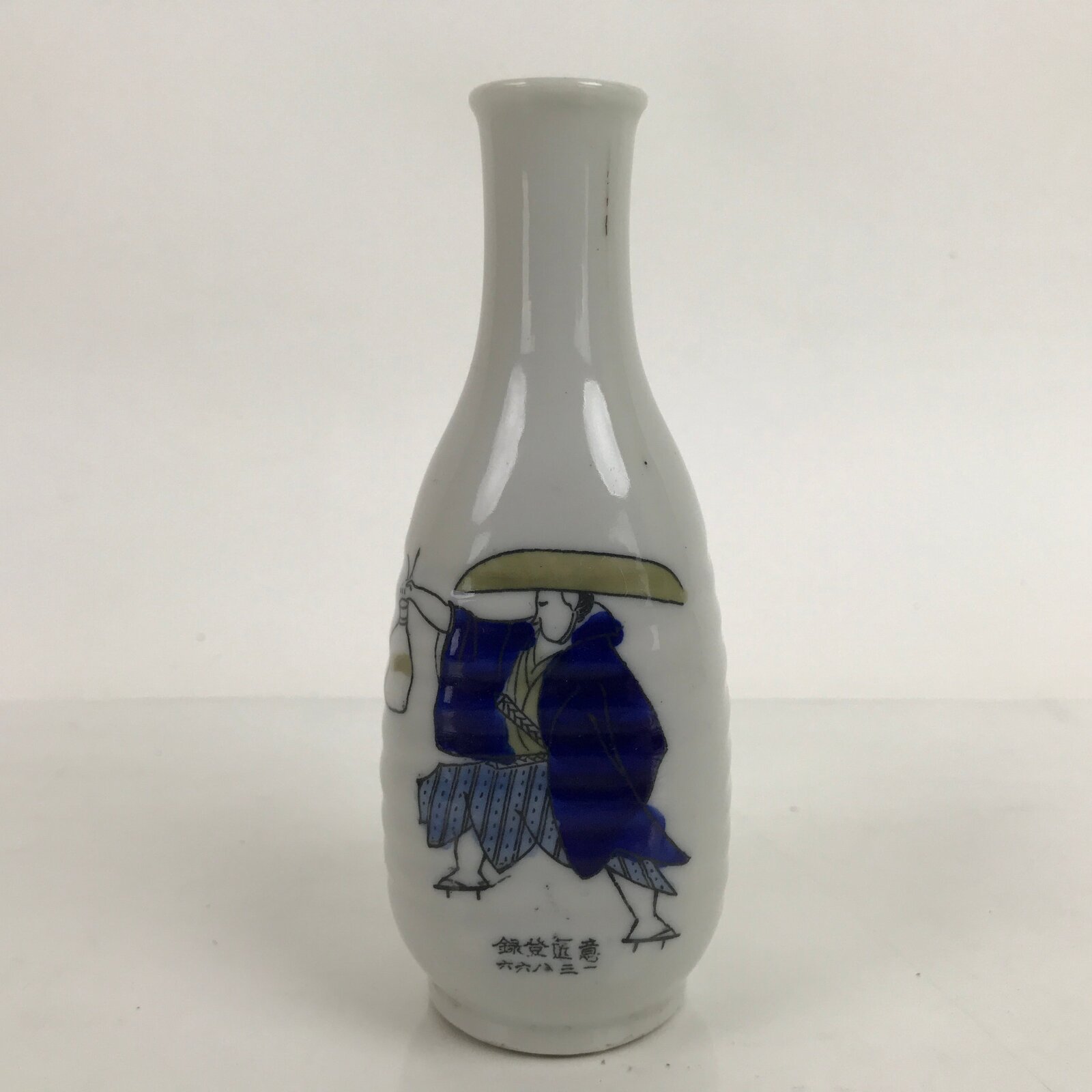 This is a Japanese vintage porcelain sake bottle or Tokkuri. This sake bottle is white with a design of a samurai wearing a blue and beige kimono and a big hat holding a tokkuri bottle. On the back, there is a calligraphy. It has a squared design and a wavy grip for easy use. It is a compact size making it easy to use daily for beverages or as a small flower vase.