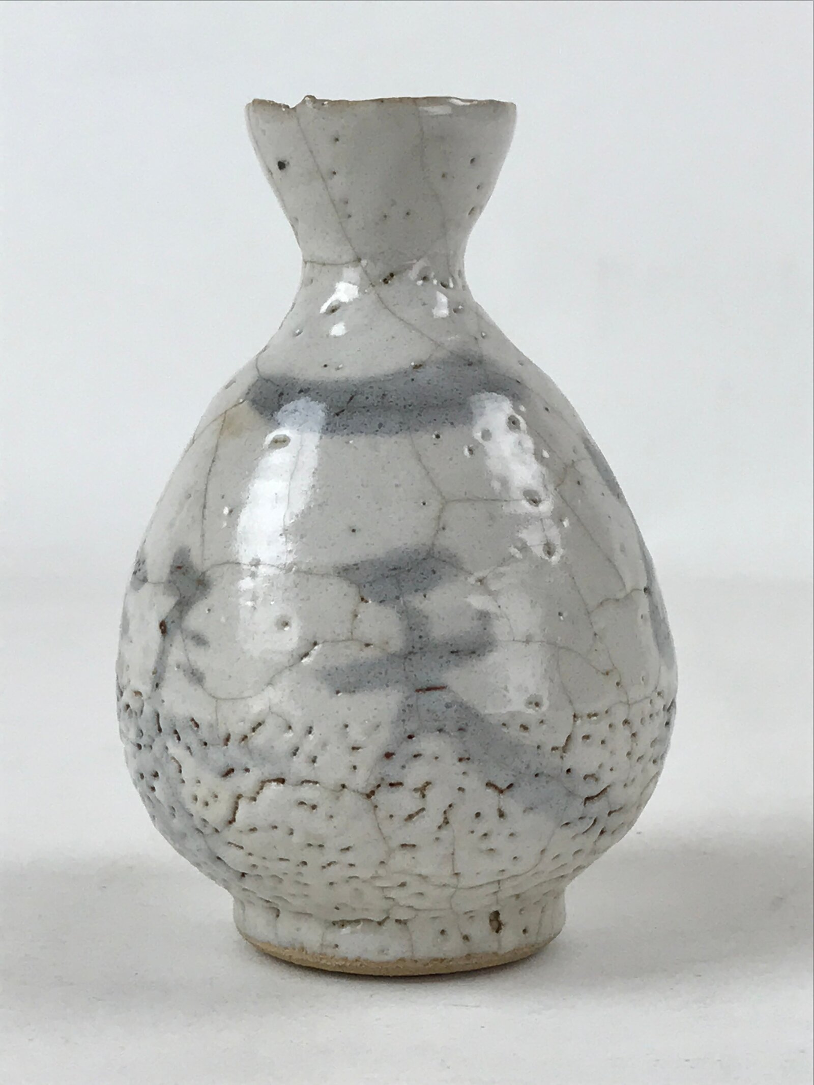 This is a Japanese vintage ceramic sake bottle or Tokkuri. This particular sake bottle has a white (light gray) body in a crackle glaze and light blue ideograms on top. This bottle is a compact size with a generous volume, easy to use daily.
