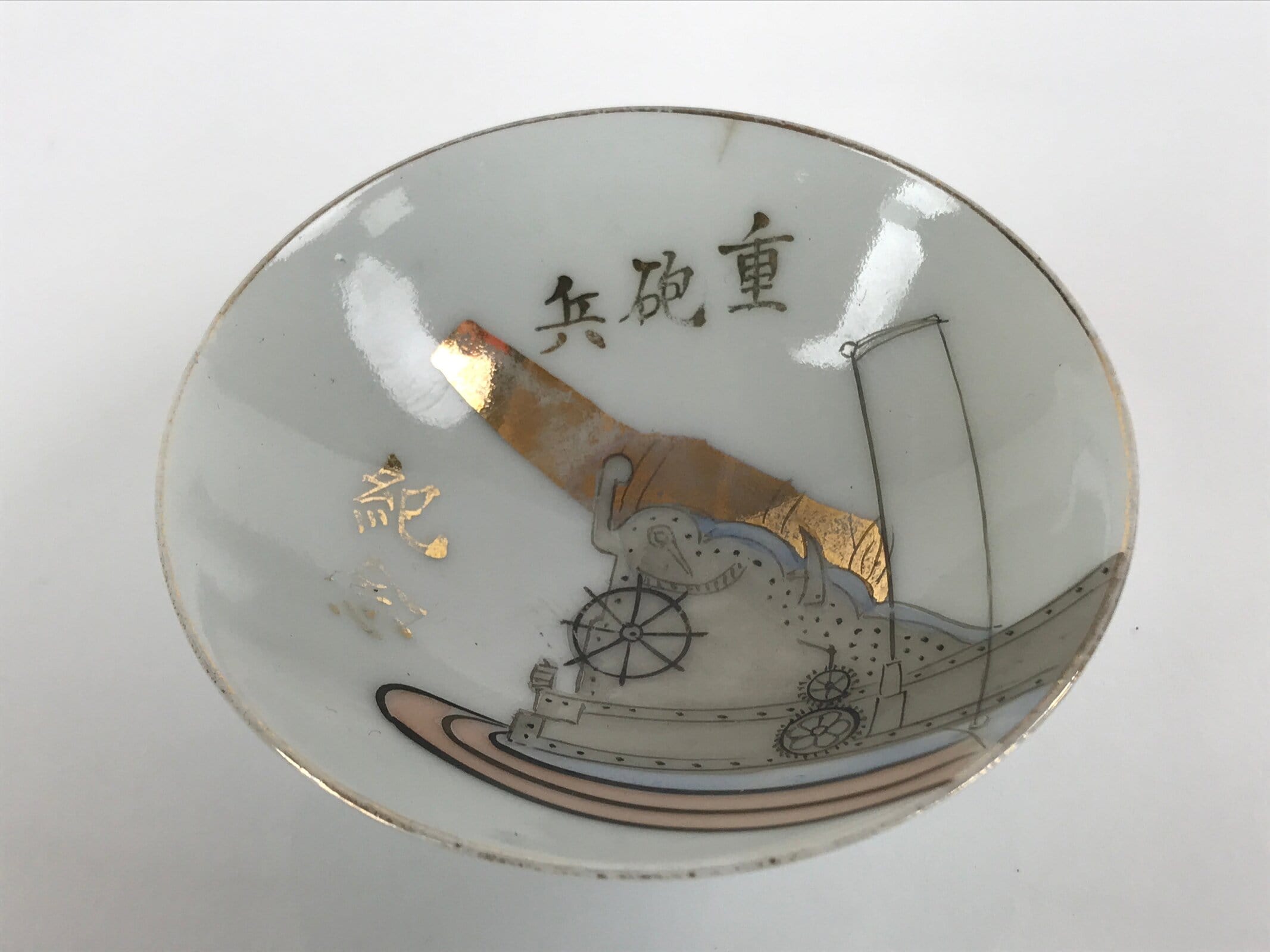 This is a vintage Japanese porcelain sake cup. It is a military service commemorative item. It has gold inscriptions on the inside, as well as a picture of a heavy cannon. This sakazuki cup has a rounded base.