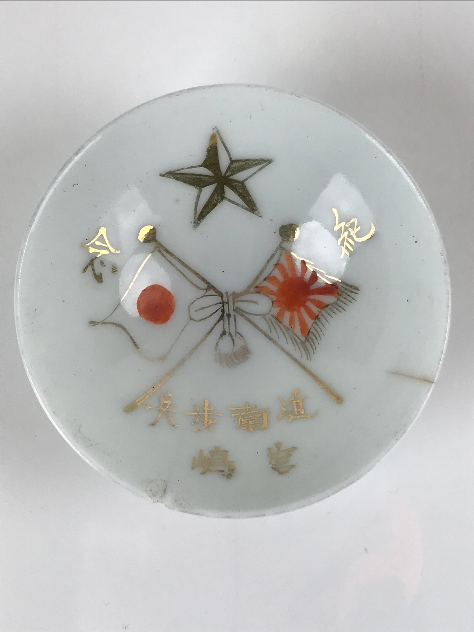 This is a vintage Japanese porcelain sake cup. It is a military service commemorative item. It has gold inscriptions on the inside, as well as a star and two crossed flags of the Japanese Empire. This sakazuki cup has a rounded base.