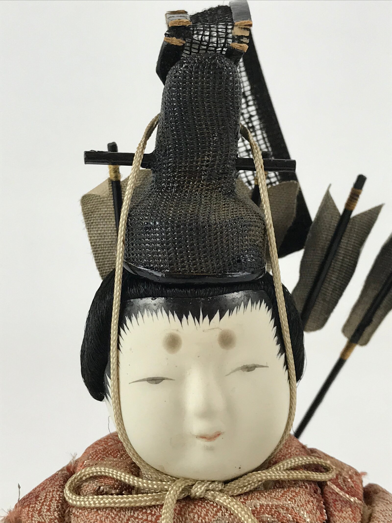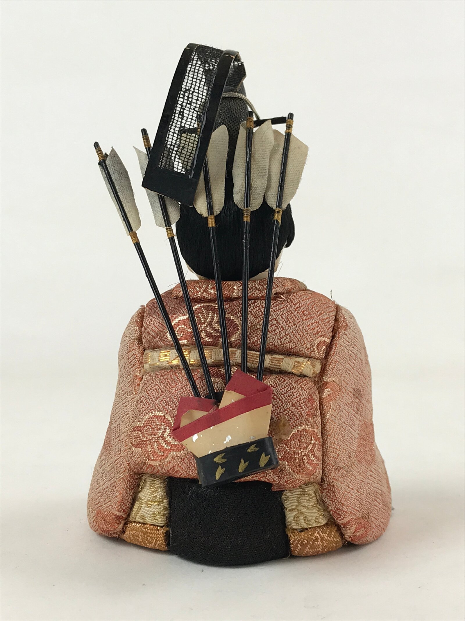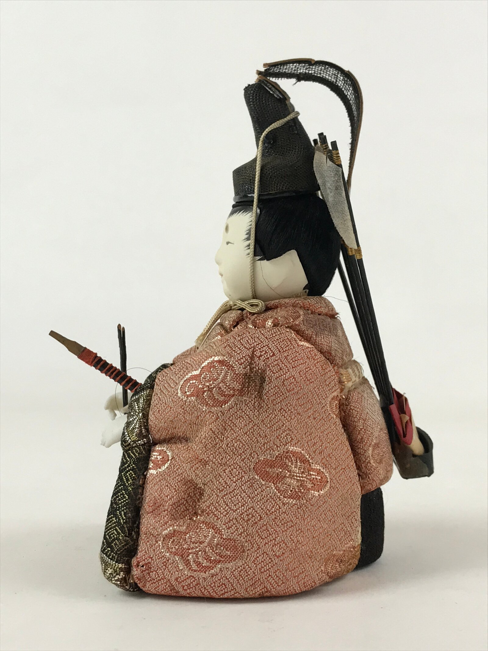 - Good condition. Bow is missing. Arrow on the front is broken and missing. Top of the hat (ken-ei) is torn on back side. Sword has been repaired with tape. Quiver on the back is a little bit loose. Some stains. Wear and tear due to age. Please see the photos carefully.
